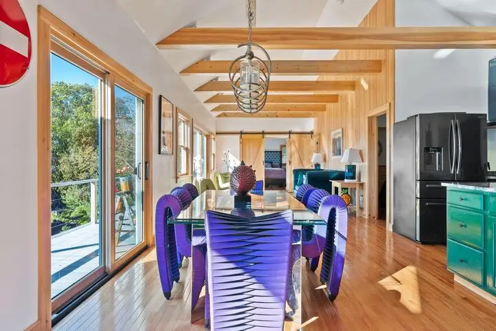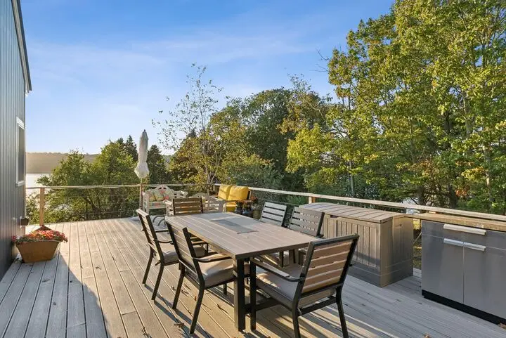There's a certain feeling that comes with quality, and you'll sense it the moment you arrive at 49 Cottage Road. This stunning riverfront retreat captures the essence of modern coastal living. Every space has been thoughtfully designed for comfort and beauty, creating a home that feels as much like a work of art as it does a place to unwind. Step inside to a light filled living area where stained glass reflections dance across the walls. The reclaimed wood gas fireplace anchors the space while expansive windows frame sweeping views of the lawn and river beyond. The open kitchen and dining area lead to a wraparound deck. A guest bath with distinctive tile connects to the upper level guest bedroom and cozy sitting area. The serene primary suite offers deck access and a spa-like bath with a bidet, towel warmer, and oversized shower. The lower level blends comfort and entertainment with a custom built bar featuring a sink, ice maker, and mini fridge. A stone surrounded gas fireplace with a reclaimed wood mantle adds warmth, and sliding doors open to the patio. This level also includes a guest bedroom with outdoor access, a full bath, laundry room, workshop, and versatile office or bonus room. Set on over four acres with 800 feet of water frontage, this property rests at the very end of a private road surrounded by peace, quiet, and serenity. Manicured grounds framed by rock walls include a private ramp and float, with 2-3 feet at low tide. Rebuilt in 2021, this home captures the best of coastal Maine living with sunrises over the water, passing seals and ships, and the calm beauty of riverfront life, all just minutes from Bath and Brunswick, and 45 minutes to Portland.