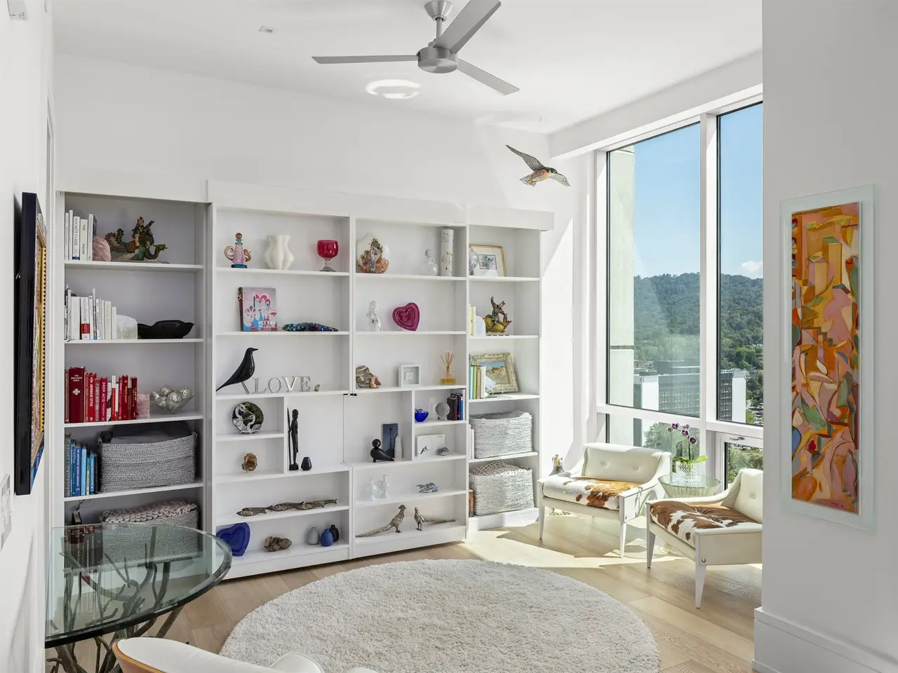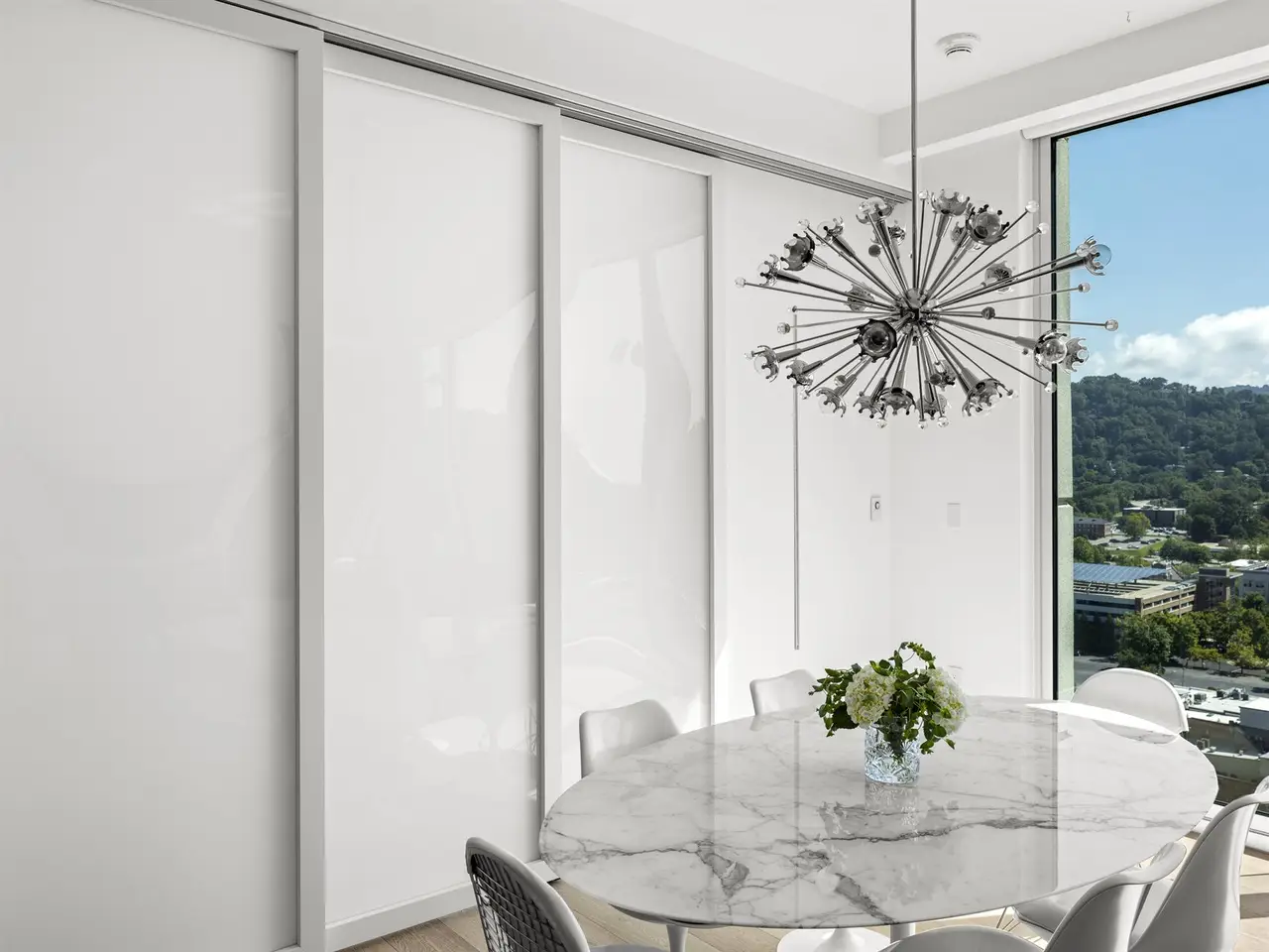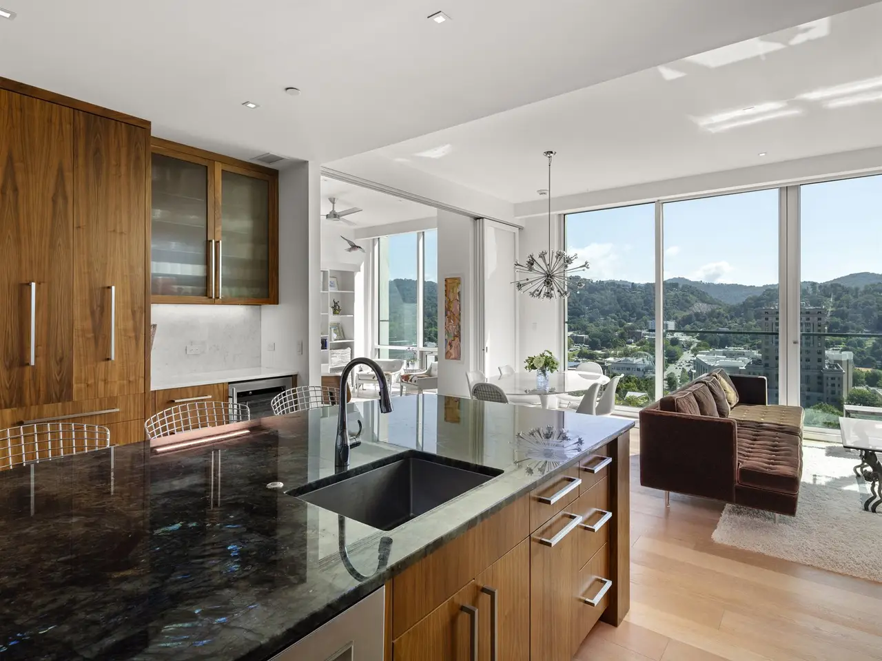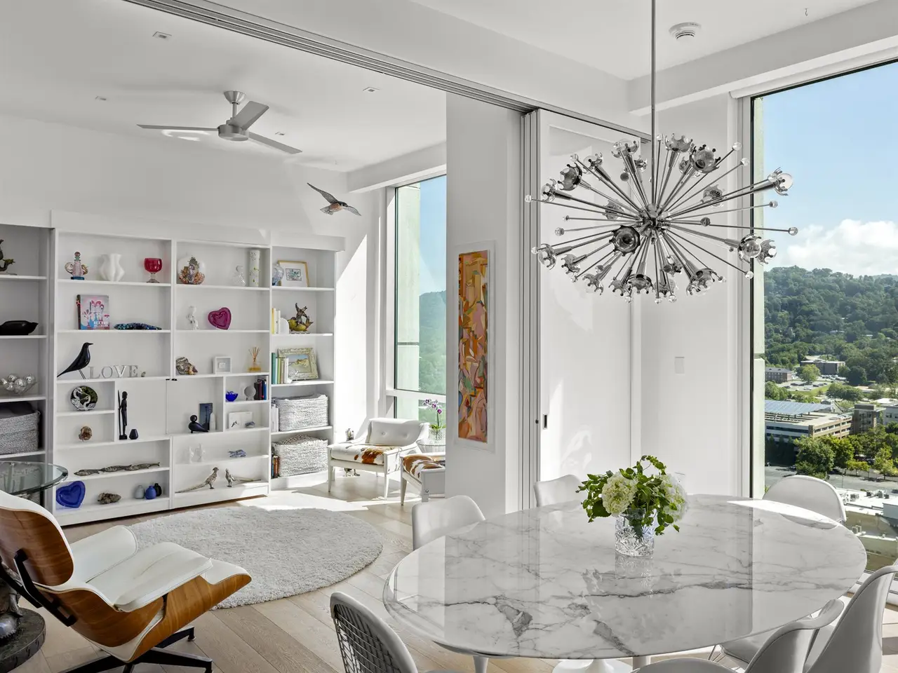 This fully customized contemporary residence in the prestigious Arras atop the Kimpton Hotel offers refined design and sweeping city and mountain views. Every inch of this residence has been thoughtfully designed with custom details. The kitchen showcases a Labradorite island and custom Walnut cabinetry by Flores Woodworking. A striking Robert Abbey Sputnik chandelier adds a modern glow, while integrated color-changing lights create the perfect ambiance at the touch of a wall-mounted control. Whether entertaining or unwinding, this home is a sophisticated sanctuary high above Asheville's vibrant streetscape. Arras residents enjoy an unmatched amenity package, including fine dining in the Arras Wine Cellar, Bargello's Mediterranean fare and more. Additional building features include a 24-hour fitness center and private massage room. Excellent security with multiple keyed access points, room service availability, and a pet-friendly policy make life here as convenient as it is luxurious.