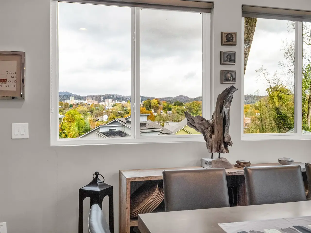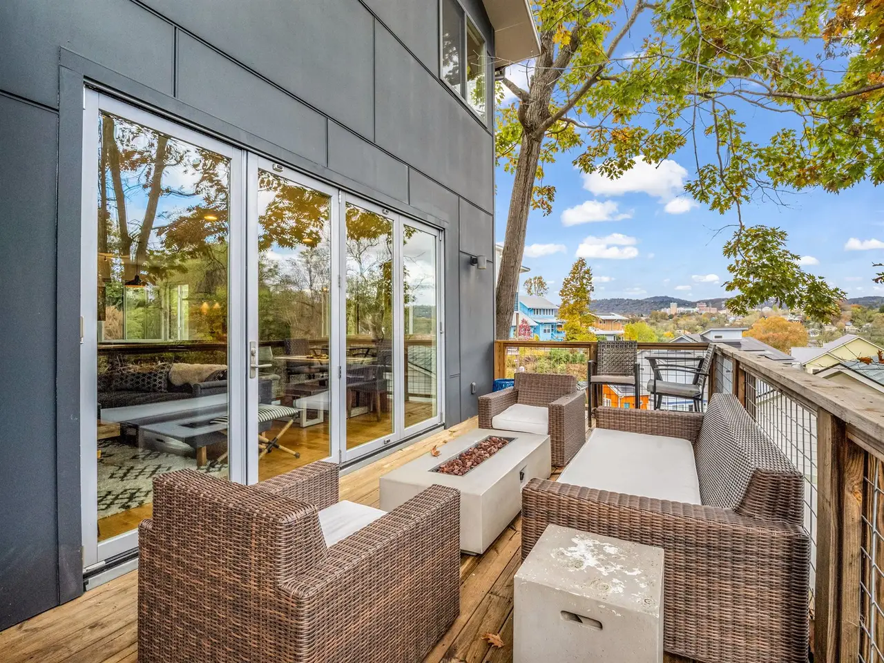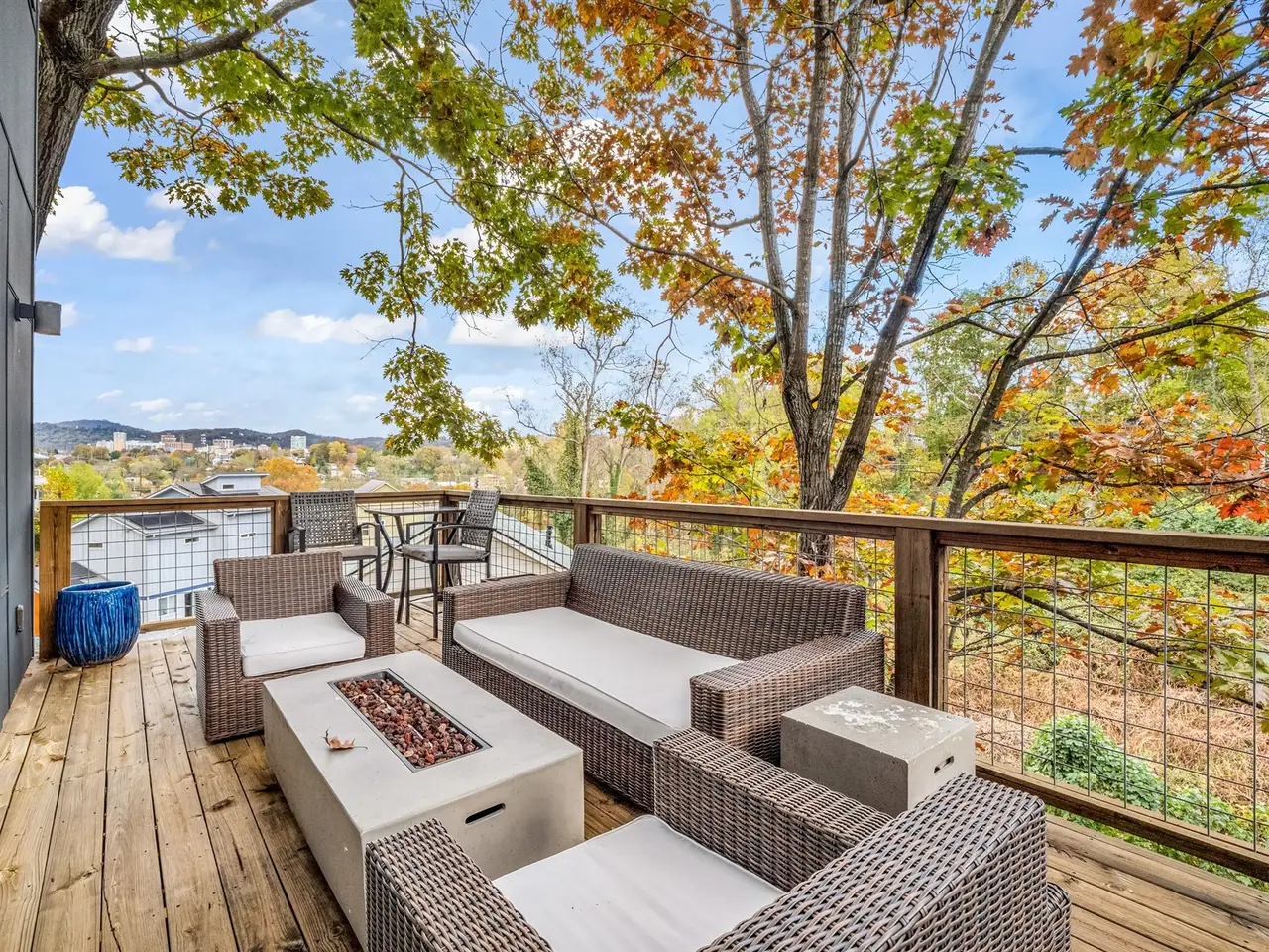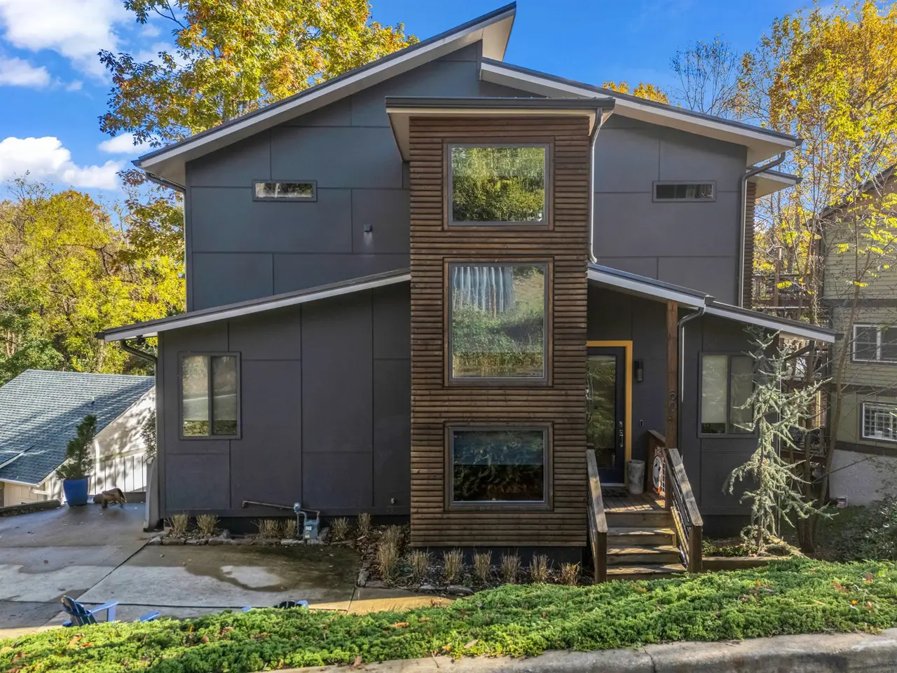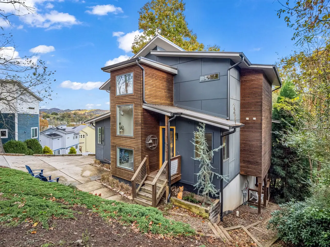 Incredible modern home in Asheville's River Arts District! Enjoy the best of Asheville living just a short walk to New Belgium Brewing! This is an ideal home for year-round living for buyers wanting minimal maintenance and yard upkeep. It's also perfect as a second/vacation home, as it has 3 primary suites (including one on the main level), making it just right for larger gatherings or extended family! The open floorplan and main level deck is perfect for entertaining or just enjoying a peaceful evening at home. From the living room, dining area, and decks, you can see the downtown Asheville skyline and the mountains beyond. The upper level has 2 massive primary suites with walk-in closets and beautiful bathrooms, as well as an office nook. The lower level has 2 more bedrooms, a bonus/TV room, full bath, and an unfinished space for storage (great for bikes, kayaks, and seasonal decor). The lower deck offers a second outdoor living area, and also has a hot tub! This quality built home has a Superior Wall precast concrete foundation, upgraded finishes throughout, and a location that can't be beat! Some furnishings negotiable.