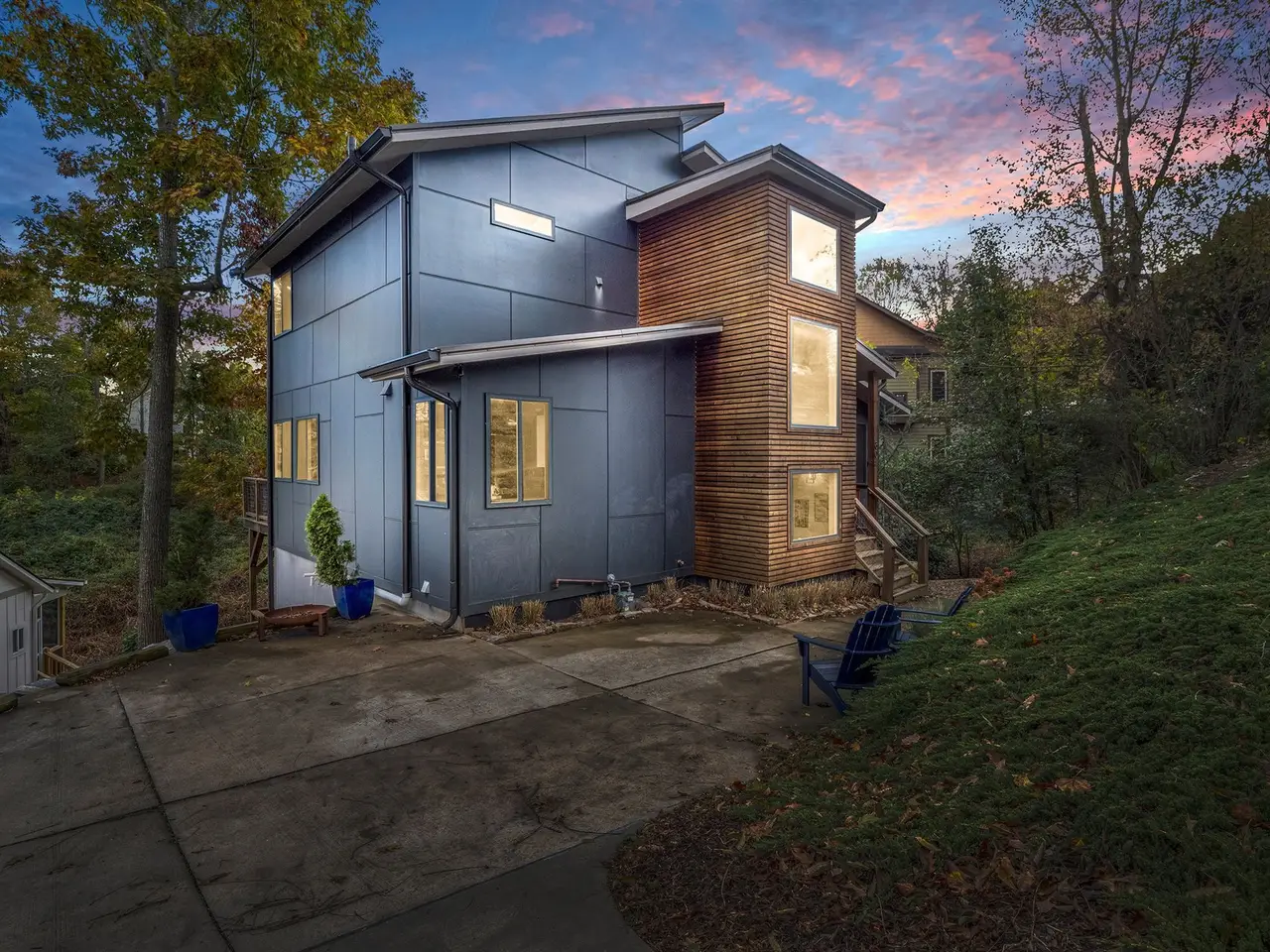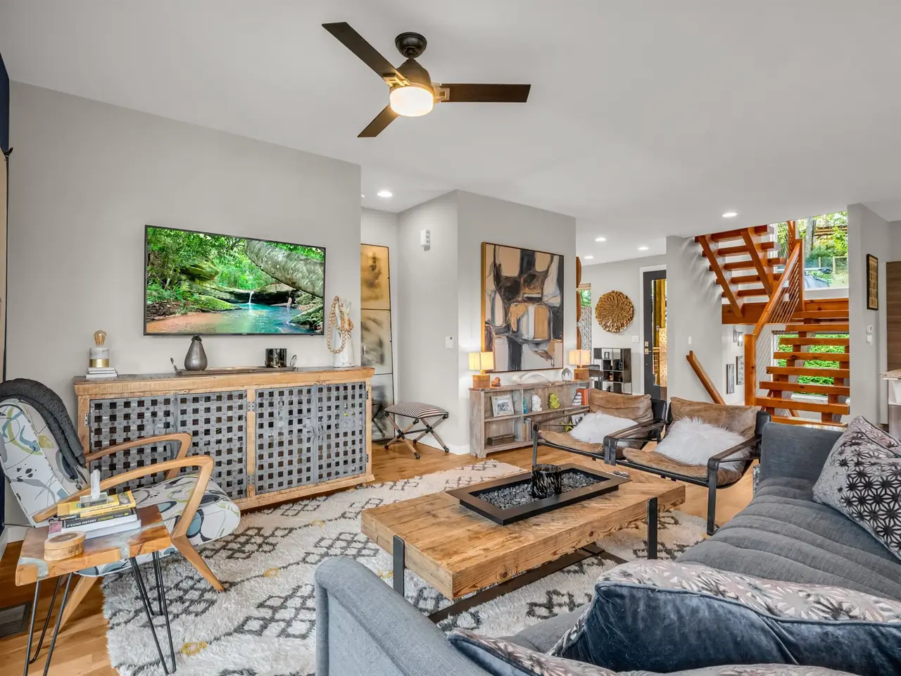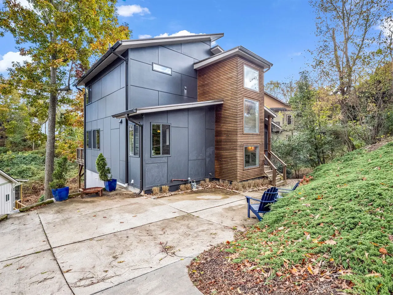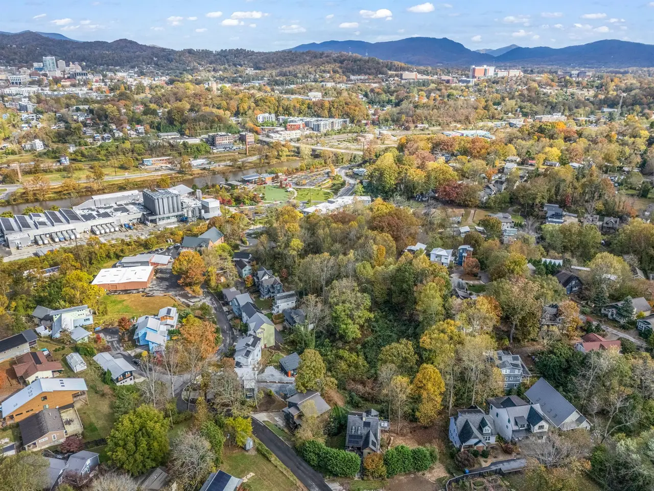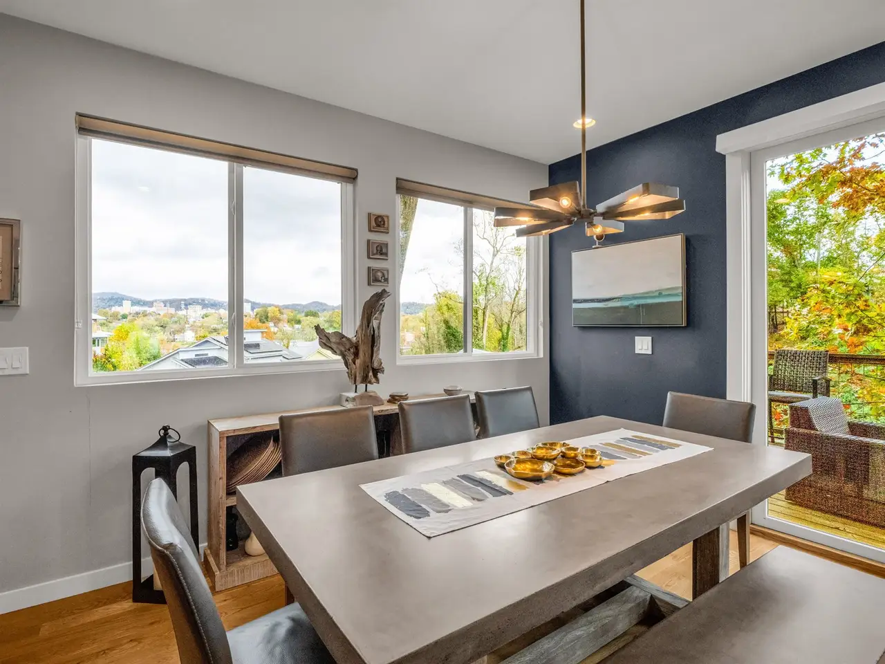 Incredible modern home in Asheville's River Arts District! Enjoy the best of Asheville living just a short walk to New Belgium Brewing! This is an ideal home for year-round living for buyers wanting minimal maintenance and yard upkeep. It's also perfect as a second/vacation home, as it has 3 primary suites (including one on the main level), making it just right for larger gatherings or extended family! The open floorplan and main level deck is perfect for entertaining or just enjoying a peaceful evening at home. From the living room, dining area, and decks, you can see the downtown Asheville skyline and the mountains beyond. The upper level has 2 massive primary suites with walk-in closets and beautiful bathrooms, as well as an office nook. The lower level has 2 more bedrooms, a bonus/TV room, full bath, and an unfinished space for storage (great for bikes, kayaks, and seasonal decor). The lower deck offers a second outdoor living area, and also has a hot tub! This quality built home has a Superior Wall precast concrete foundation, upgraded finishes throughout, and a location that can't be beat! Some furnishings negotiable.