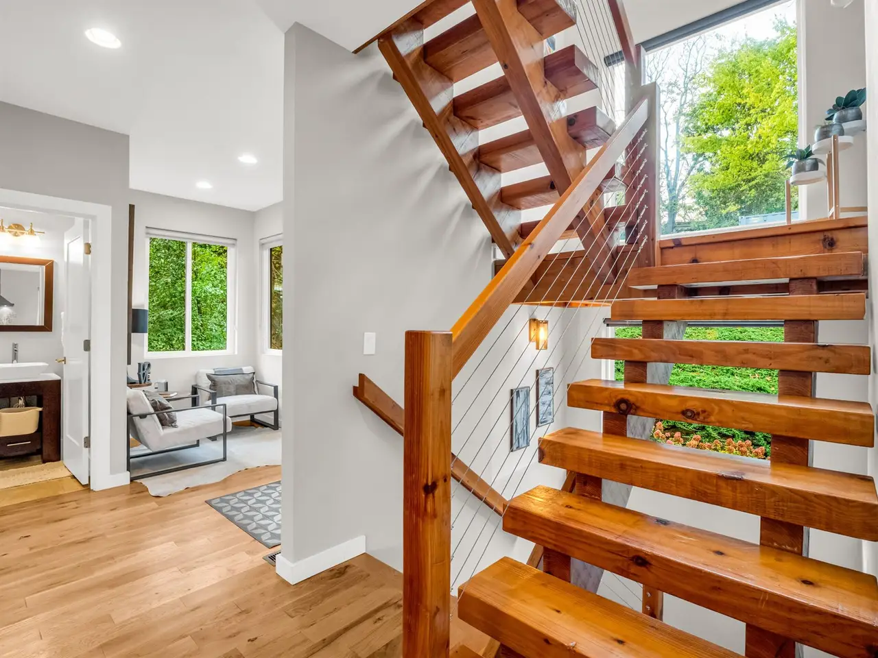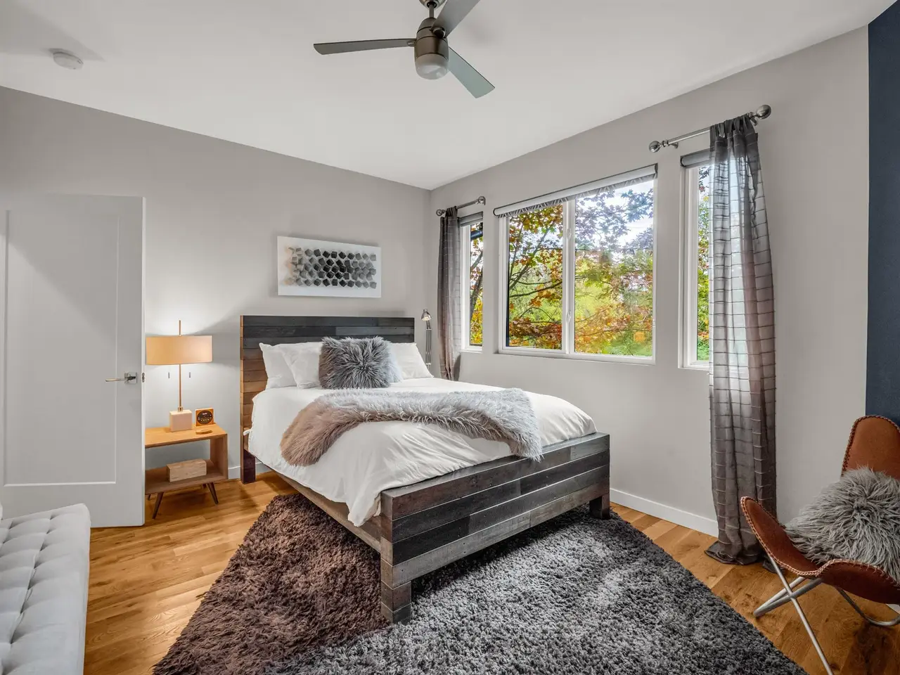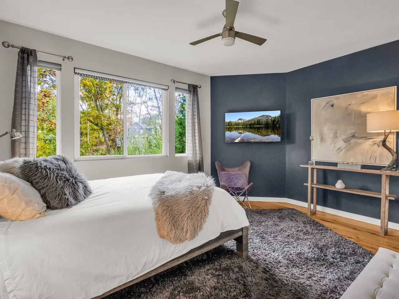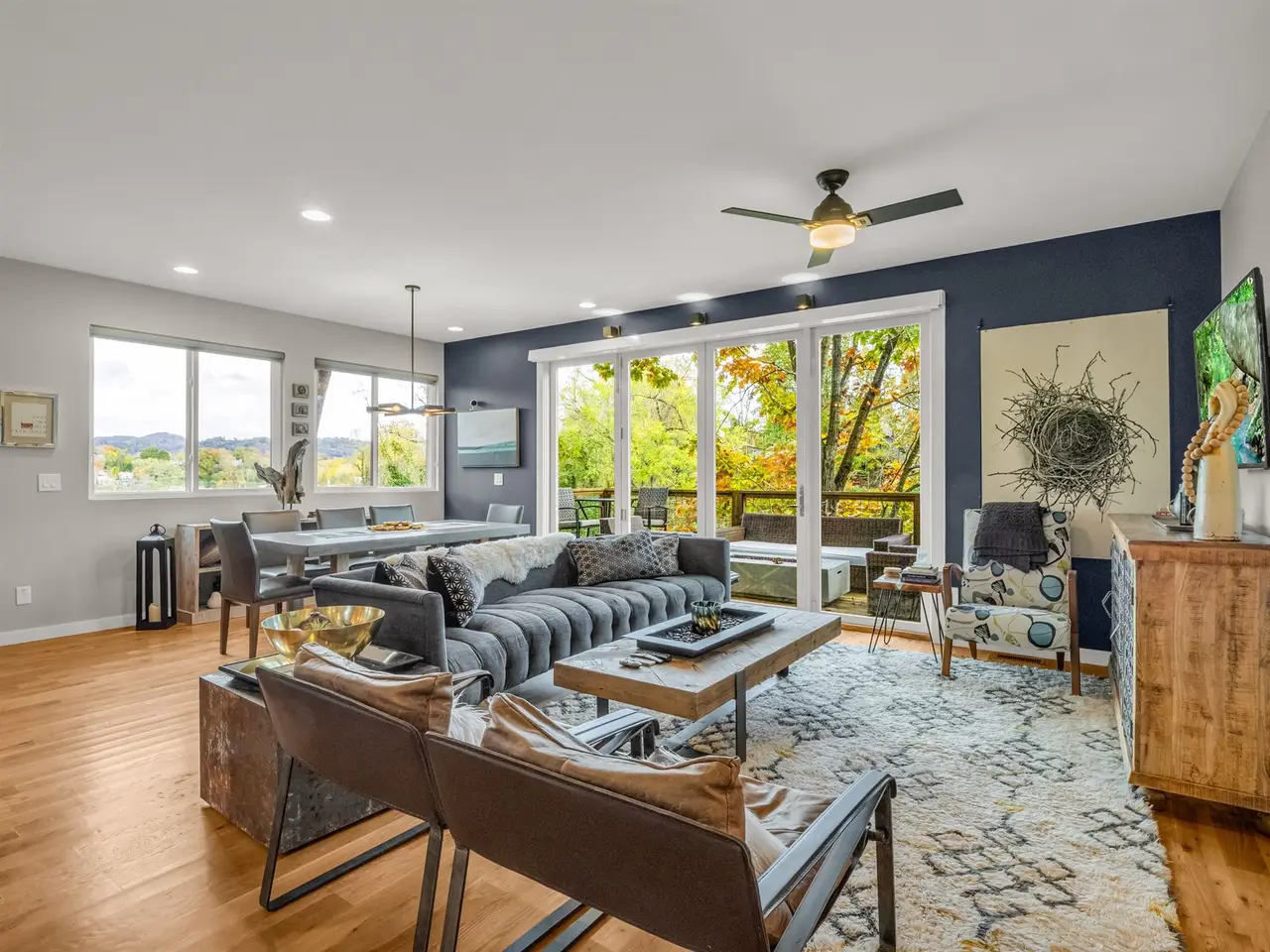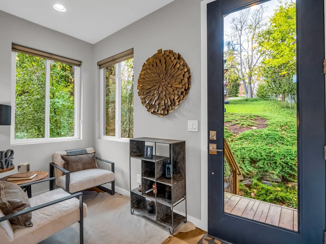 Incredible modern home in Asheville's River Arts District! Enjoy the best of Asheville living just a short walk to New Belgium Brewing! This is an ideal home for year-round living for buyers wanting minimal maintenance and yard upkeep. It's also perfect as a second/vacation home, as it has 3 primary suites (including one on the main level), making it just right for larger gatherings or extended family! The open floorplan and main level deck is perfect for entertaining or just enjoying a peaceful evening at home. From the living room, dining area, and decks, you can see the downtown Asheville skyline and the mountains beyond. The upper level has 2 massive primary suites with walk-in closets and beautiful bathrooms, as well as an office nook. The lower level has 2 more bedrooms, a bonus/TV room, full bath, and an unfinished space for storage (great for bikes, kayaks, and seasonal decor). The lower deck offers a second outdoor living area, and also has a hot tub! This quality built home has a Superior Wall precast concrete foundation, upgraded finishes throughout, and a location that can't be beat! Some furnishings negotiable.