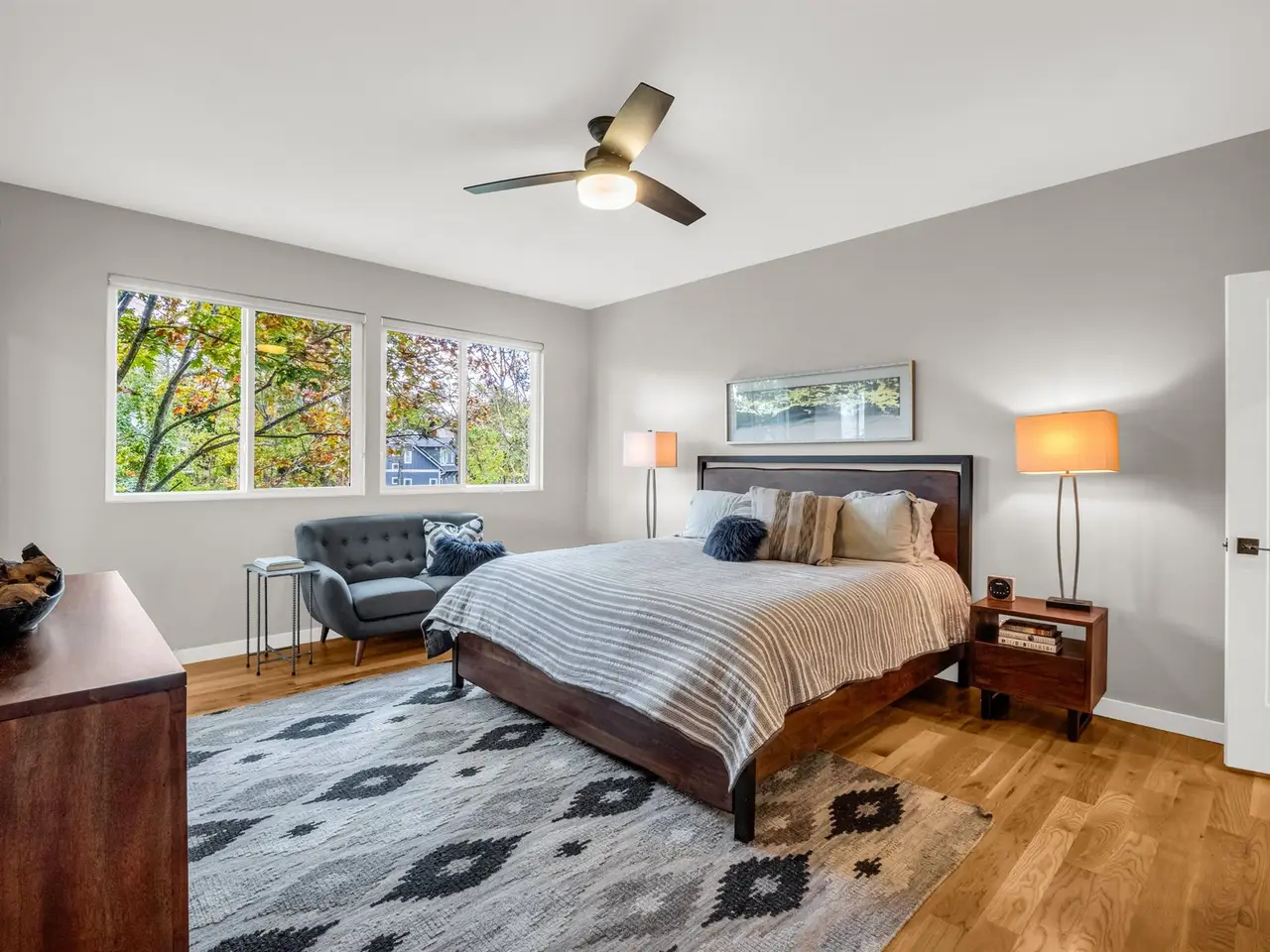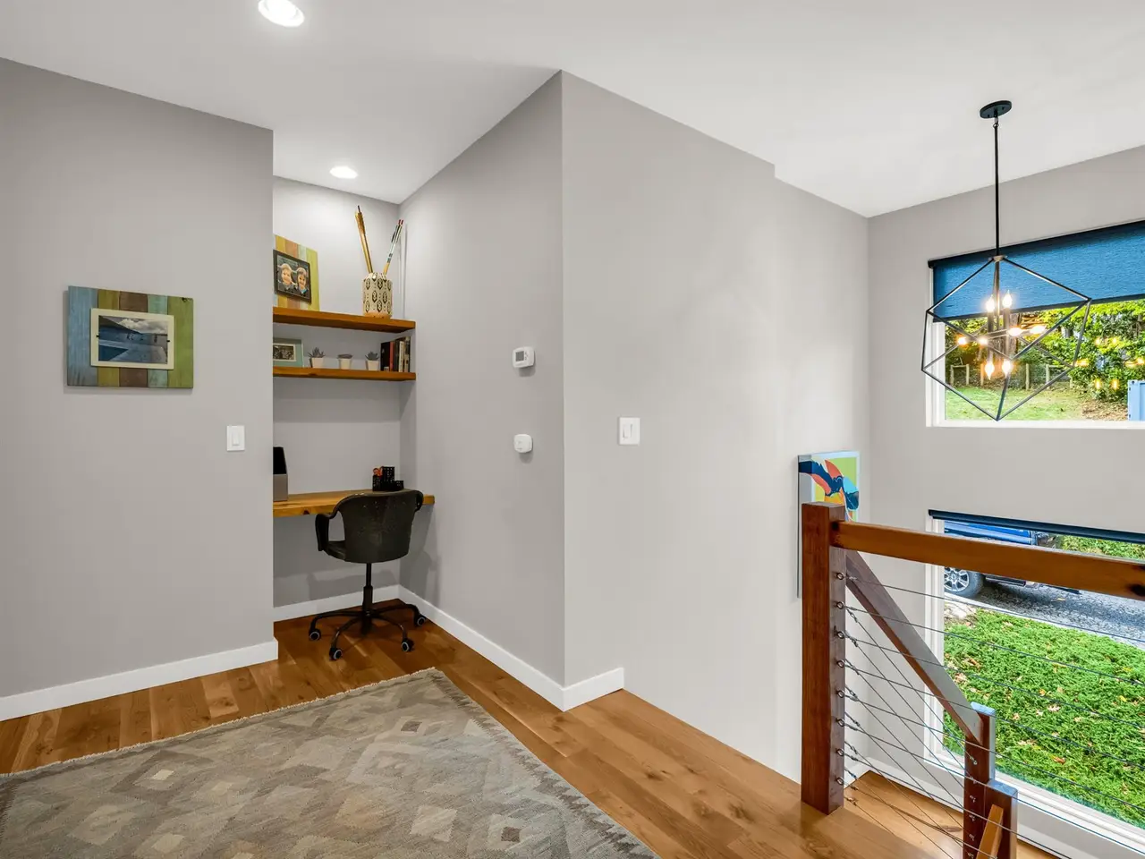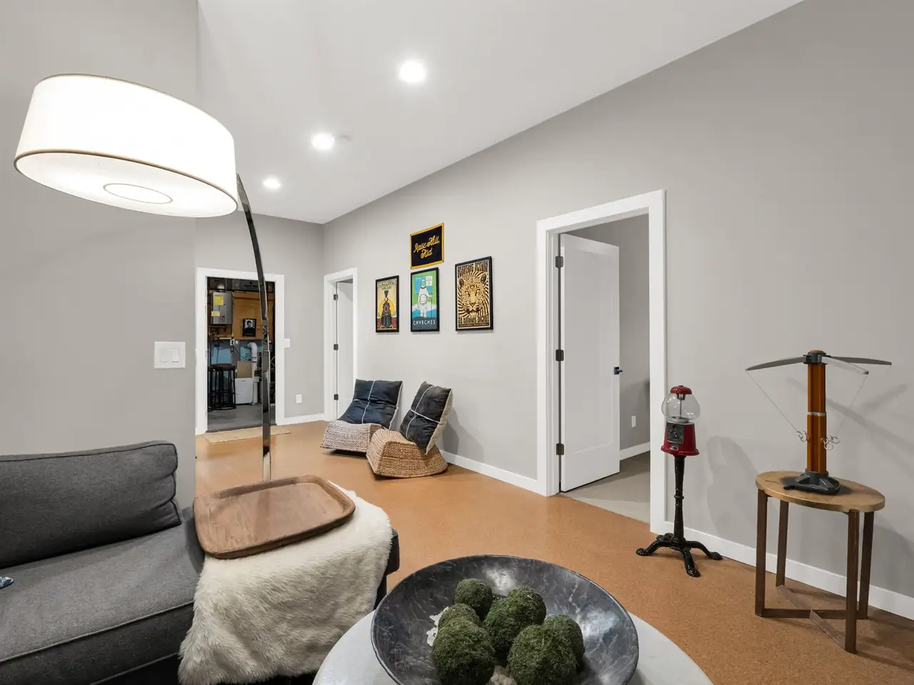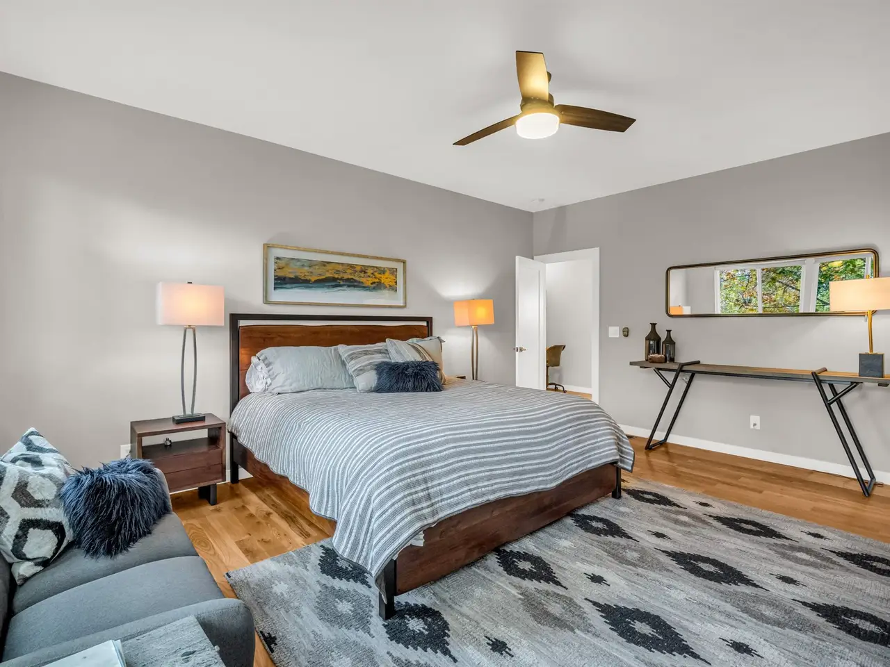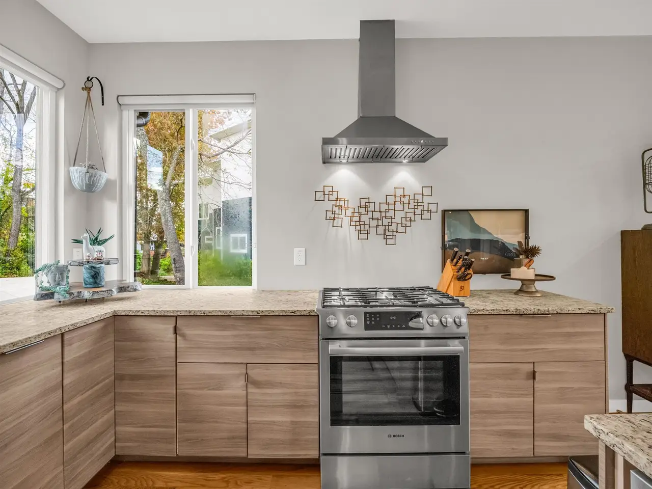 Incredible modern home in Asheville's River Arts District! Enjoy the best of Asheville living just a short walk to New Belgium Brewing! This is an ideal home for year-round living for buyers wanting minimal maintenance and yard upkeep. It's also perfect as a second/vacation home, as it has 3 primary suites (including one on the main level), making it just right for larger gatherings or extended family! The open floorplan and main level deck is perfect for entertaining or just enjoying a peaceful evening at home. From the living room, dining area, and decks, you can see the downtown Asheville skyline and the mountains beyond. The upper level has 2 massive primary suites with walk-in closets and beautiful bathrooms, as well as an office nook. The lower level has 2 more bedrooms, a bonus/TV room, full bath, and an unfinished space for storage (great for bikes, kayaks, and seasonal decor). The lower deck offers a second outdoor living area, and also has a hot tub! This quality built home has a Superior Wall precast concrete foundation, upgraded finishes throughout, and a location that can't be beat! Some furnishings negotiable.