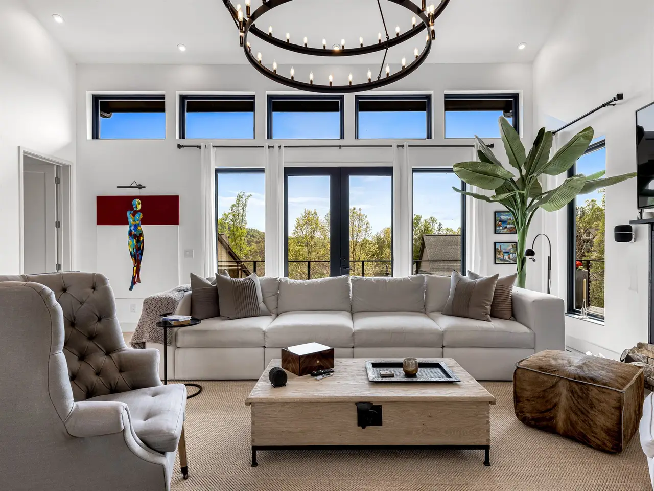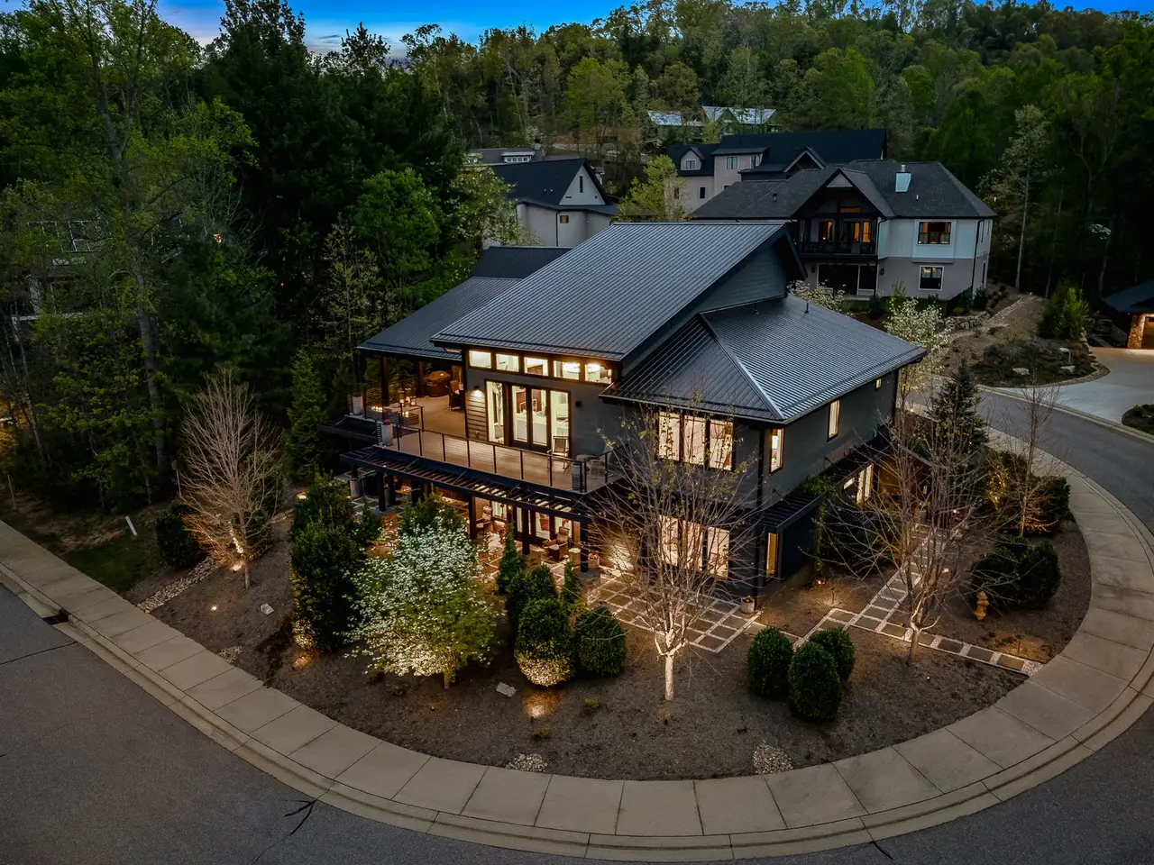 Timeless modern elegance combines seamlessly with the finest in lighting and technology in this custom mountain home located in gated Thoms Estate. Sleek metal surfaces, endless natural light, and earthy wood tones create a magical atmosphere curated by the movement of the sun. Relax in the living/great room with soaring ceilings or entertain on the covered and open decks surrounded by candle lanterns and raised fire boxes. Enjoy a spectacular Chef's kitchen with internally lit drawers, an LED lit Schott Ceran cooktop, and a column refrigerator and freezer. The main level primary suite entices with its privacy and delicious spa bath. The terrace level offers modern stained concrete floors, a wine gallery, fabulous home office/craft room, two guest bedrooms and a bright family room that opens to the terrace patio with concealed storage. Energy efficiency and sustainable living are maximized in this N.C. Green Built Certified home with HERS score of 57. Spectacular, luxury living awaits!