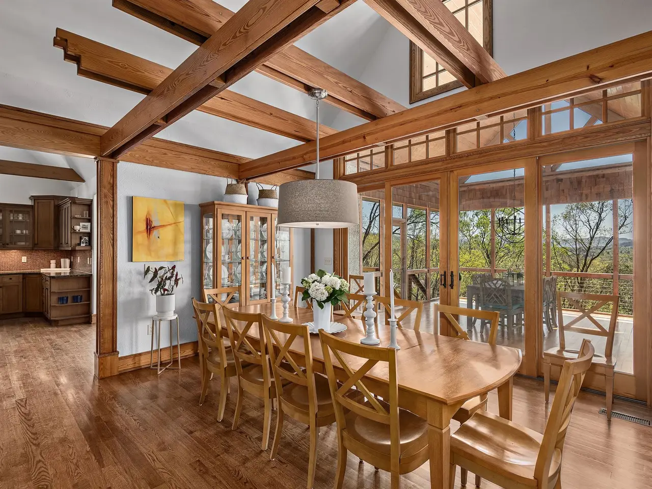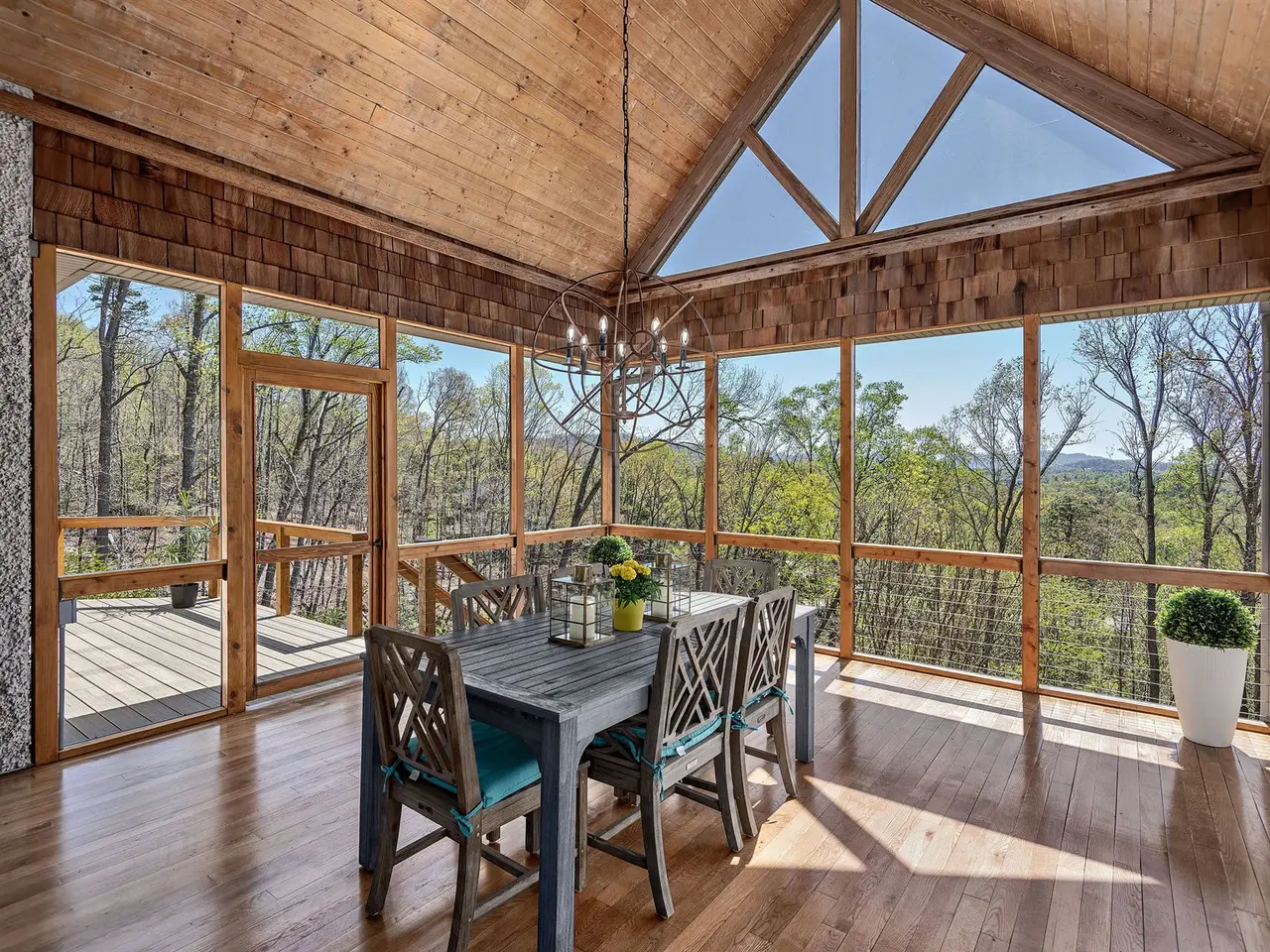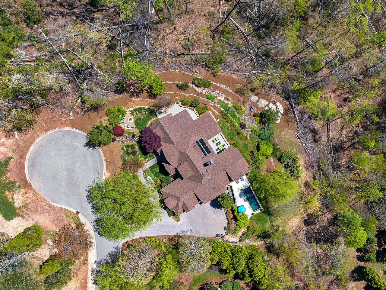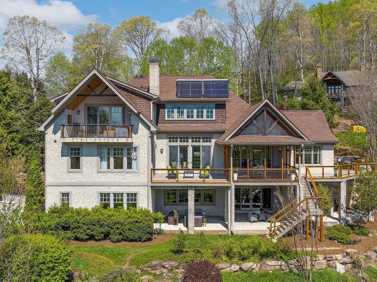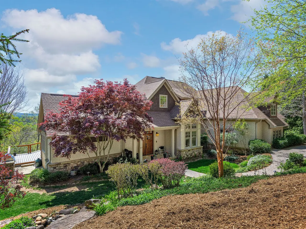 Rising above Biltmore Park and tucked away at the end of its most coveted street, this home artfully combines timeless elegance, natural beauty, and sweeping long-range views. Slate stone entry gives way to dramatic trellised beamed ceilings and spectacular windows that create a luminous, airy ambiance. Rich architectural details including locally milled hardwood floors, interior doors & trim showcase impeccable craftsmanship. A dreamy gourmet kitchen features white oak custom cabinetry, elegant granite, and stainless steel. New composite open deck and covered screened porch beckon precious contemplative moments. Solar power supplies radiant floor heating. The upstairs primary bedroom with private covered balcony and spectacular views is a peaceful sanctuary. Need more space? A versatile daylight basement offers a spacious family room, full kitchen, bedrooms, bath w/ steam shower & covered outdoor space. Wood-burning fireplaces with gas starters. Rare three-car garage. Exquisite pool.