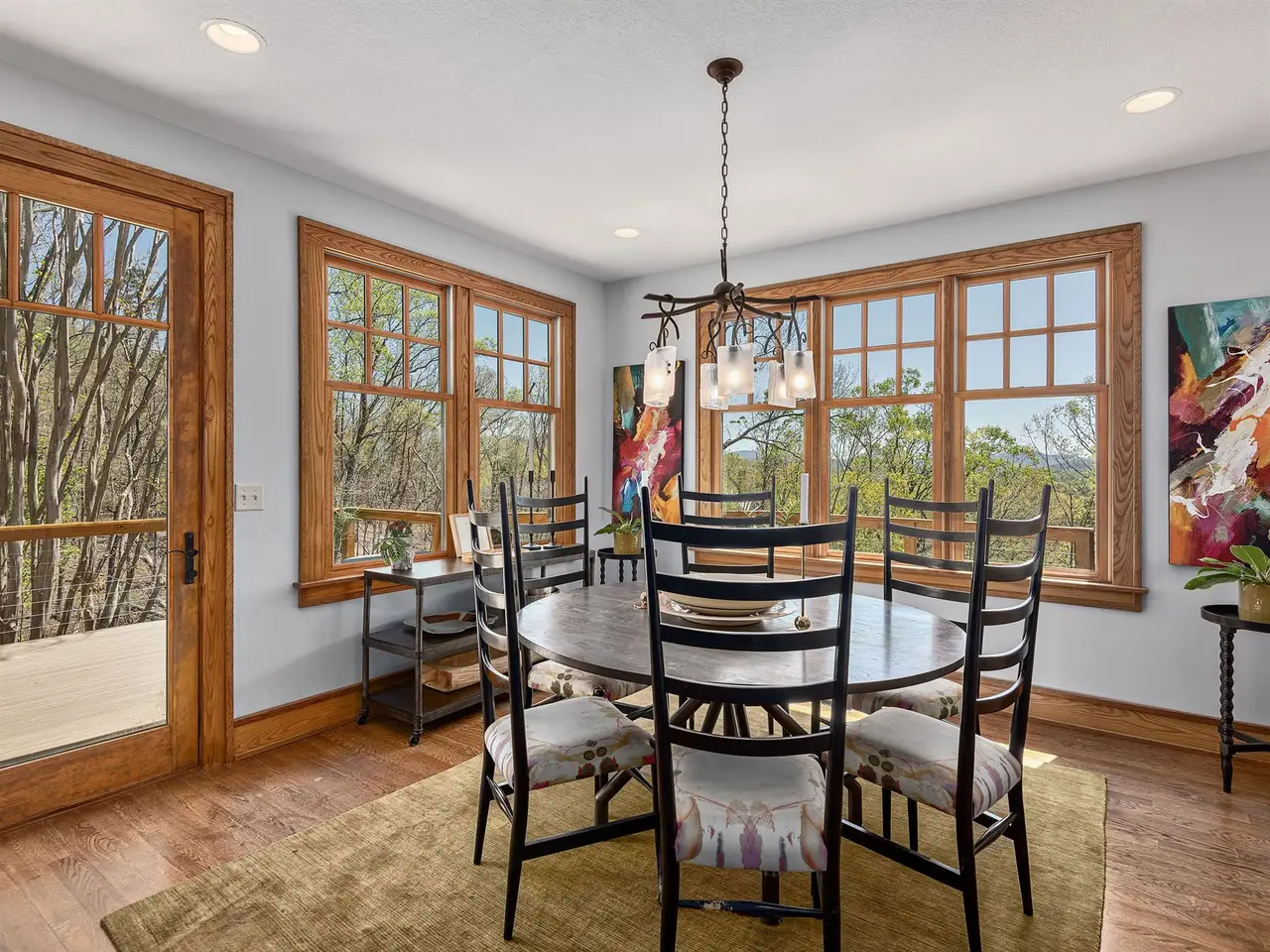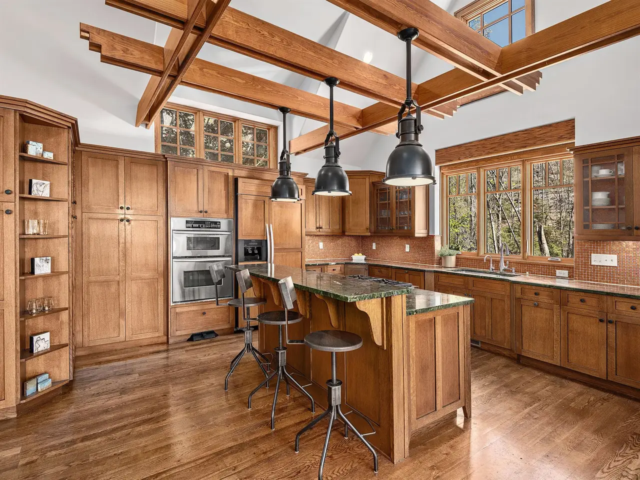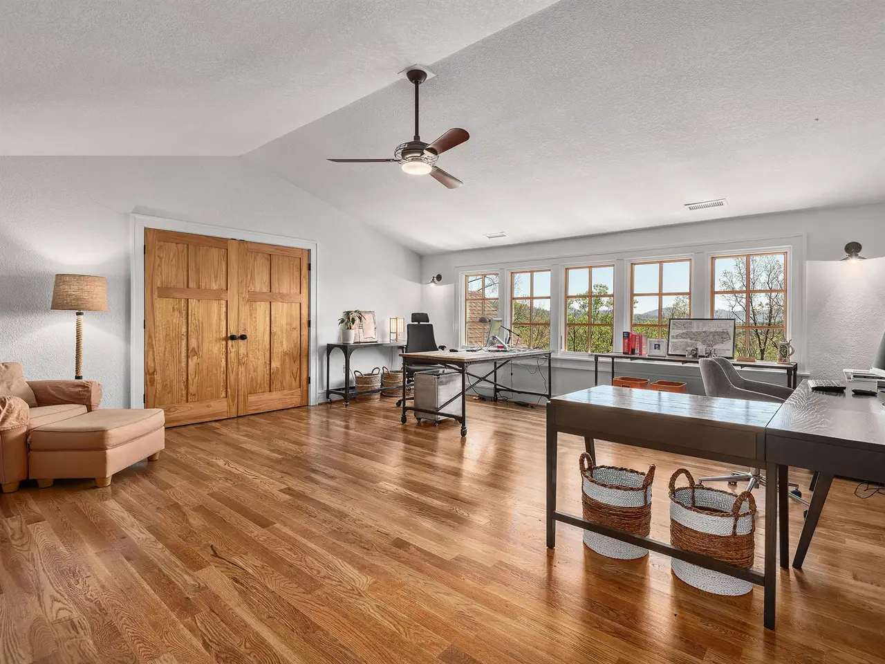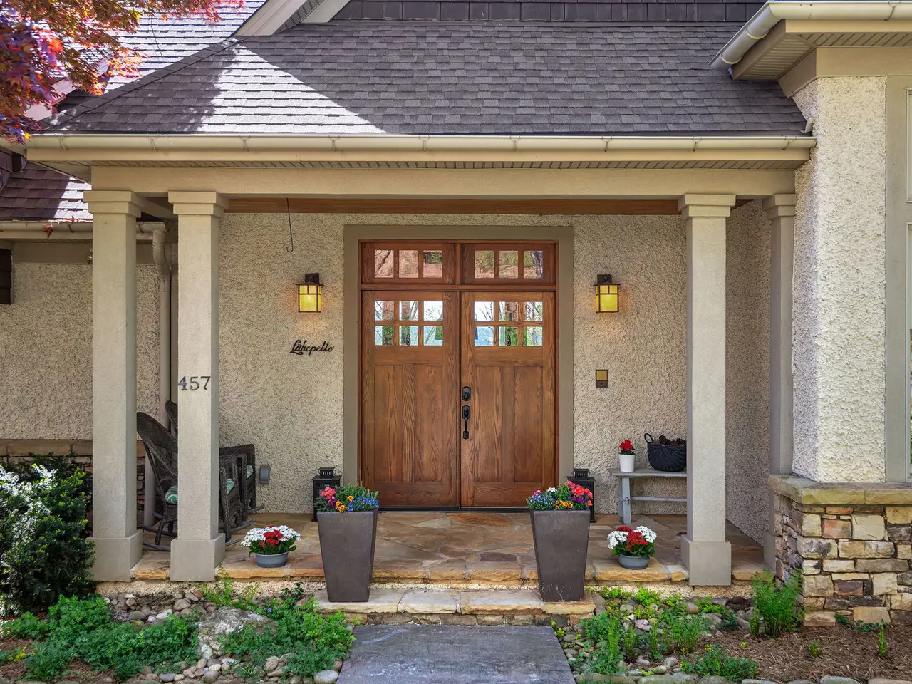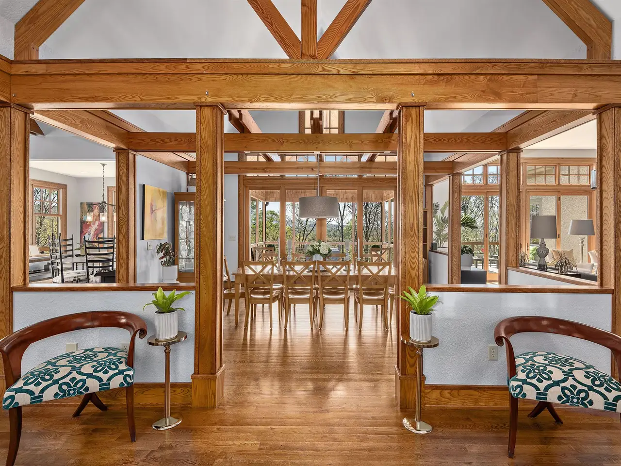 Rising above Biltmore Park and tucked away at the end of its most coveted street, this home artfully combines timeless elegance, natural beauty, and sweeping long-range views. Slate stone entry gives way to dramatic trellised beamed ceilings and spectacular windows that create a luminous, airy ambiance. Rich architectural details including locally milled hardwood floors, interior doors & trim showcase impeccable craftsmanship. A dreamy gourmet kitchen features white oak custom cabinetry, elegant granite, and stainless steel. New composite open deck and covered screened porch beckon precious contemplative moments. Solar power supplies radiant floor heating. The upstairs primary bedroom with private covered balcony and spectacular views is a peaceful sanctuary. Need more space? A versatile daylight basement offers a spacious family room, full kitchen, bedrooms, bath w/ steam shower & covered outdoor space. Wood-burning fireplaces with gas starters. Rare three-car garage. Exquisite pool.