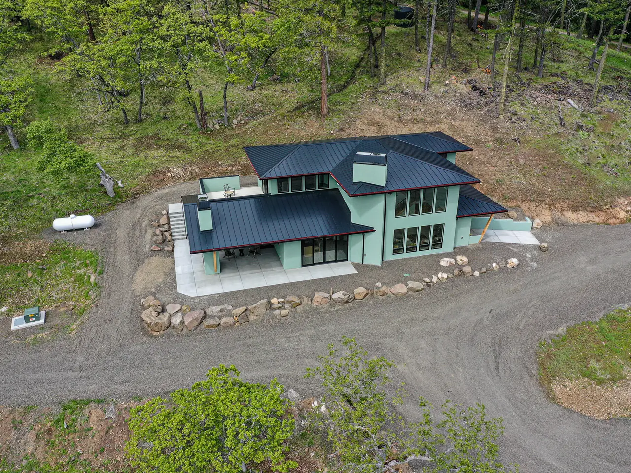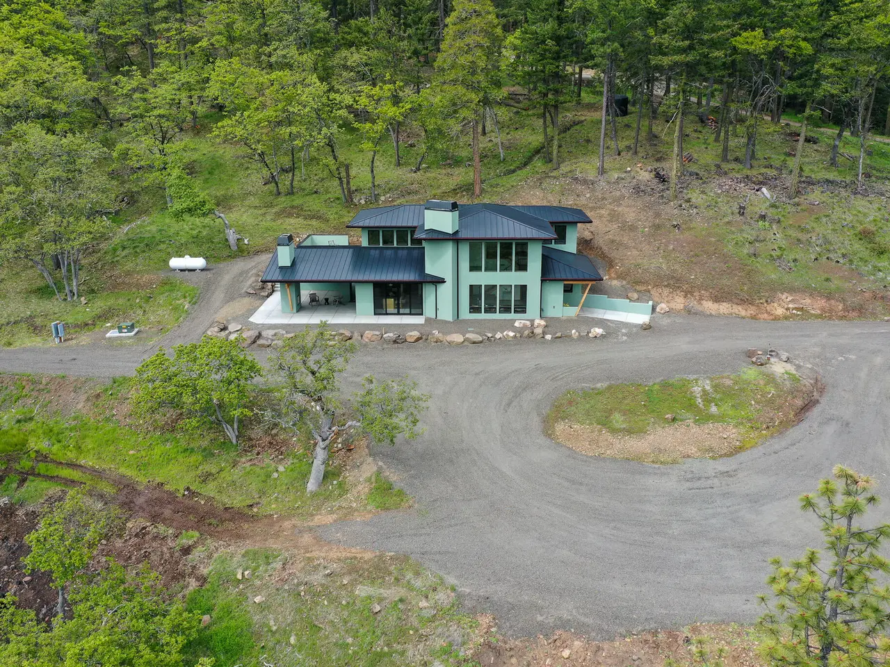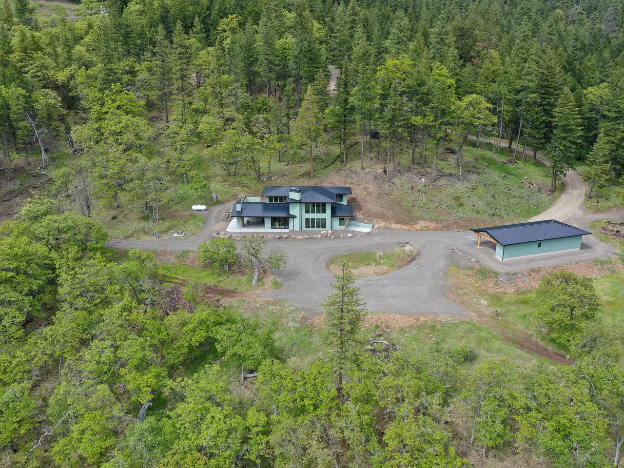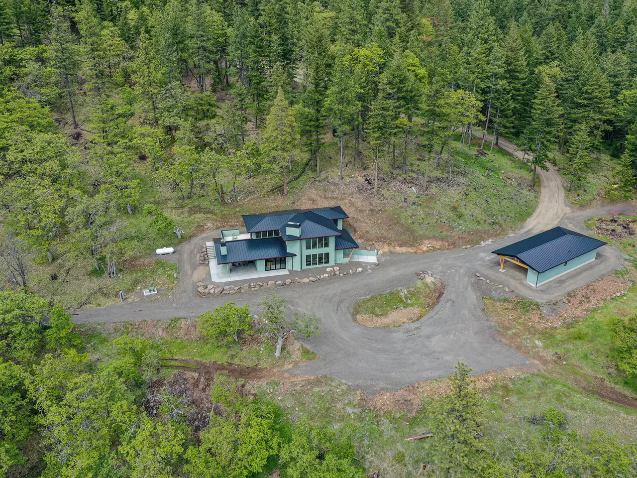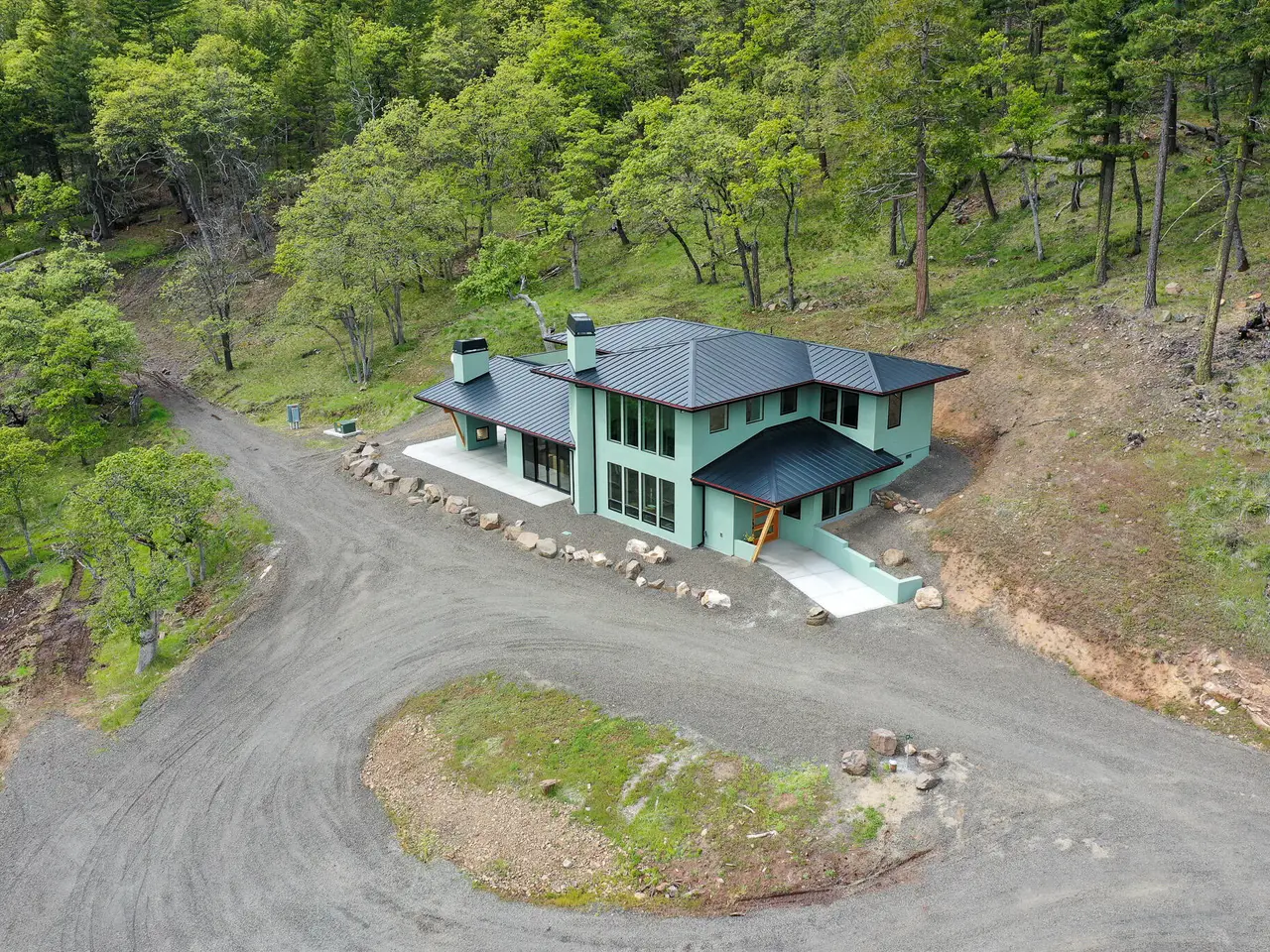 Stunning new contemporary home with mountain views on 20+ private acres! Interior highlights include natural hickory and maple hardwood floors and steps; porcelain tile in kitchen, bathrooms and great room, granite countertops; washer and dryer in upstairs primary bedroom closet and connections for a second set up downstairs, windows wired for electric blinds or shades, beautiful stone fireplace all the way to the ceiling, all Dacor appliances. The exterior has stucco siding, and a metal roof on both the main house and detached garage. The oversized garage has enough space for 2 cars plus a shop area with ample lighting, EV charging outlet, and a heated full bathroom. The garage also has an attached 2 car carport. The covered patio boasts an outdoor fireplace and the upstairs balcony off of the primary bedroom is a perfect place to accommodate a hot tub and enjoy the views. There is also a 200 amp service to the home and an additional 200 amp service for future construction.