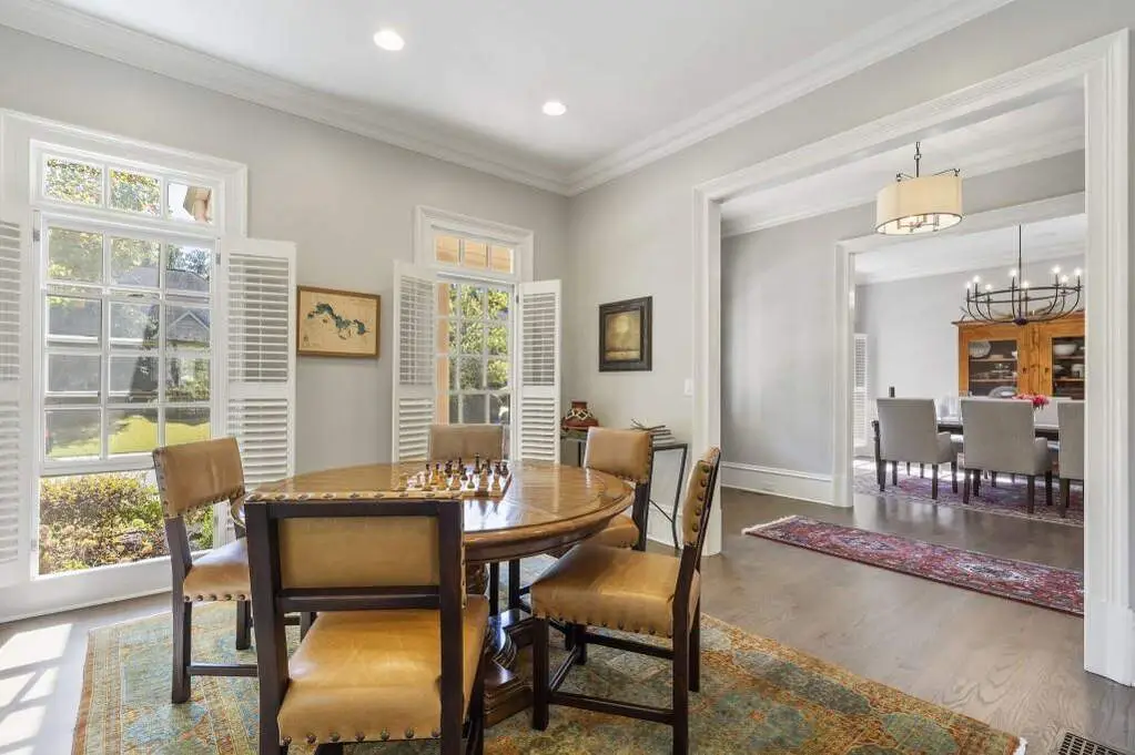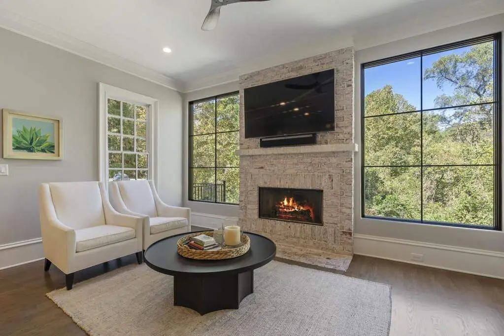 This exceptional Monte Hewett home is perfectly situated on a quiet cul-de-sac in the heart of North Buckhead, and offers a rare combination of architectural sophistication, timeless craftsmanship, and modern livability. Surrounded by beautifully landscaped grounds, this four-level residence is designed for both elegant entertaining and comfortable everyday living. A gracious front porch with gas lanterns welcomes guests into a light-filled interior with 10-foot ceilings on both the main and terrace levels. The stunning gourmet kitchen features walls of windows, quartz countertops, a large center island, new premium appliances, and a breakfast area with custom built-in banquette that opens to an outdoor dining area and kitchen, creating seamless indoor-outdoor flow. The kitchen flows into the keeping room with fireplace, the perfect spot for relaxed gatherings. The spacious family room showcases coffered ceilings, a fireplace, and custom built-ins, while the screened porch overlooks the manicured backyard and a peaceful nature preserve in the distance. A butler's pantry with ice maker connects to the formal dining room, easily accommodating twelve guests. A front living room offers flexible use as a music, game, or Mah Jongg room. Completing the main level are a mudroom with abundant storage and two stylish powder baths. Upstairs, the luxurious primary suite features a fireplace, private sitting room, and a spa-like bath with double vanities, soaking tub, separate shower, and an expansive walk-in closet. Three spacious secondary bedrooms, two full baths, and a landing area with a built-in reading nook complete this level. The fourth floor offers exceptional flexibility-ideal as a media room, home office, craft room, or play space. The terrace level is a true extension of the home, featuring a daylight media/family room with custom cabinetry, temperature-controlled wine cellar, game room, exercise room (optional 6th bedroom), guest suite, 1.5 baths, office, and French doors.