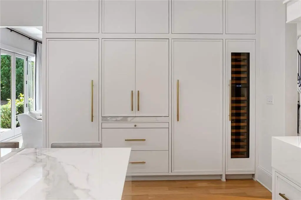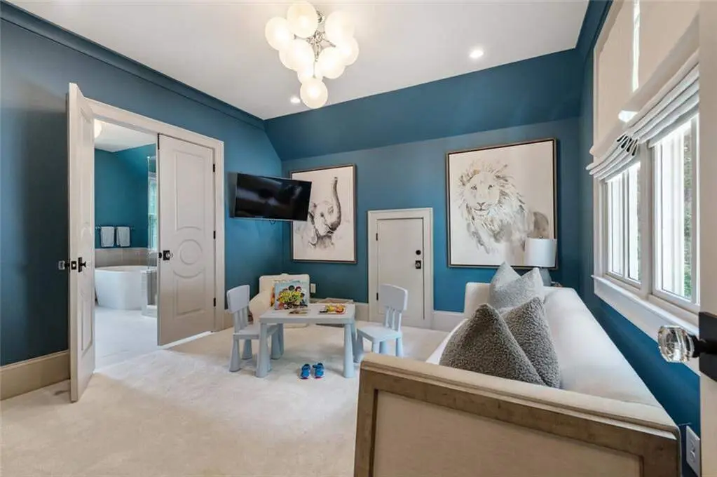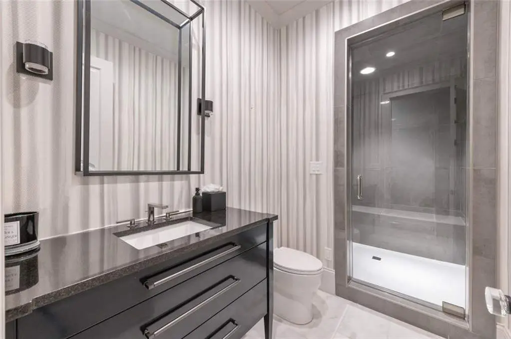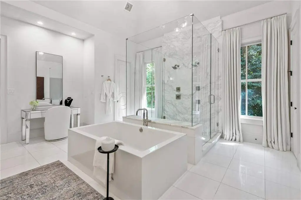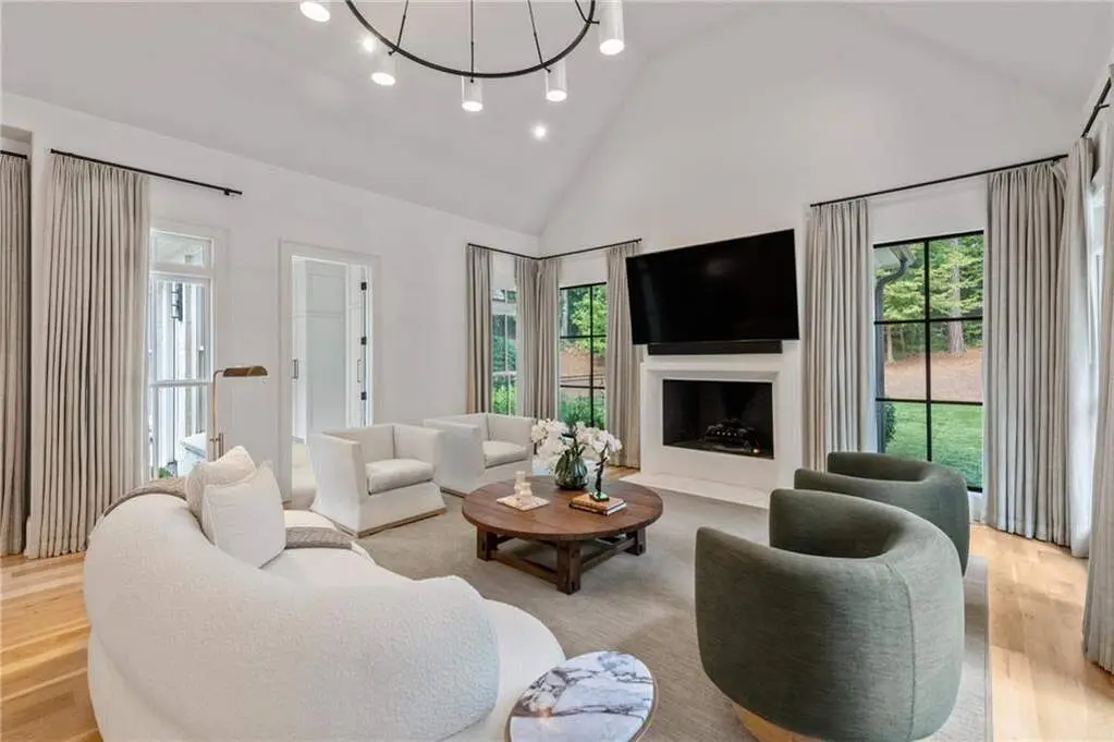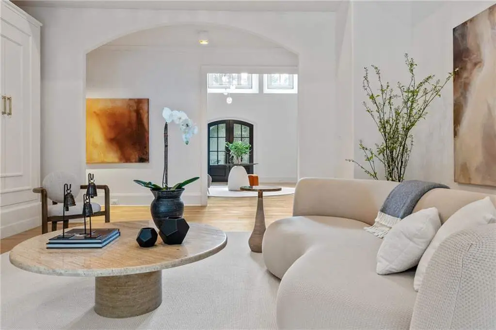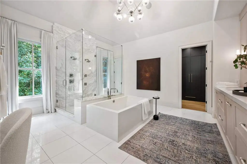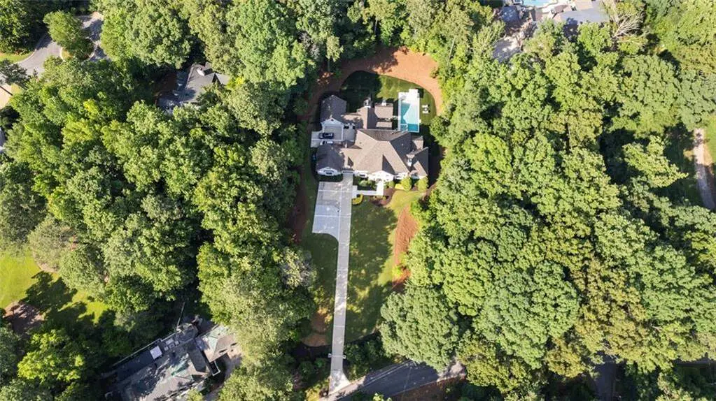 Tucked behind private gates on an expansive 2.1-acre estate in the prestigious Buckhead neighborhood, this exquisite residence is a stunning example of timeless design and refined living. Every element of the home has been thoughtfully curated to blend classical architecture with modern luxury. A dramatic two-story foyer greets you with a sweeping curved staircase and floods of natural light, setting the tone for the sophistication within. To one side, a richly appointed study showcases bespoke floor-to-ceiling millwork and a striking view of the private front landscape. On the other, the formal dining room impresses with detailed trim work, soaring ceilings, and elegant proportions ideal for both intimate gatherings and large-scale entertaining. The main living room offers a harmonious balance of grandeur and comfort, featuring a tray ceiling, a bold stone fireplace, and a wall of windows that seamlessly merge indoor and outdoor living. Adjacent is the chef's kitchen, a true centerpiece of the home, anchored by a stunning marble waterfall island and outfitted with top-tier appliances concealed within custom cabinetry. A burnished brass pot filler, sleek vent hood, and wine refrigerator complete this space designed for both form and function. Flowing naturally from the kitchen, the light-filled family room is a haven for relaxed living, with vaulted ceilings and expansive windows that frame views of the beautifully landscaped walk out turf backyard and open gracefully to an outdoor veranda with automated screens. The main-level primary suite is a serene retreat with a vaulted ceiling and wooded vistas. Its en-suite bath evokes a boutique spa experience, featuring a sculptural stone soaking tub, a dramatic glass-enclosed marble shower, dual vanities with ambient lighting, and his-and-hers dressing rooms finished in rich custom cabinetry. Upstairs, five well-appointed bedrooms each feature private en-suite baths. A separate guest suite includes its own living space and bathroom, offering a versatile area perfect for extended stays, children's activities, or a private lounge. The home also includes an elevator that serves all levels, leading to an impressive terrace level designed for indulgence and leisure. Highlights include a glass-front, climate-controlled wine cellar, a professional-grade home theater, a full fitness suite with a mirrored studio for dance, barre, or yoga, and an additional living area complete with a full kitchen and guest accommodations. Outdoors, this estate continues to elevate the lifestyle with a resort-style saltwater pool and tanning shelf, expansive flat lawn, and dual covered pavilions featuring a wood-burning fireplace and vaulted wood ceilings ideal for alfresco dining and year-round enjoyment. A gated area offers the perfect space for pets or play. This is a rare opportunity to own a truly bespoke residence in one of Atlanta's most sought-after addresses an estate that defines elegance, privacy, and timeless sophistication.