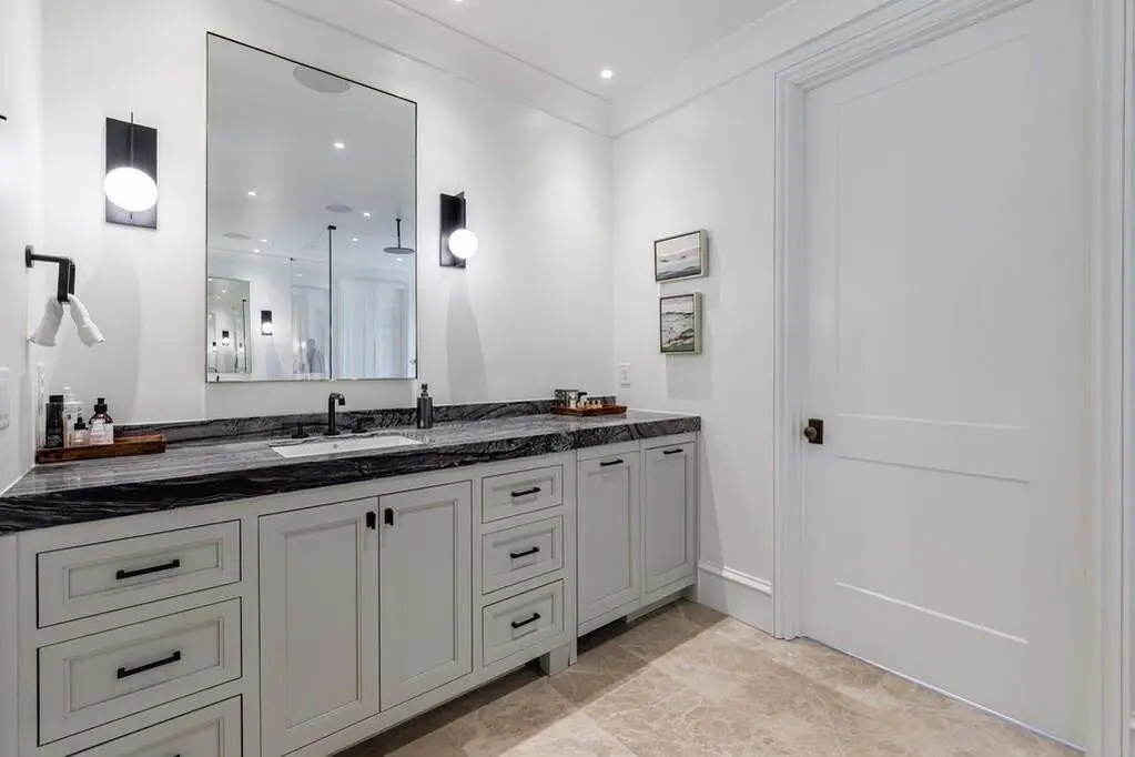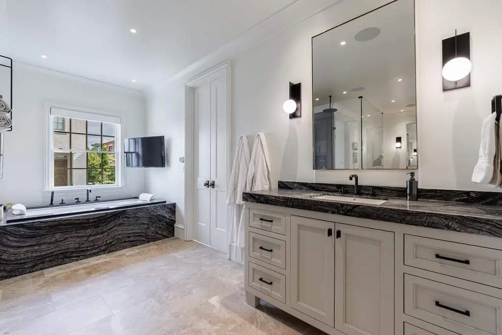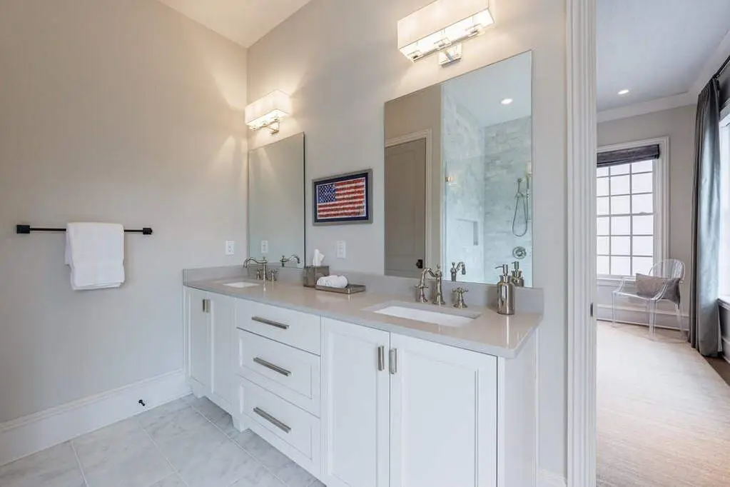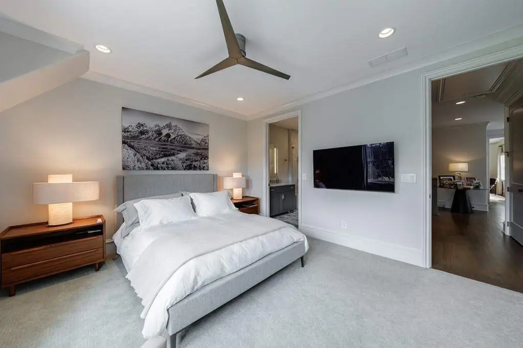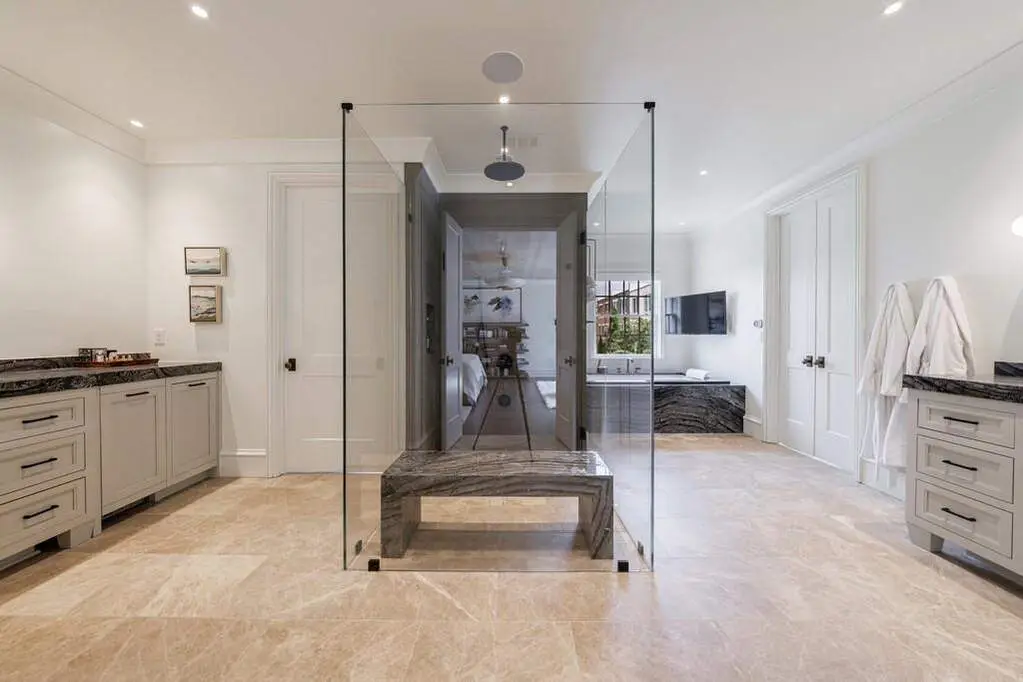 Oversized primary suite with spa-like bath and two custom walk-in closets