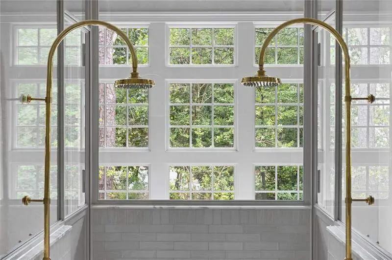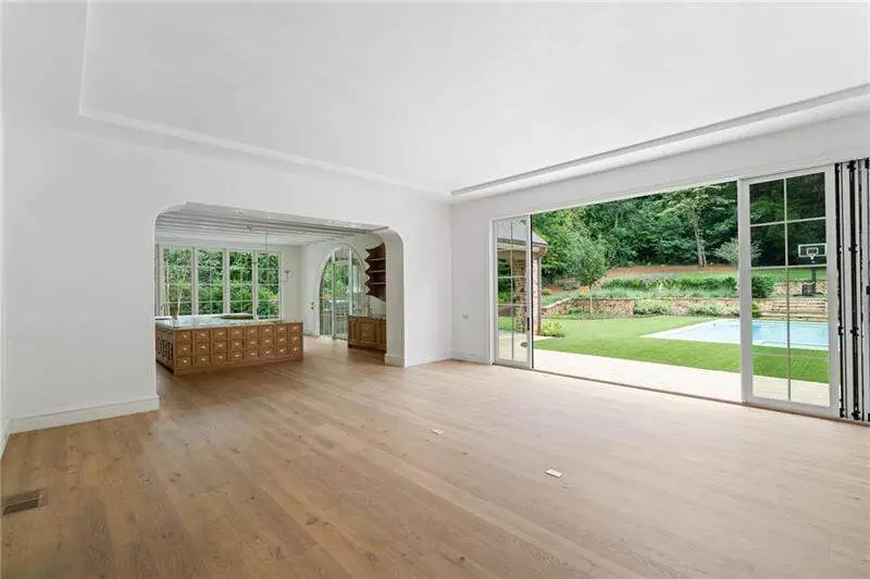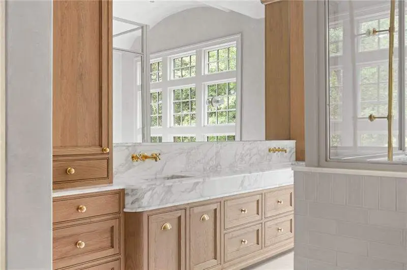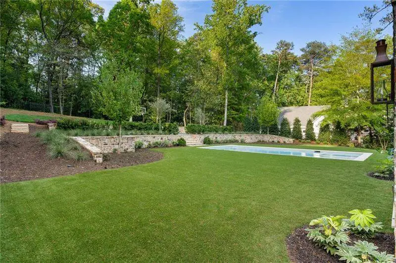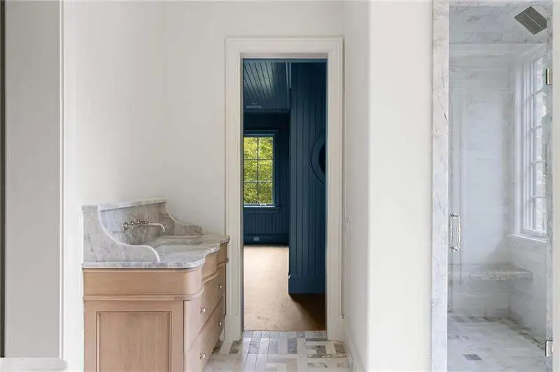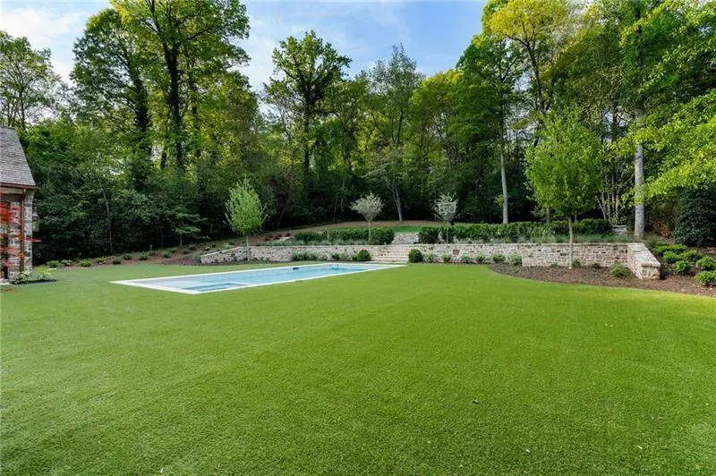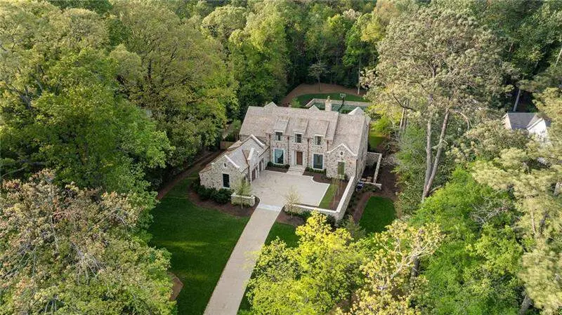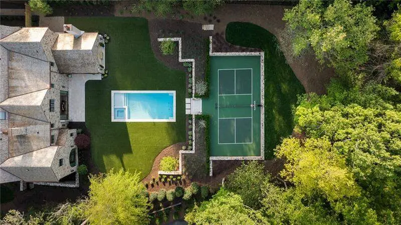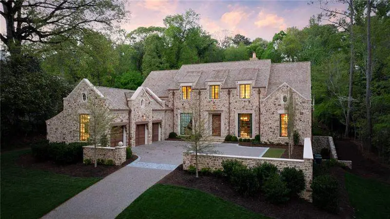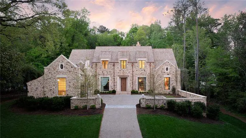 Located in the prestigious Tuxedo Park neighborhood of Buckhead, this 7-bedroom estate is a masterful blend of timeless elegance and modern luxury. Designed with exterior architecture by William T. Baker, refined interiors and specifications by SOURCE, and expertly built by Cole Construction, the home evokes the charm of a classic English manor. A striking fieldstone facade, hand-carved limestone accents, and a cedar shake roof lend an inviting, enduring character to this architectural gem. The interior features 12-foot ceilings and blends traditional charm with contemporary flair. Venetian plaster walls, marble accents, and custom wood paneling create an inviting, sophisticated atmosphere. The spacious foyer opens to a cozy living room with a sculpted plaster fireplace and herringbone surround. The chef's kitchen features sleek appliances, brass fixtures, and Kingdom cabinetry, flowing seamlessly into a charming scullery with a checkerboard floor. Decorative plaster ceilings add character to the dining room and primary bedroom, while the primary bath boasts a dramatic barrel arch and a jewel-box freestanding shower. The main-level primary suite also includes dual closets and a spa-like bath. Upstairs, five additional bedrooms, each with marble baths and classic fixtures, offer hotel-like comfort and ample space for family and guests. A playful bunkroom completes the family-friendly layout. The fully finished lower level offers the ultimate in relaxation and convenience, with a media room, bar, gym, sauna, cold plunge, and even a golf simulator. It also features an au-pair suite with a separate entrance, providing privacy and flexibility. The home is equipped with state-of-the-art security, including wired systems and cameras for peace of mind. Phantom speakers are built into the ceilings of the kitchen and family room, and wall speakers are installed on the porch for the perfect soundtrack to any occasion. Outside, the fully fenced backyard is a private oasis with a covered porch featuring a fireplace and stainless-steel gas grill, a sparkling walk-out pool, sports court, and lush landscaping by Land Plus. This estate offers over 1.5 acres of serene, resort-style living, perfect for both relaxation and entertainment.