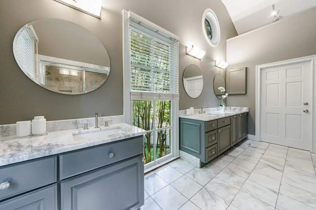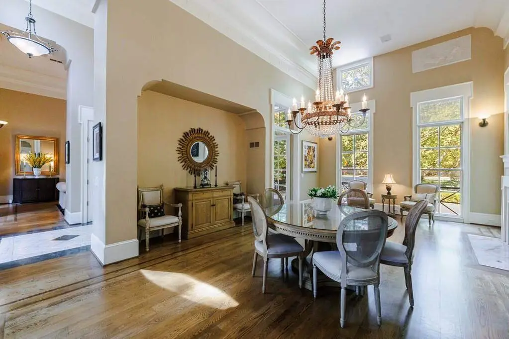 Inspired by Andrea Palladio's masterpiece, Villa Poiana, this exquisite Tuxedo Park custom home offers truly beautiful and unique architecture throughout the property including custom window details, elegantly designed front entry and custom crown molding. Grand entrance foyer with marble flooring leads to oversized dining room and living room, both featuring a fireplace. Beautiful floor to ceiling windows throughout the home offer a lot of natural light. French doors throughout the entire back of the house all open to the pool, ideal for entertaining. Kitchen opens to the breakfast room and includes island, gas range, wood burning oven from Provence, stone counters and marble flooring. Handsome solid walnut paneled den sits in the back of the house, ideal for an office or den. Spacious guest suite on main with full bath. The primary suite has its own wing on the upper level with walk-in closet, ensuite primary bath with dual vanities, and shower. The primary suite also has its own private balcony. Additional two bedrooms and one bath on a separate upper level wing from the primary suite. Basement has access to the three-car garage (one garage in tandem). Gorgeous manicured grounds include a lap pool, spa and level yard. Parking pad in the front of the house as well.