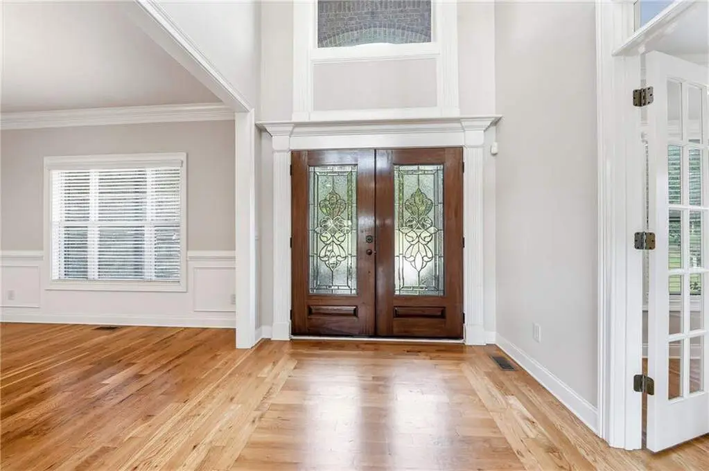 Grand Two-Story Foyer with Rich Hardwood Floors