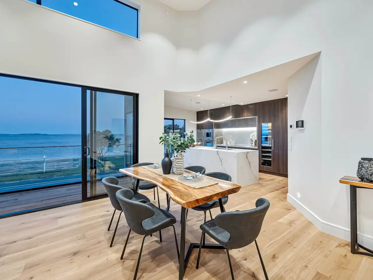Floor-to-ceiling glass with beach views