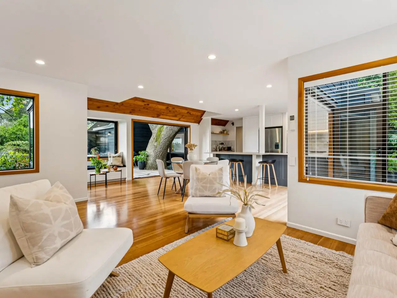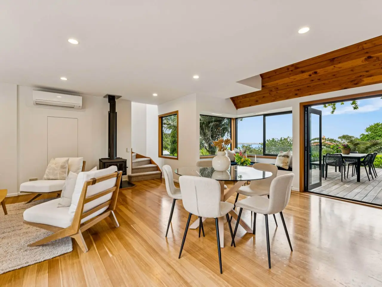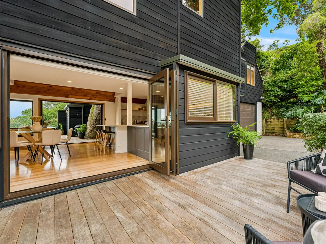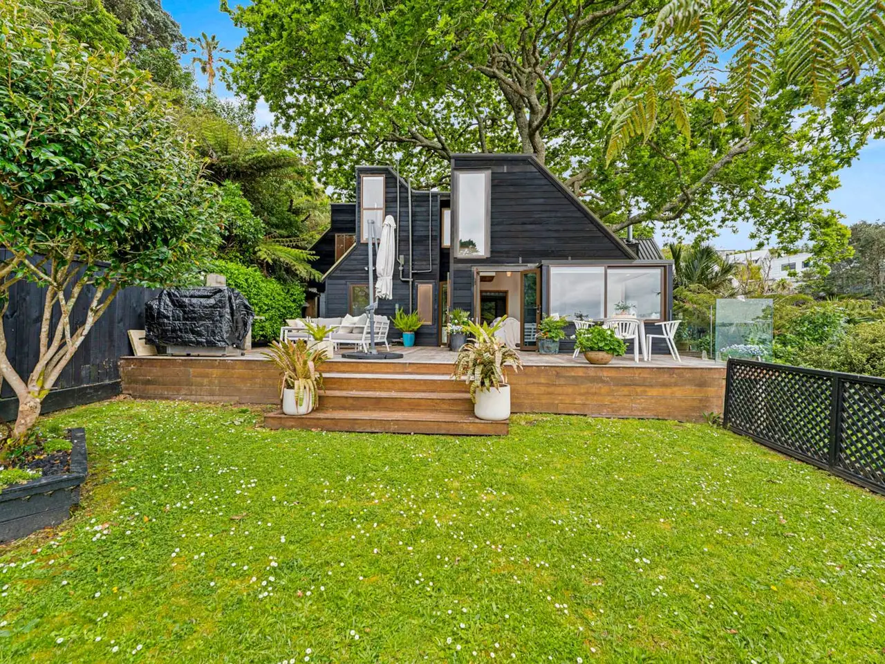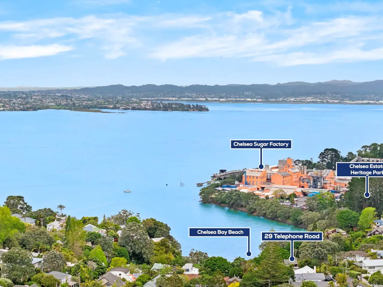 As you would expect, this home is grand and green, breathtakingly poised to render your guests speechless. On approach 29 Telephone Road commands recognition, the rich mix of immaculate black cedar weatherboard standing proudly amongst nature’s accompanying backdrop. A giant Oak canopies this unique dwelling, protecting the perfect patina from the hot sun and acting as a shield from the seaward weather fronts whilst delivering beguiling beauty and birdsong at every aspect of this incredible home. The interior of this five bedroom, three living, three bathroom, double integral garage home is open plan and magnificently spacious. Architecturally designed to embrace the trunk of the resplendent Oak from the inside out, with dazzling success. Soaring ceilings with warm timber tones stand high above a mass of glass, ensuring that the intimate sea views of Chelsea Bay and the Waitemata Harbour are easily visible and constantly vie for attention.A large contemporary kitchen with smooth stone surfaces anchors a huge lounge diner complete with a central wood burner, whilst the wet bar, atmospheric window seating and lighting add another layer of sophistication.A more formal second lounge, also with an essential wood burner and window seat that creates the ideal reading nook whilst framing the seamless link onto the vast deck with uninterrupted seascape. The detailing continues throughout this remarkable home with three sumptuous bathroom,s all designed to optimise their space with high privacy windows for gazing at the surrounding foliage and sky with tiling and vanities curated for their cohesion. This extraordinary residence has so many places to enjoy company, whether that’s gathered around the fire in the living room or kitchen or sitting in your favourite lounger positioned in the dedicated spot of one of the many decks. Your family and guests will remain steadfast, soaking up the sunshine and sea views. The location of this family home is exceptional. Access to Chelsea Bay beach is literally on your doorstep, along with native bush walks through the Chelsea Heritage Park to the renowned Sugar Cafe. Enjoy the sought after Hinemoa Street community just moments away, plus a stress-free commute via ferry, bus or car to Auckland CBD. Deadline sale: Closes on Wednesday 26 November 2025 at 1:00PM (unless sold prior)