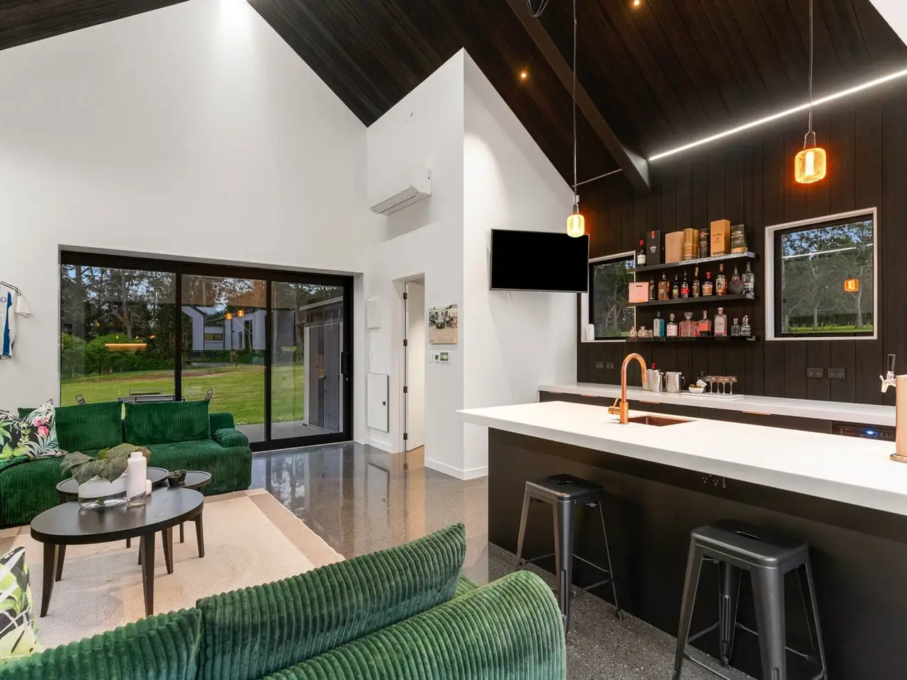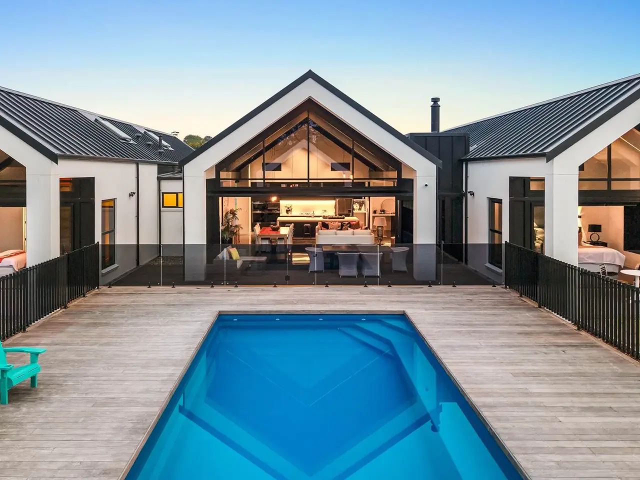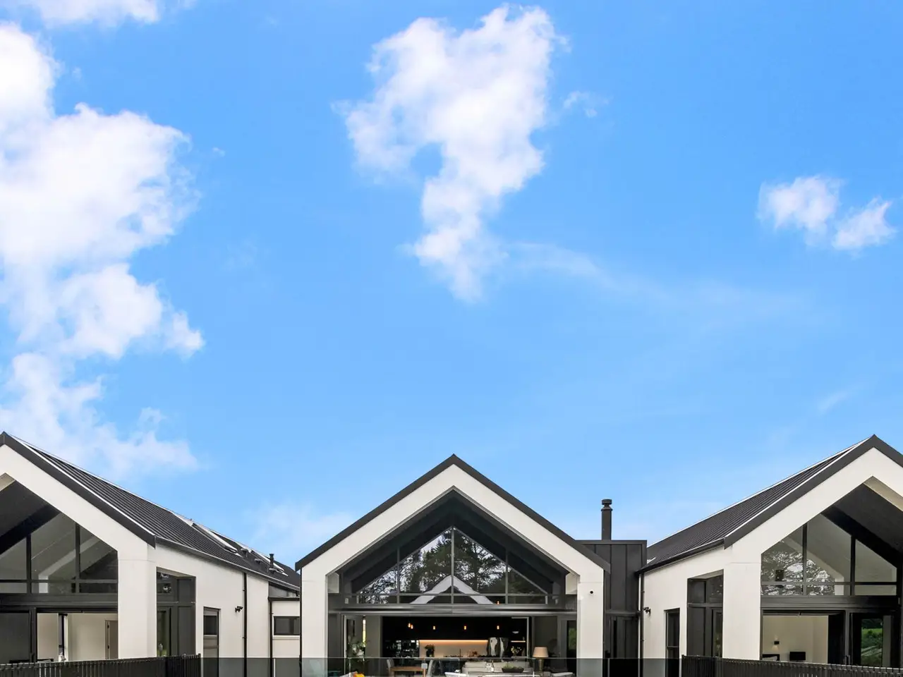 Large glazed volumes framing paddock and garden views