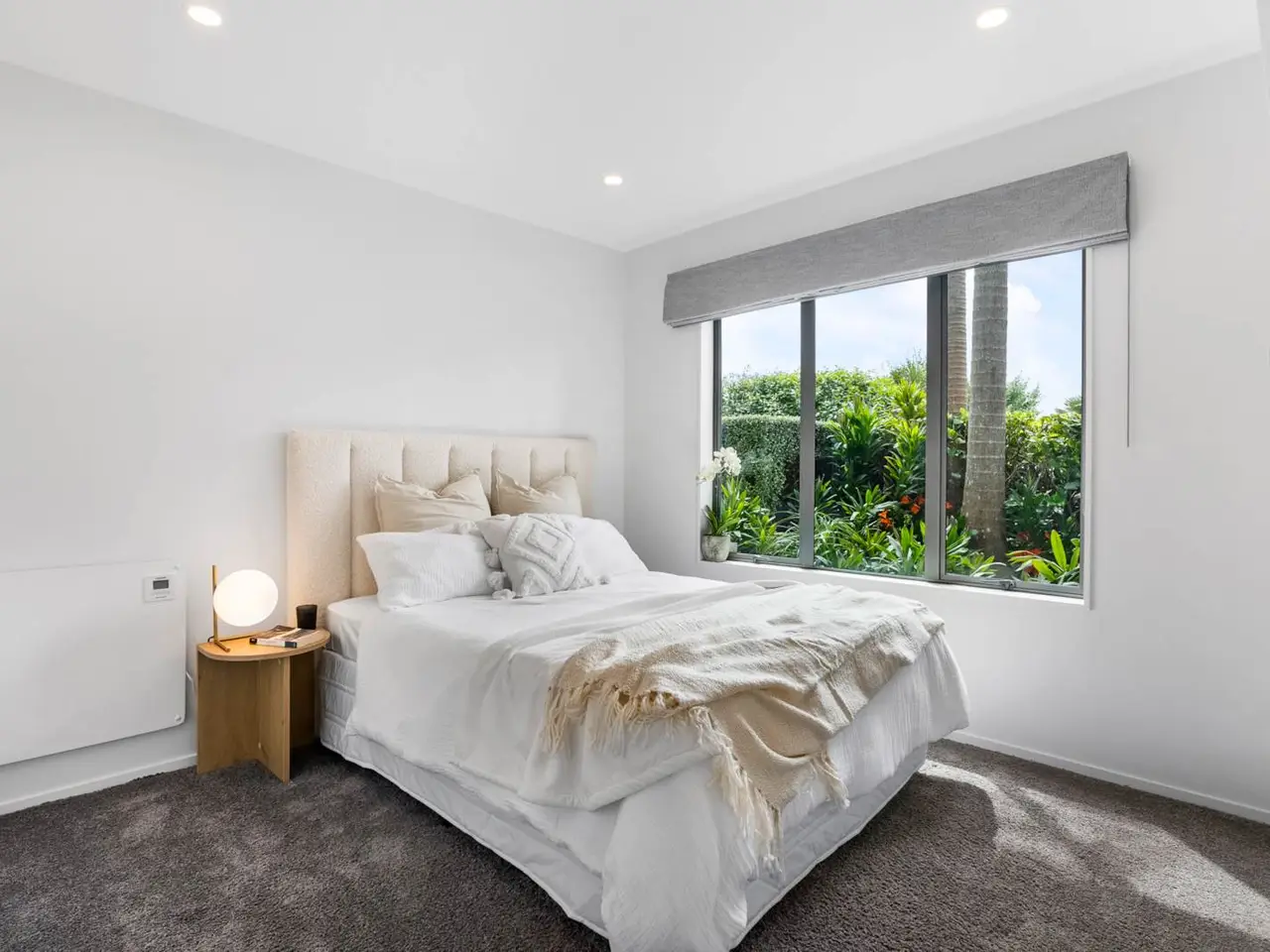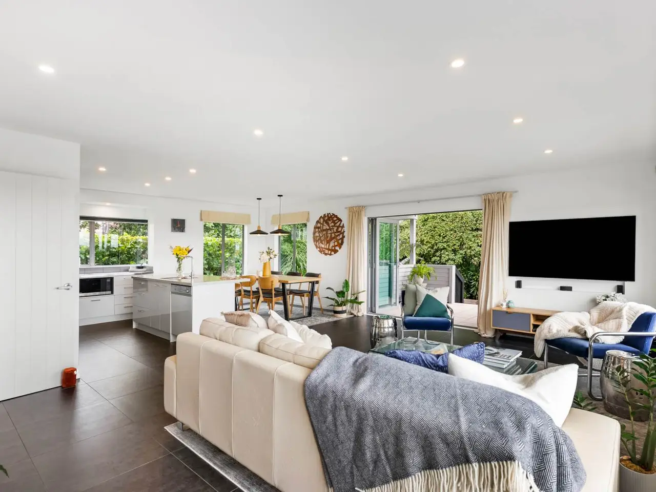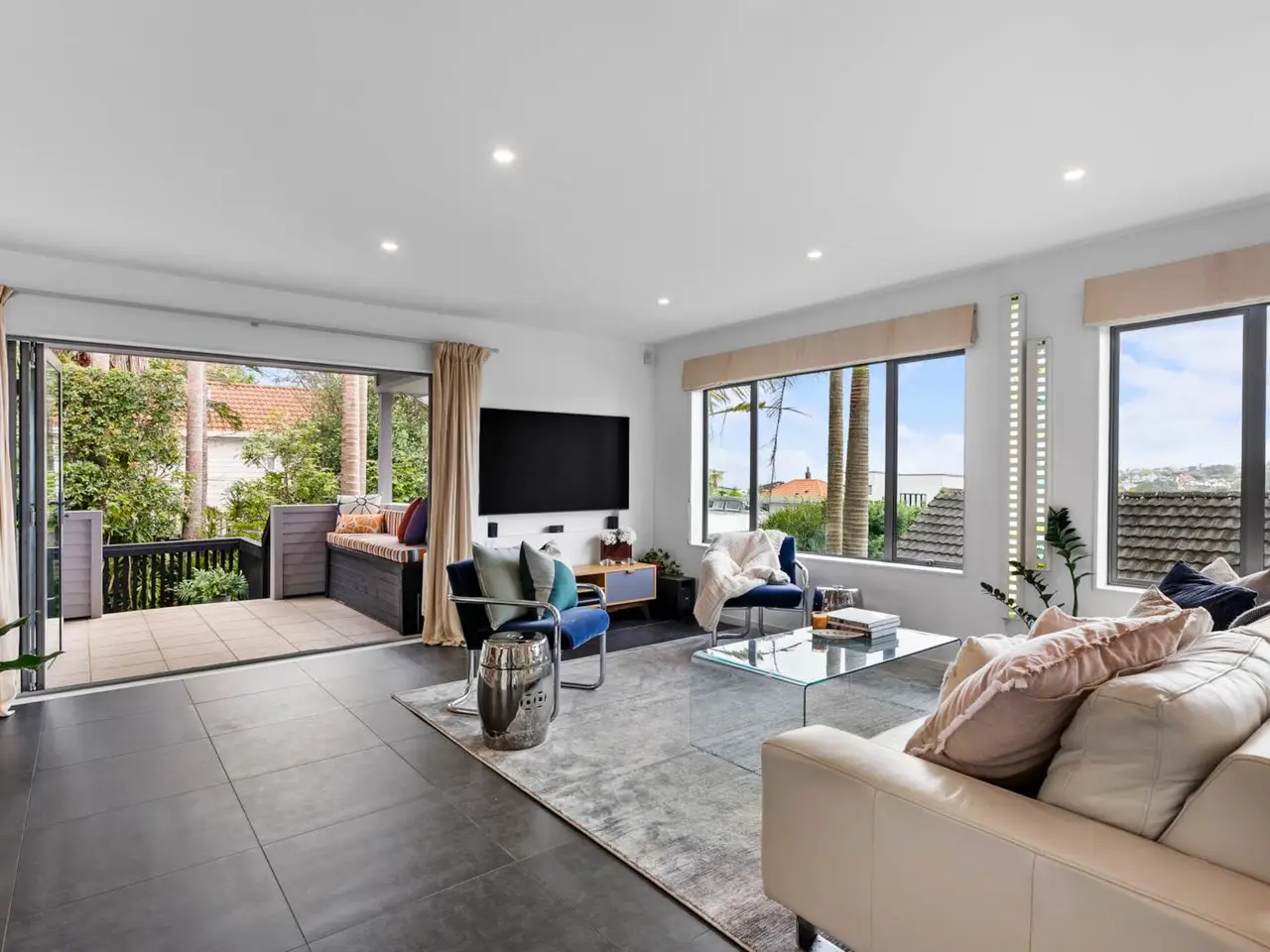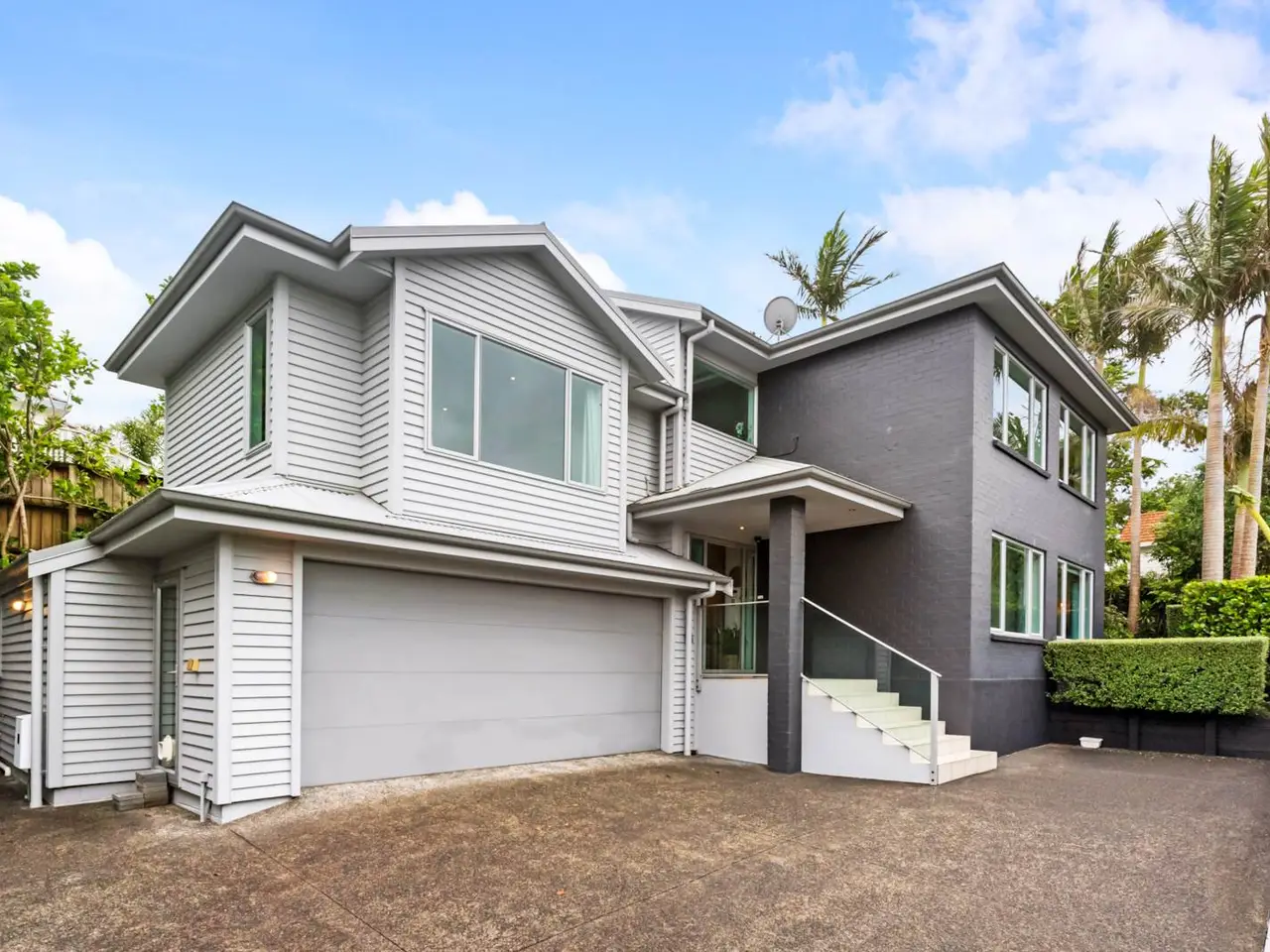 Tucked privately on a rear section, this lofty brick and weatherboard residence enjoys tantalising glimpses of the Waitemata Harbour, and the surrounding urban landscape. Towering Nikau palms and lush tropical foliage create a private, tranquil setting within an exclusive coastal enclave, just an easy walk to Mission Bay's iconic shoreline, cafés, and beaches.A thoughtful 211sqm (approx.) floor plan positions all north-facing living on the upper level, capturing abundant natural light, expansive urban vistas, and shafts of water views. Aluminium joinery enhances comfort throughout generous open plan living and dining areas that connect seamlessly through bifold doors to a substantial covered loggia with built-in seating. The contemporary kitchen features stainless steel appliances, stone-topped island, and ample storage, creating an ideal hub for everyday living and entertaining.Carpeted double bedrooms include a serene upper-level main suite with heat pump, monochrome ensuite, and extensive built-in wardrobes. A fifth bedroom downstairs offers versatility as a second lounge, complemented by a large family bathroom with sleek black fixtures, freestanding bath, and modern vanity. Two powder rooms, one on each level, enhance convenience. The carpeted internal-access double garage incorporates laundry and storage, with additional off-street parking and low-maintenance garden pockets ideal for alfresco dining. Close to city commuter routes, Orakei School, in-zone Selwyn College, and Eastridge's shops and eateries, this secluded coastal haven delivers relaxed, resort-style living just moments from the beach. Auction: 34 Shortland Street, City on Wednesday 19 November 2025 at 10:00AM (unless sold prior)