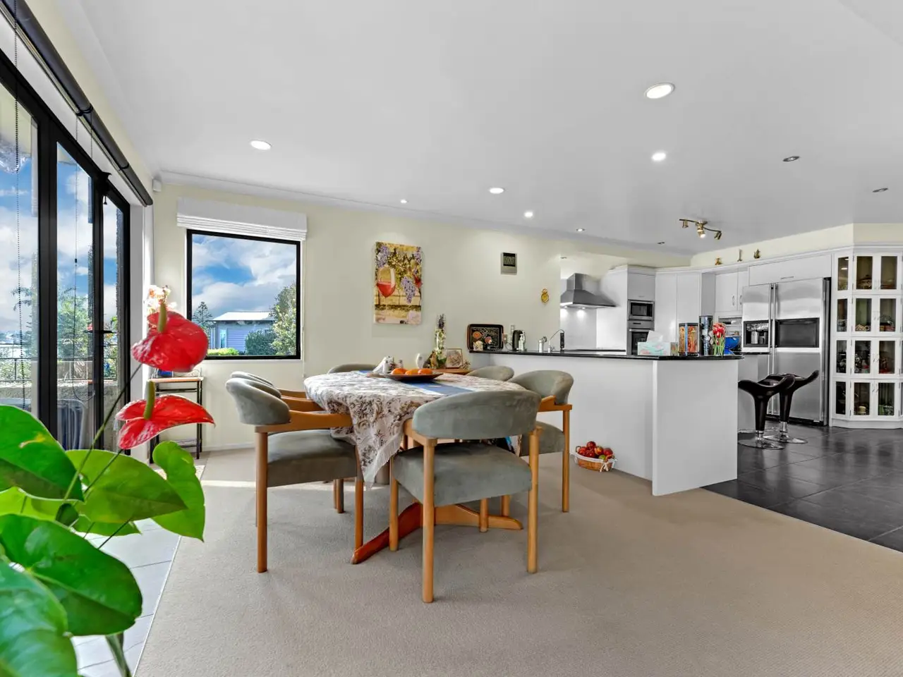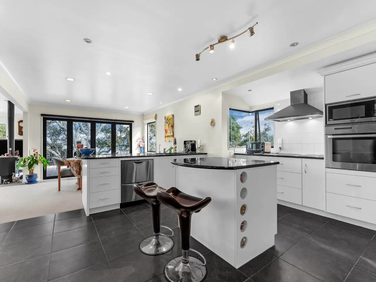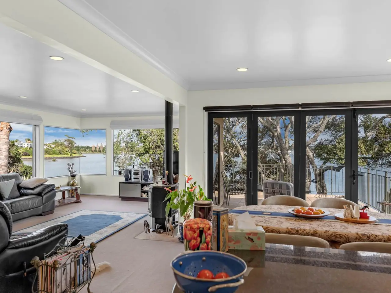Open plan kitchen, living, and dining area with panoramic sea views