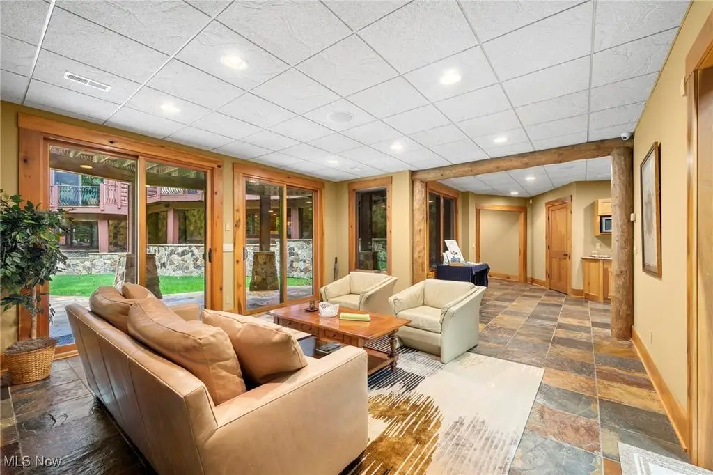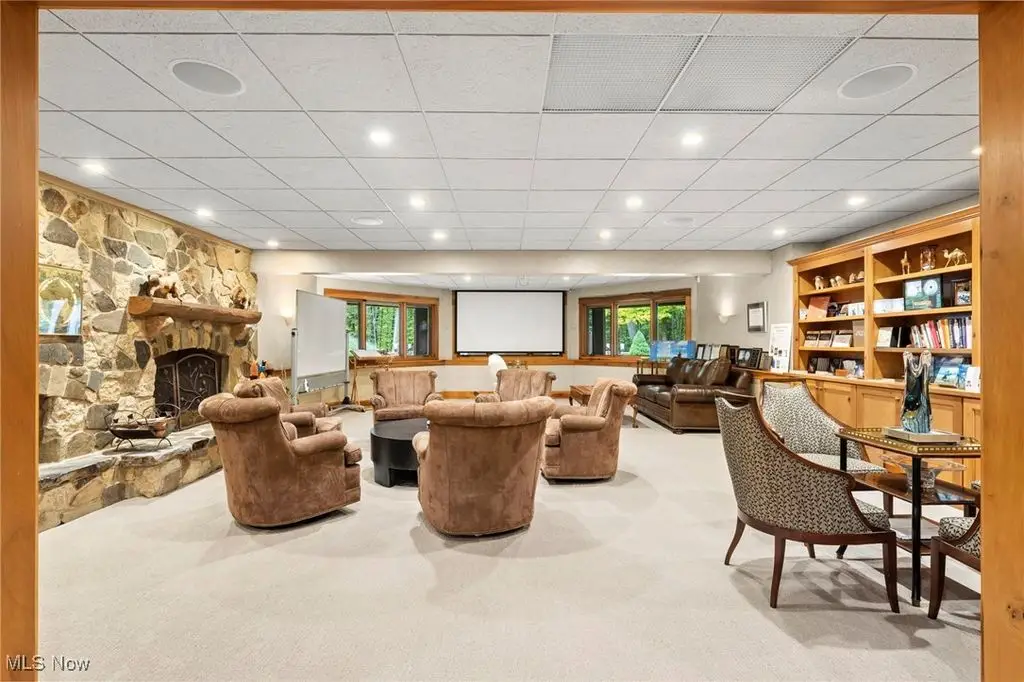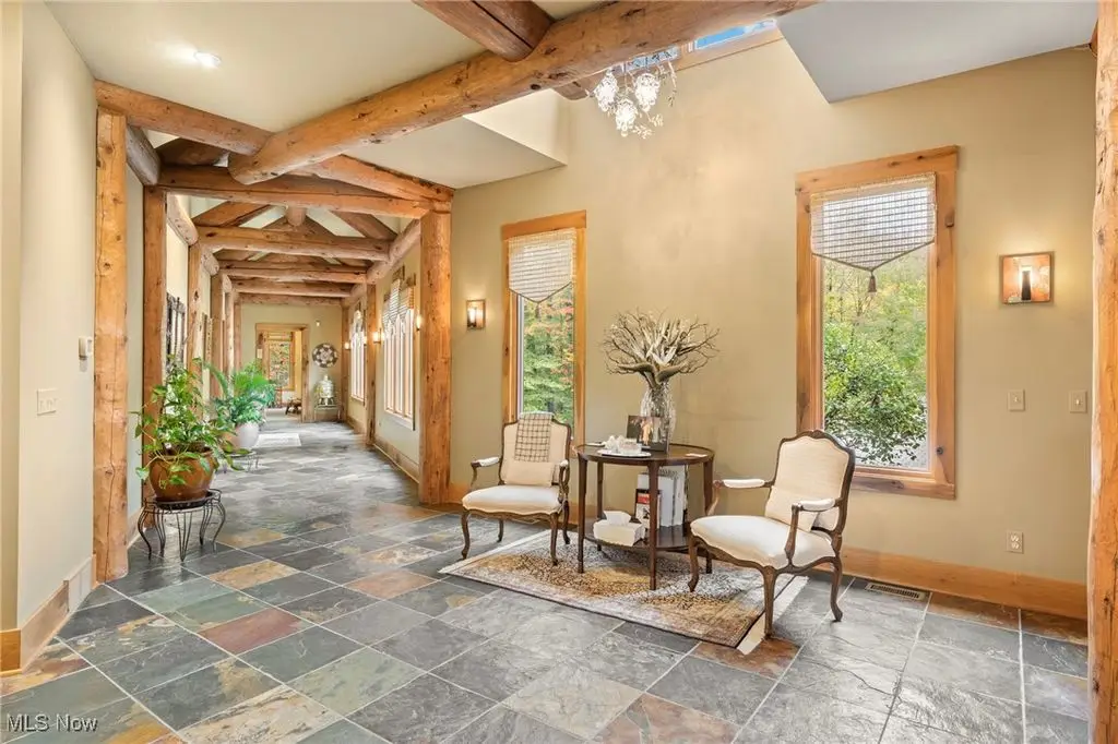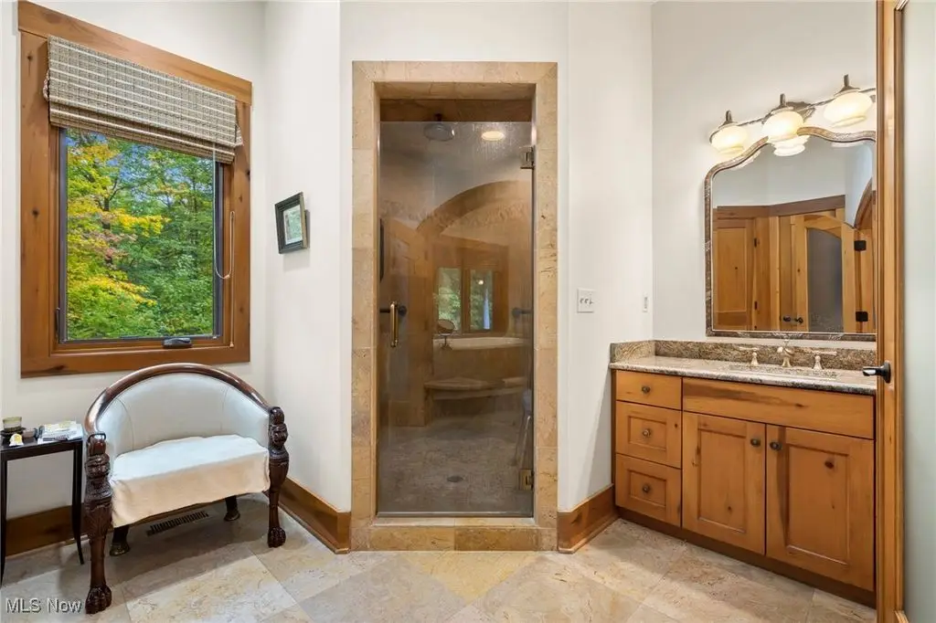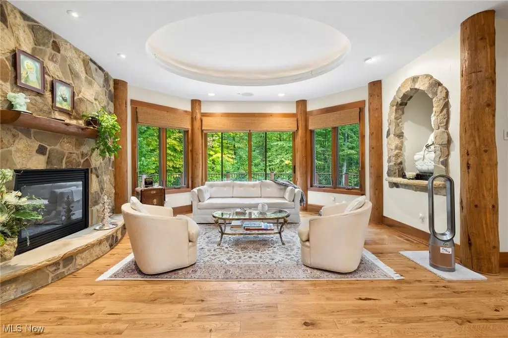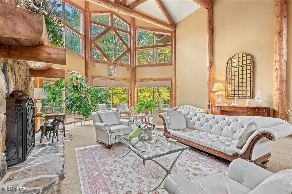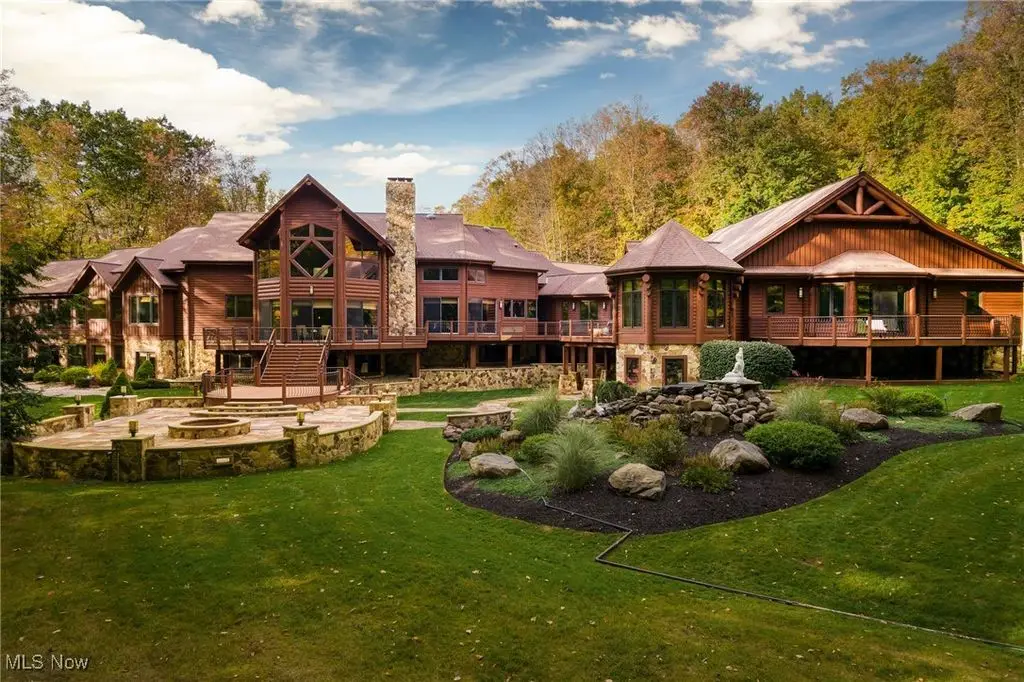 Nestled in the most spectacular almost 18 acre enclave, this private retreat unveils a breathtaking sanctuary, where nature's grandeur converges with the elegance of a stone and timber mountain modern home! The property with Chagrin River frontage sprawls over pristine wilderness and fabulously landscaped grounds, affording absolute seclusion and serenity. Enter through a spectacular gated entrance and travel down the meandering driveway unveiling the stunning residence! The home's exterior is a harmonious blend of stone and timber and integrates perfectly into its natural surrounding! Walking through the front door, one will immediately notice the soaring ceilings, walls of windows, and open design concept! This home is an exquisite balance of rugged and refined! The main great room boasts a cathedral ceiling adorned with exposed timber beams and a magnificent two story stone fireplace! Open to the great room is the incredible gourmet kitchen which is designed for entertaining and features a huge dining room area with fireplace, immense center island , and high end appliances! Each bedroom area on the main level is a private suite! The owner's wing is absolutely luxurious beyond compare offering a library, private kitchen, spectacular bedroom, sitting room, dual bathrooms, walk-in dressing rooms, and more! The walk out lower level is yet another incredible space with multiple entertaining rooms, bedroom suites, and even a television studio! 6+ car garage! One of a kind!!