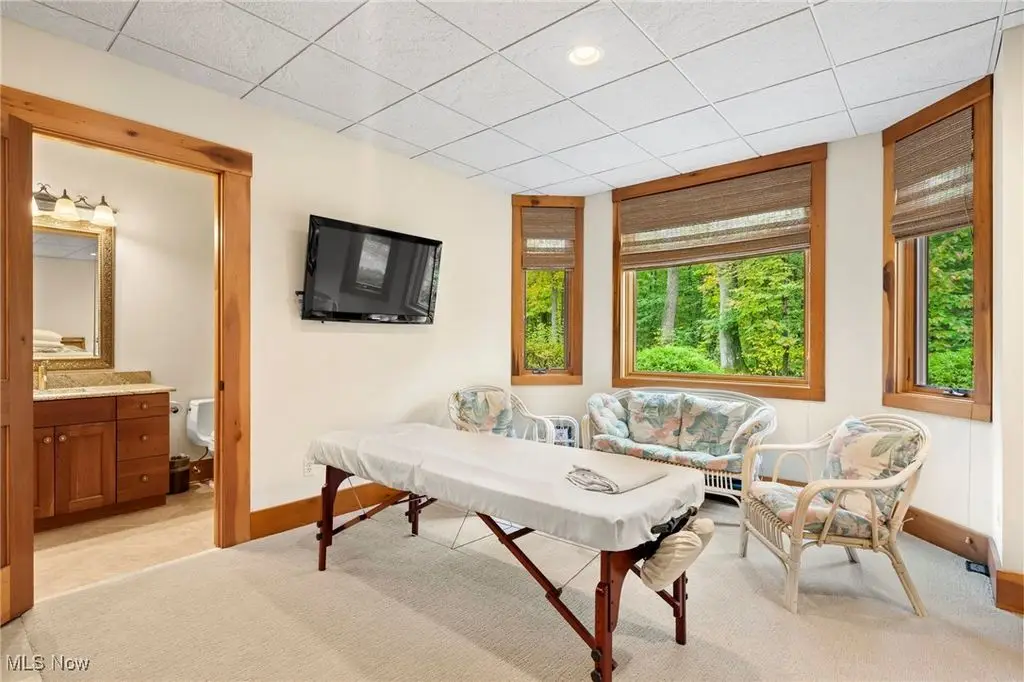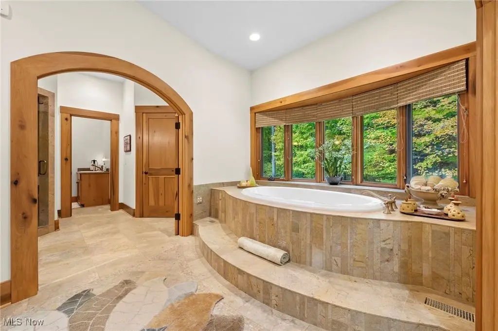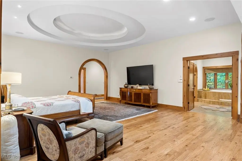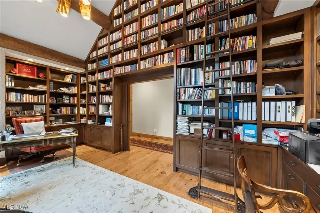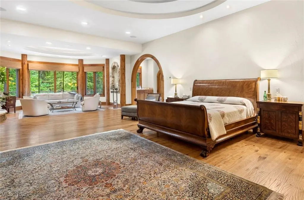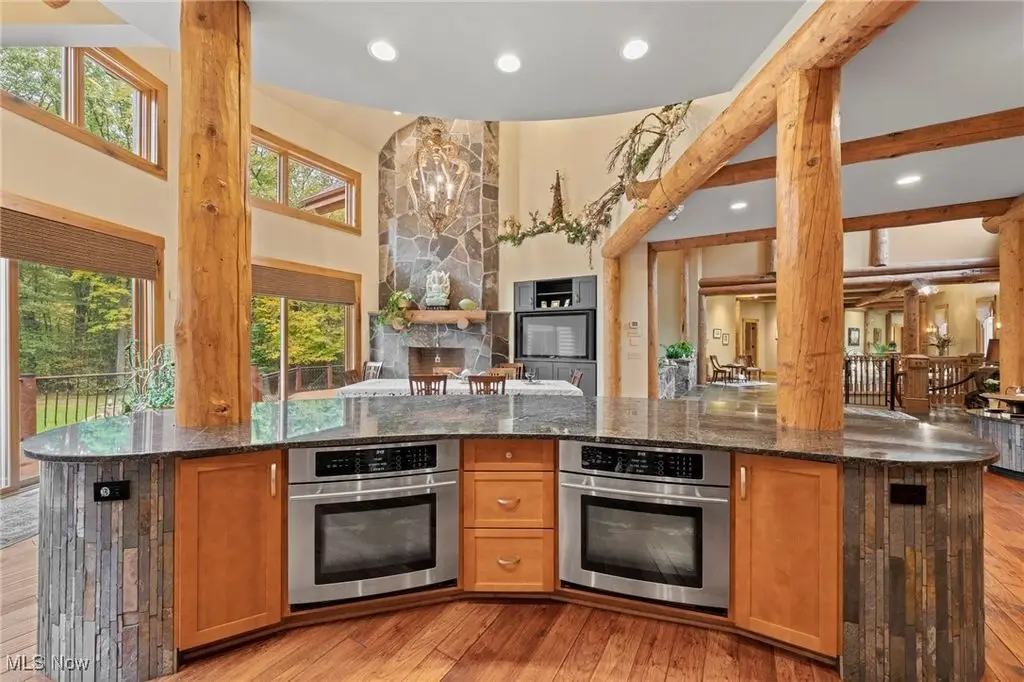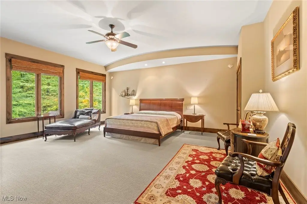 Nestled in the most spectacular almost 18 acre enclave, this private retreat unveils a breathtaking sanctuary, where nature's grandeur converges with the elegance of a stone and timber mountain modern home! The property with Chagrin River frontage sprawls over pristine wilderness and fabulously landscaped grounds, affording absolute seclusion and serenity. Enter through a spectacular gated entrance and travel down the meandering driveway unveiling the stunning residence! The home's exterior is a harmonious blend of stone and timber and integrates perfectly into its natural surrounding! Walking through the front door, one will immediately notice the soaring ceilings, walls of windows, and open design concept! This home is an exquisite balance of rugged and refined! The main great room boasts a cathedral ceiling adorned with exposed timber beams and a magnificent two story stone fireplace! Open to the great room is the incredible gourmet kitchen which is designed for entertaining and features a huge dining room area with fireplace, immense center island , and high end appliances! Each bedroom area on the main level is a private suite! The owner's wing is absolutely luxurious beyond compare offering a library, private kitchen, spectacular bedroom, sitting room, dual bathrooms, walk-in dressing rooms, and more! The walk out lower level is yet another incredible space with multiple entertaining rooms, bedroom suites, and even a television studio! 6+ car garage! One of a kind!!