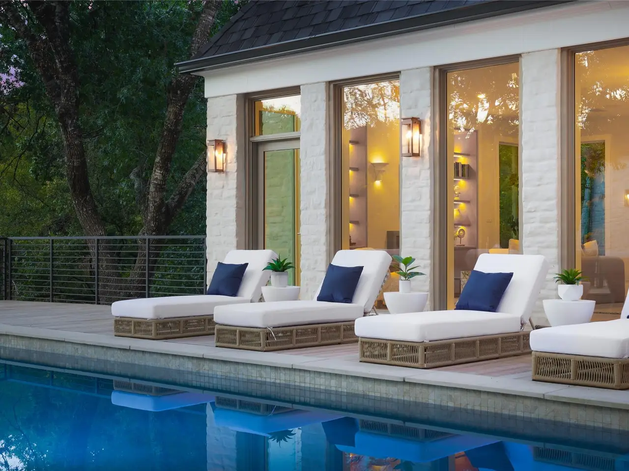 Glistening pool in lush backyard