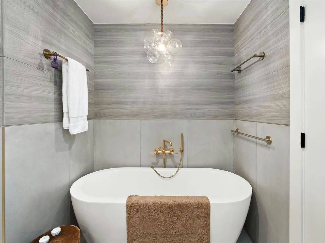 Rounded marble shelves in shower