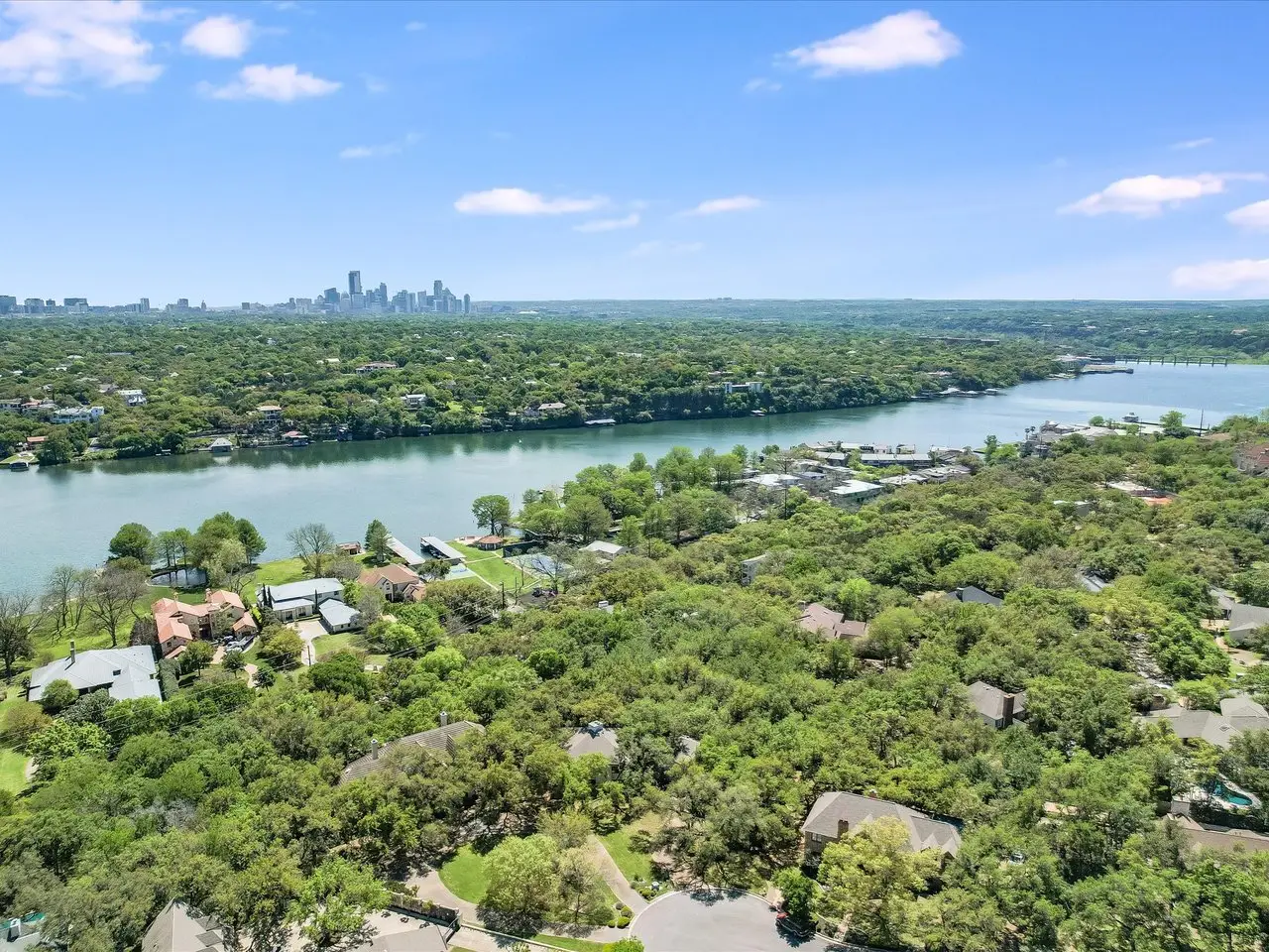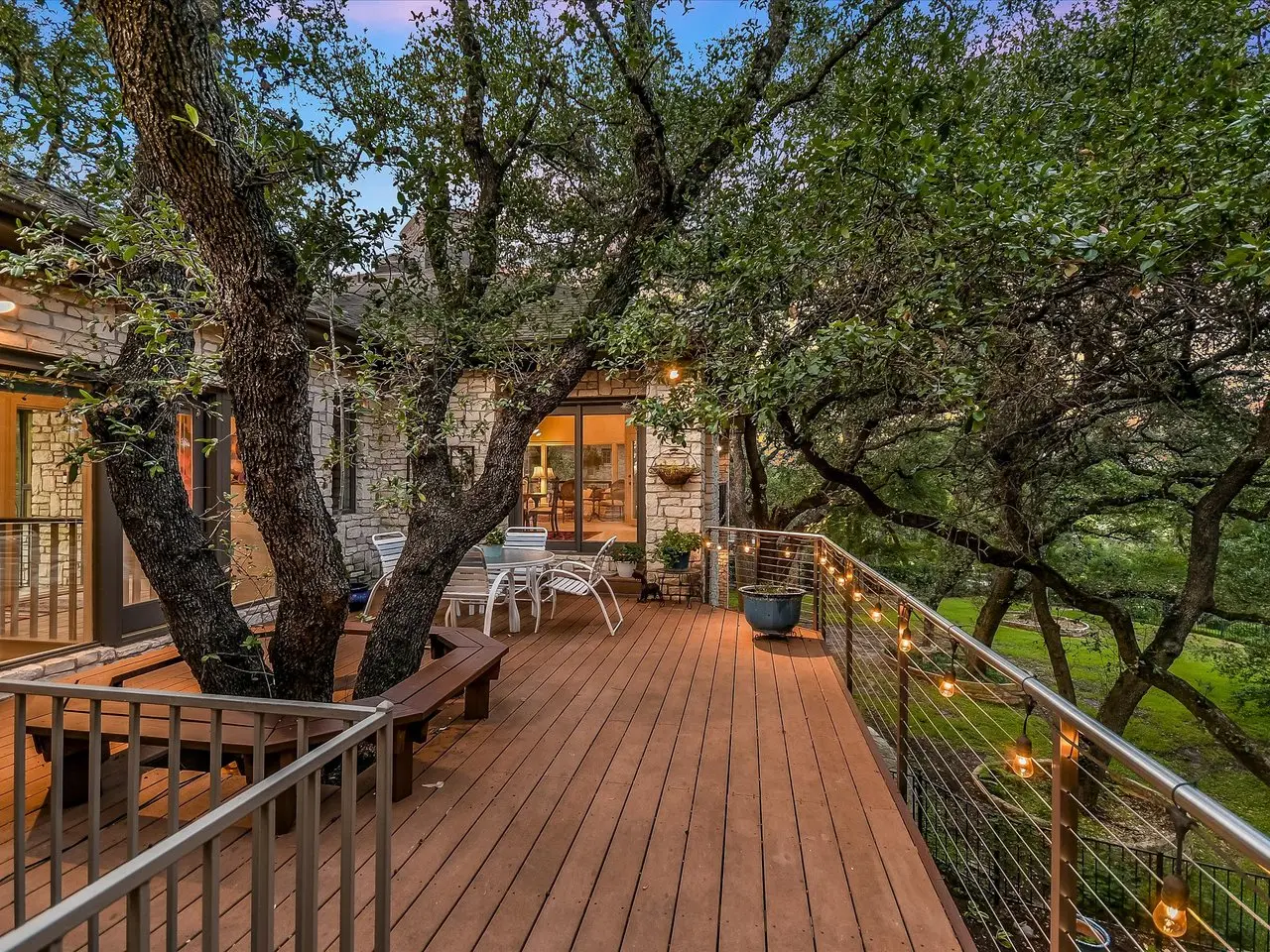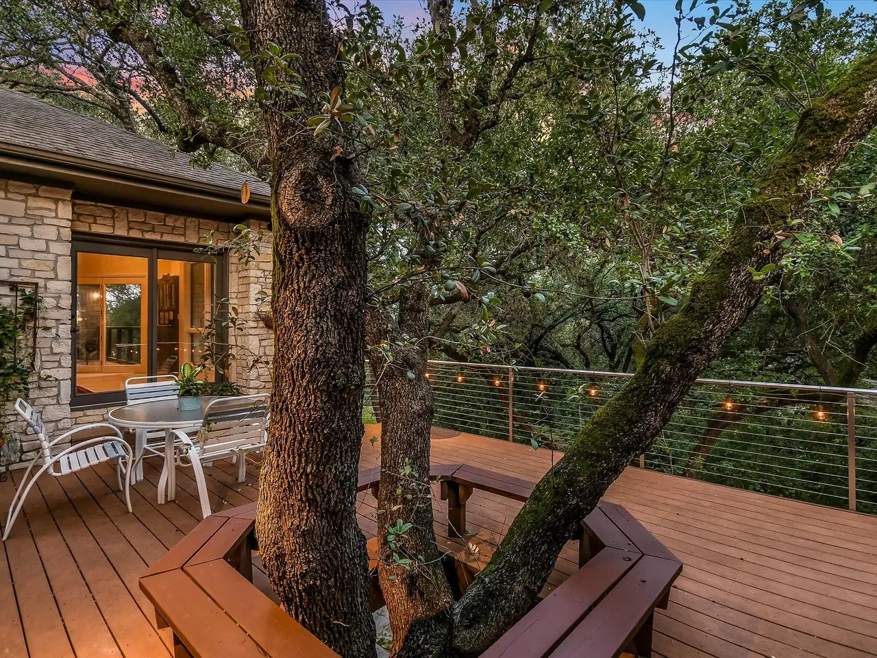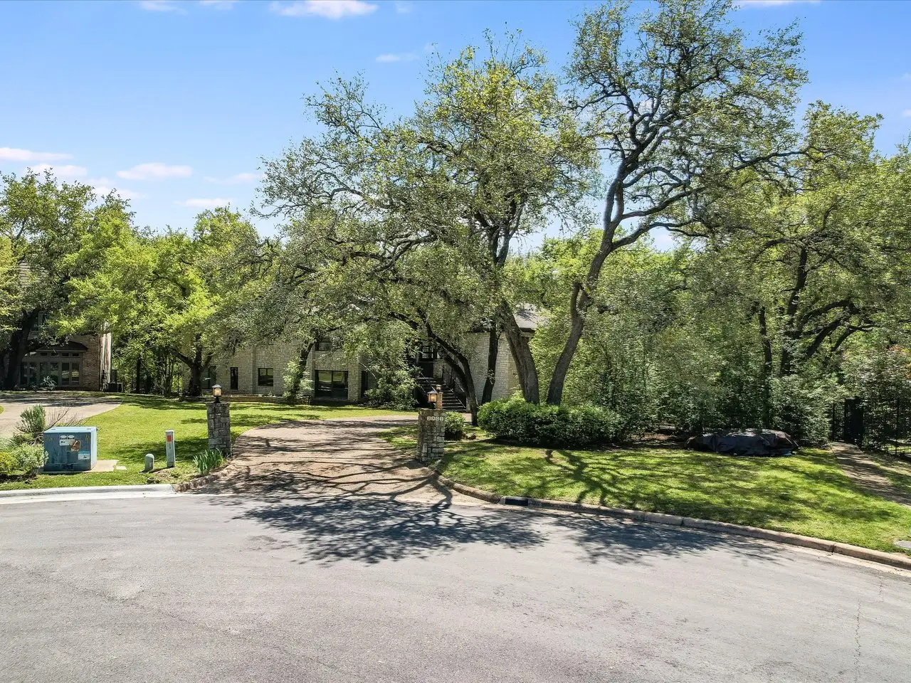 Come live in the treetops of this uniquely contemporary style home in the West Rim subdivision. Situated on a .78 acre lot and surrounded by magnificent oak trees, large picture windows capture the outside beauty from every angle. The second level entry opens to a stunning view of greenery which gives the feeling of living in the treetops. Cathedral ceilings and a dramatic fireplace highlight the upstairs living space. The spacious kitchen includes a center island, cozy breakfast seating, tons of storage. The formal dining space includes a wet bar and beverage refrigerator. A formal living area overlooks the front yard while a cozy seating arrangement by the fireplace looks out to the back yard. Also included on the second level are two secondary bedrooms, one full bath and one half bath. The downstairs area features an expansive primary bedroom which includes a living/study area with a fireplace, both looking out to the tree shaded back yard. A massive walk in closet and large primary bathroom provide everything needed for comfortable living. A large additional secondary bedroom and bath is also located downstairs. The home has been meticulously maintained and updated over the years. It is ready to be moved into or remodeled as desired. The private backyard is large enough for a pool with plenty of space to play. There is a "secret" garden at the back of the property with a patio and water feature. Upstairs and downstairs decks provide covered spaces for enjoying nature. West Rim subdivision enjoys an enviable park on Lake Austin just a short walk from this property. Owned by the HOA, the park includes boat slips, day dock, gazebo with barbeque, picnic tables, tennis court, sport court and separately gated playground.