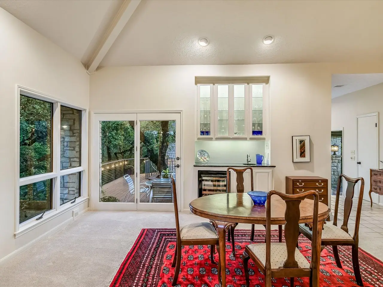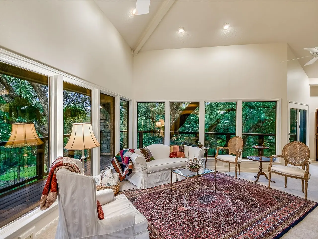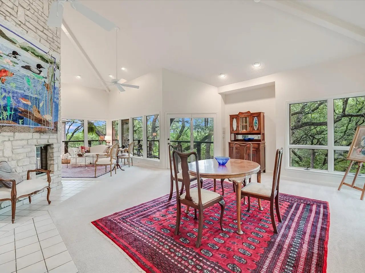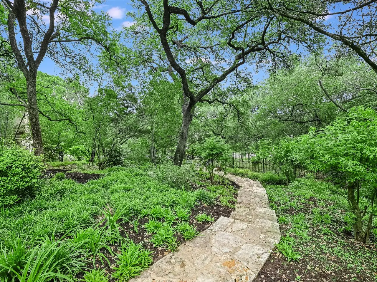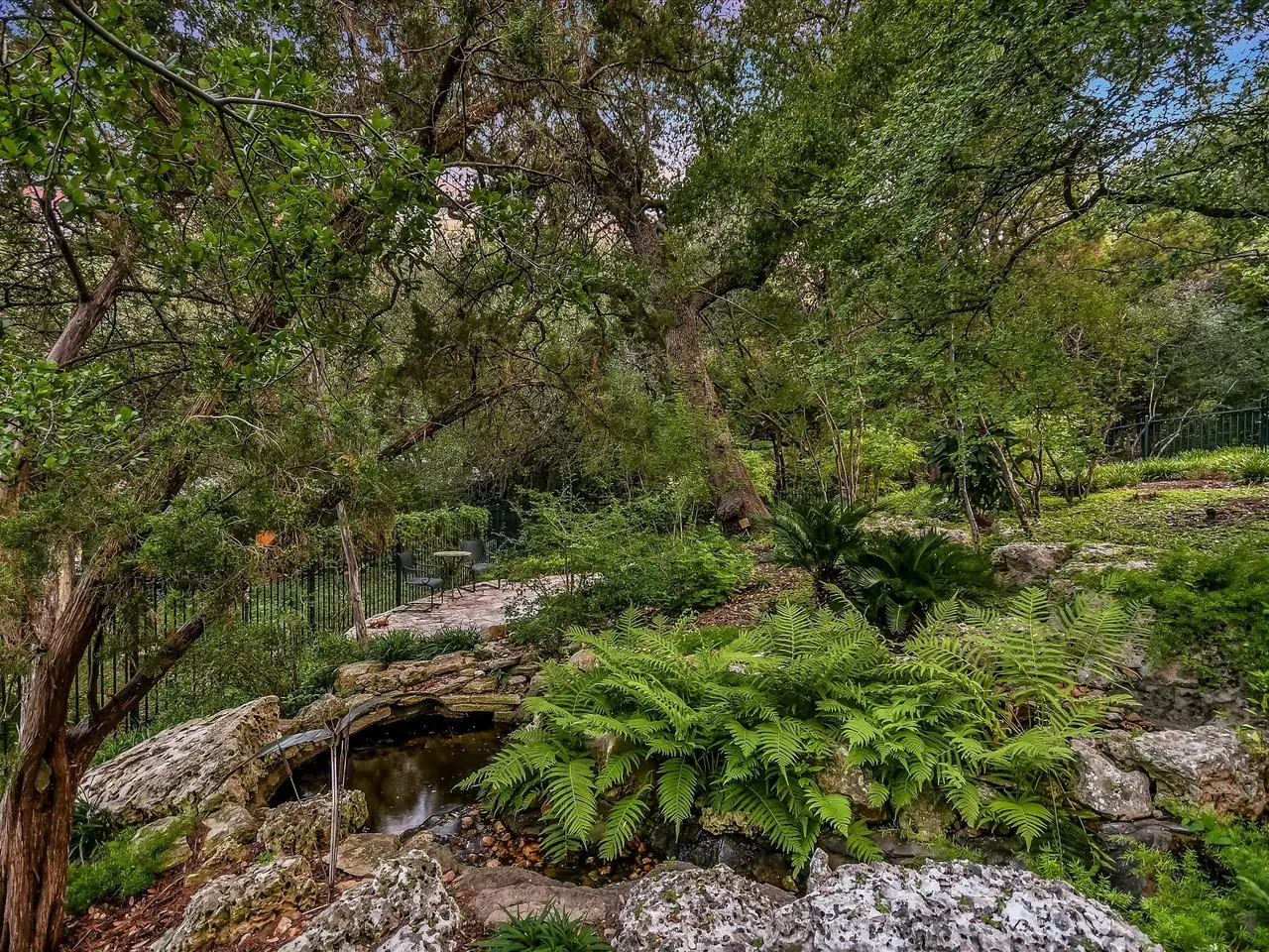 Come live in the treetops of this uniquely contemporary style home in the West Rim subdivision. Situated on a .78 acre lot and surrounded by magnificent oak trees, large picture windows capture the outside beauty from every angle. The second level entry opens to a stunning view of greenery which gives the feeling of living in the treetops. Cathedral ceilings and a dramatic fireplace highlight the upstairs living space. The spacious kitchen includes a center island, cozy breakfast seating, tons of storage. The formal dining space includes a wet bar and beverage refrigerator. A formal living area overlooks the front yard while a cozy seating arrangement by the fireplace looks out to the back yard. Also included on the second level are two secondary bedrooms, one full bath and one half bath. The downstairs area features an expansive primary bedroom which includes a living/study area with a fireplace, both looking out to the tree shaded back yard. A massive walk in closet and large primary bathroom provide everything needed for comfortable living. A large additional secondary bedroom and bath is also located downstairs. The home has been meticulously maintained and updated over the years. It is ready to be moved into or remodeled as desired. The private backyard is large enough for a pool with plenty of space to play. There is a "secret" garden at the back of the property with a patio and water feature. Upstairs and downstairs decks provide covered spaces for enjoying nature. West Rim subdivision enjoys an enviable park on Lake Austin just a short walk from this property. Owned by the HOA, the park includes boat slips, day dock, gazebo with barbeque, picnic tables, tennis court, sport court and separately gated playground.