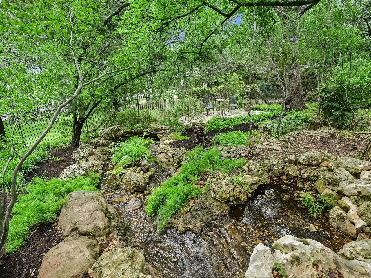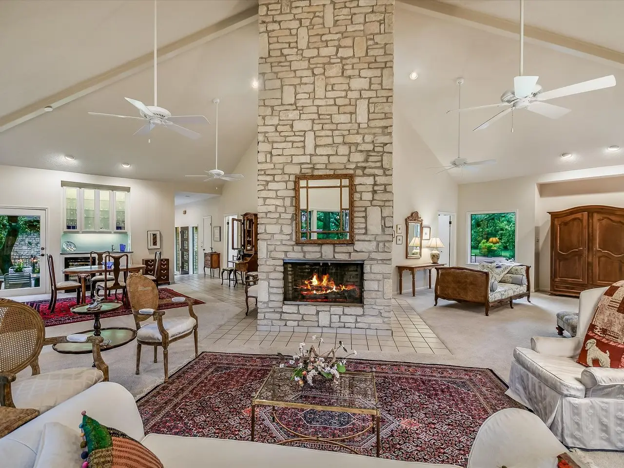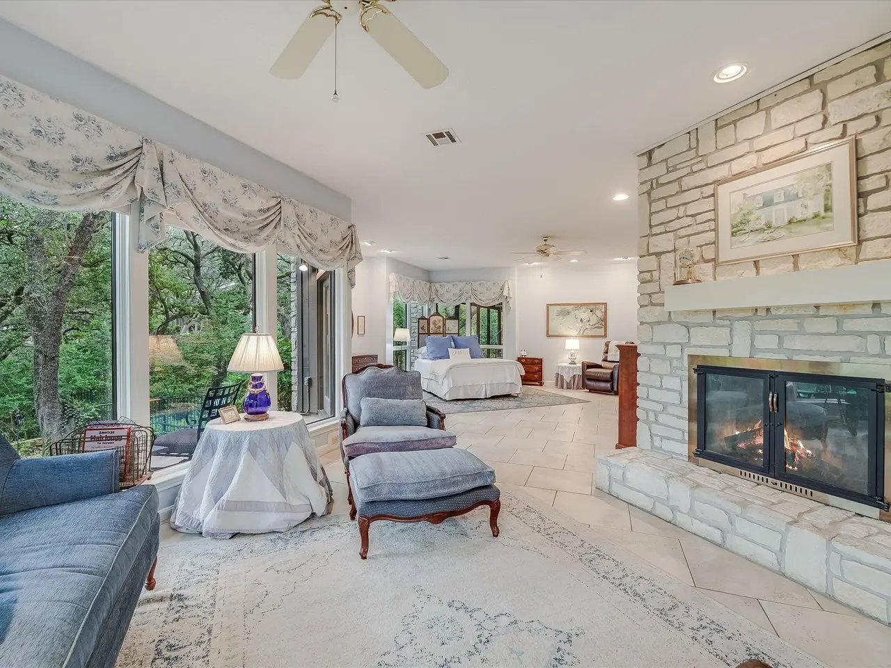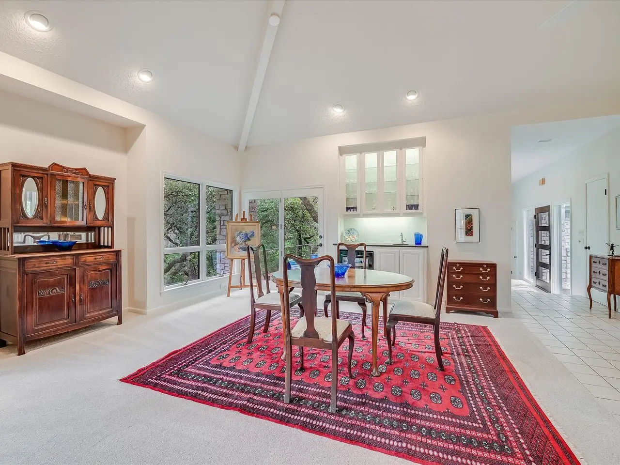 Come live in the treetops of this uniquely contemporary style home in the West Rim subdivision. Situated on a .78 acre lot and surrounded by magnificent oak trees, large picture windows capture the outside beauty from every angle. The second level entry opens to a stunning view of greenery which gives the feeling of living in the treetops. Cathedral ceilings and a dramatic fireplace highlight the upstairs living space. The spacious kitchen includes a center island, cozy breakfast seating, tons of storage. The formal dining space includes a wet bar and beverage refrigerator. A formal living area overlooks the front yard while a cozy seating arrangement by the fireplace looks out to the back yard. Also included on the second level are two secondary bedrooms, one full bath and one half bath. The downstairs area features an expansive primary bedroom which includes a living/study area with a fireplace, both looking out to the tree shaded back yard. A massive walk in closet and large primary bathroom provide everything needed for comfortable living. A large additional secondary bedroom and bath is also located downstairs. The home has been meticulously maintained and updated over the years. It is ready to be moved into or remodeled as desired. The private backyard is large enough for a pool with plenty of space to play. There is a "secret" garden at the back of the property with a patio and water feature. Upstairs and downstairs decks provide covered spaces for enjoying nature. West Rim subdivision enjoys an enviable park on Lake Austin just a short walk from this property. Owned by the HOA, the park includes boat slips, day dock, gazebo with barbeque, picnic tables, tennis court, sport court and separately gated playground.
