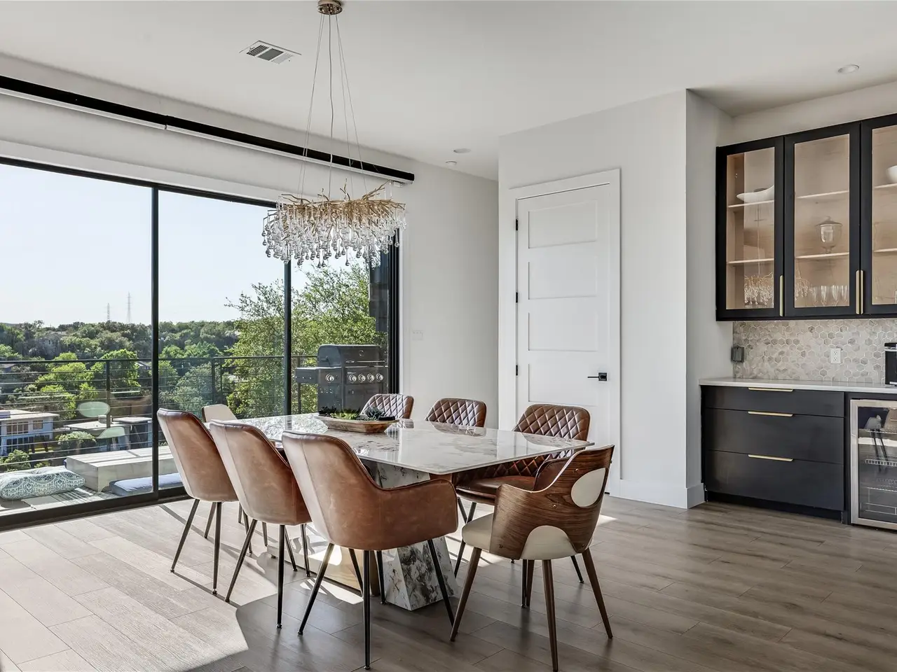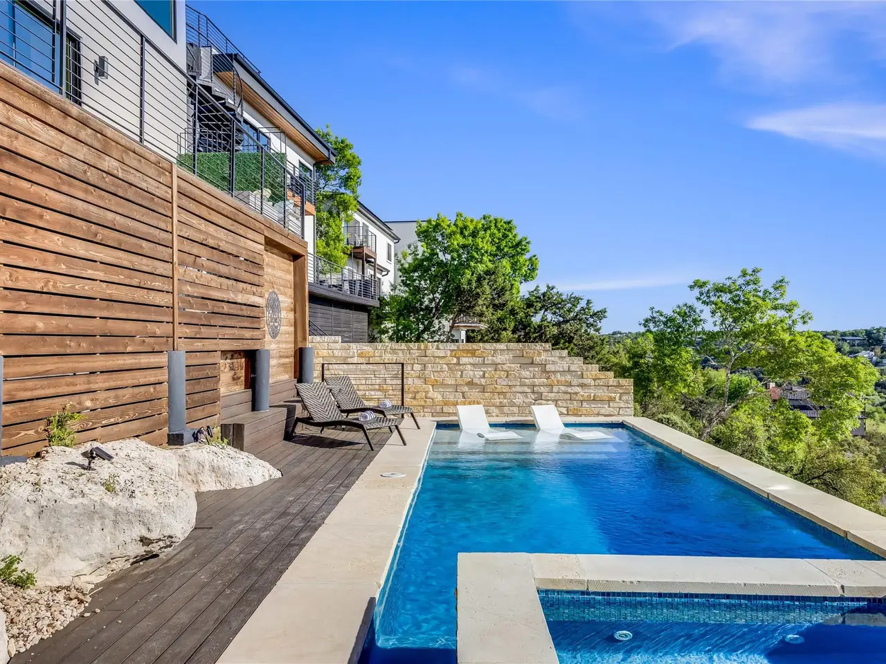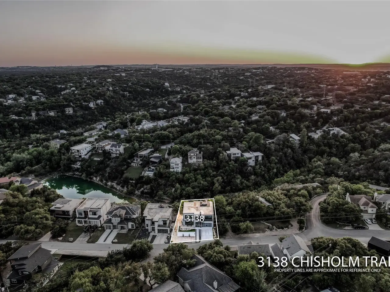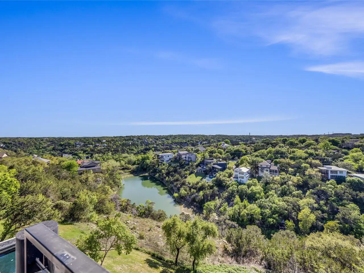 Nestled in the serene enclave of Apache Shores, Firefly Canyon is a breathtaking modern retreat offering panoramic views and a coveted setting backing onto Apache Shores Lake, a tranquil, creek-fed oasis. This stunning home boasts five spacious bedrooms and four luxurious bathrooms, designed with an open-concept layout that seamlessly blends style and functionality. The chef's kitchen features high-end stainless steel appliances, expansive quartz countertops, a waterfall island, and sleek European-inspired cabinetry. The generous dining area is framed by elegant sliding glass doors, opening onto a sprawling outdoor patio that invites effortless indoor-outdoor living. Designed for both relaxation and entertaining, this home offers a private rooftop deck, a cozy fire pit, and a heatable pool and spa--all set against the backdrop of breathtaking lake views. The primary suite is a true retreat, featuring a private balcony and a spa-inspired bathroom. Perfectly situated just 10 minutes from Lakeway and 20 minutes from downtown Austin, Firefly Canyon balances privacy with convenience. Its prime location and luxurious amenities make it an outstanding investment opportunity, offering top-tier rental potential year-round in Austin's thriving vacation market. With easy access to Lady Bird Lake, Lake Travis, top-ranked schools, medical facilities, scenic hiking trails, and premier shopping and dining, this exceptional property delivers an unparalleled lifestyle in one of Austin's most sought-after communities.