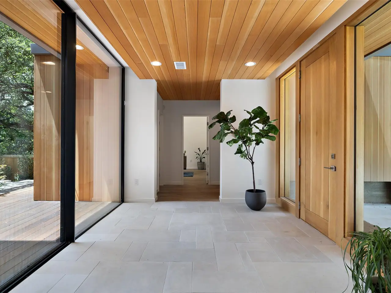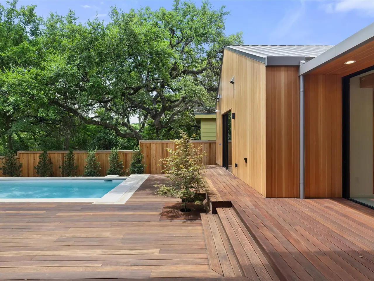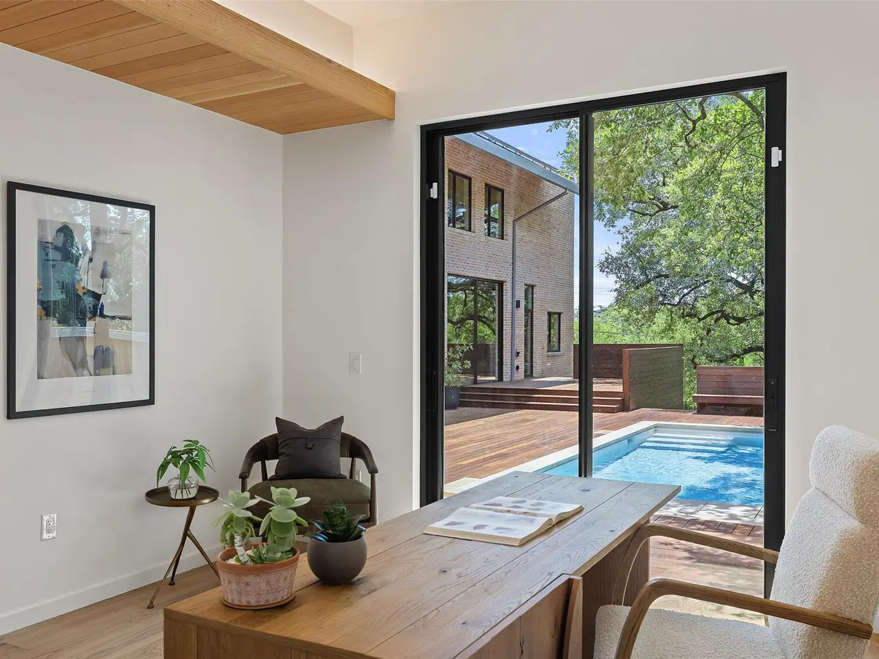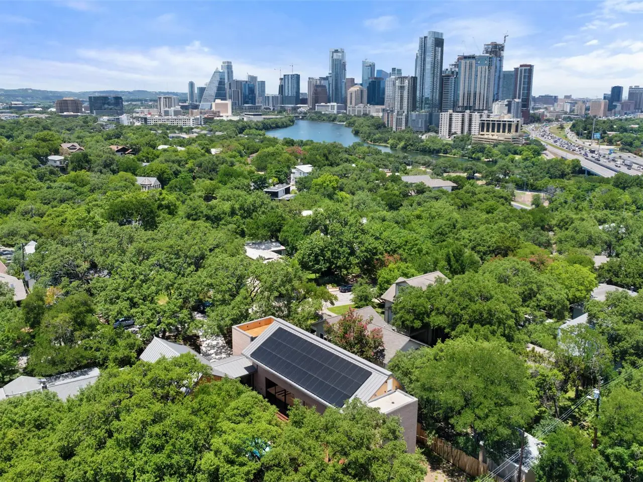 This extraordinary new construction with masterful architectural attention to space and light provides the rare opportunity to live in a modern luxury home in Travis Heights. Surrounded by majestic live oaks, this thoughtfully designed home maximizes indoor/outdoor living, with a show- stopping wall of sliding glass doors connecting the entire first floor to a sweeping Brazilian hardwood deck and pool. Every detail focuses on first-class materials that bring nature inside. Beautiful hardwoods, marble, quartzite, and handmade tile imbue the home with warm sophistication. Gathering areas feel both intimate and expansive with a huge entertaining kitchen containing two sinks, two dishwashers and butler pantry, and a generous open living/dining area. The primary suite features a large closet, wood- wrapped spa bath, walk-in shower, and ample storage. Two spacious ensuite bedrooms with walk-in closets and laundry complete the second floor, and the third floor provides a bonus attic space and wonderful roof terrace in the treetops with downtown views. The guest suite is conveniently located off the entry and a flex suite for an office, gym, or nanny suite resides next to the pool. This custom home is exceptional for its smart, sustainable design and construction quality. A full solar roof array provides significant energy savings, and a large two-car garage is wired for EV charging. A security system is installed, along with hard wiring to each room to meet every digital desire. All materials were vetted for sustainability including Forest Stewardship Certified wood, low/no-VOC paints, and no-VOC foam insulation. With care taken at every stage from framing to finish out, this energy-efficient home is built to last. Full of historic charm, tree-lined streets, and parks, Travis Heights is steps away from Lady Bird Lake, South Congress, and the East Side. This gorgeous home promises you can have it all: the very best of Austin downtown and neighborhood living.