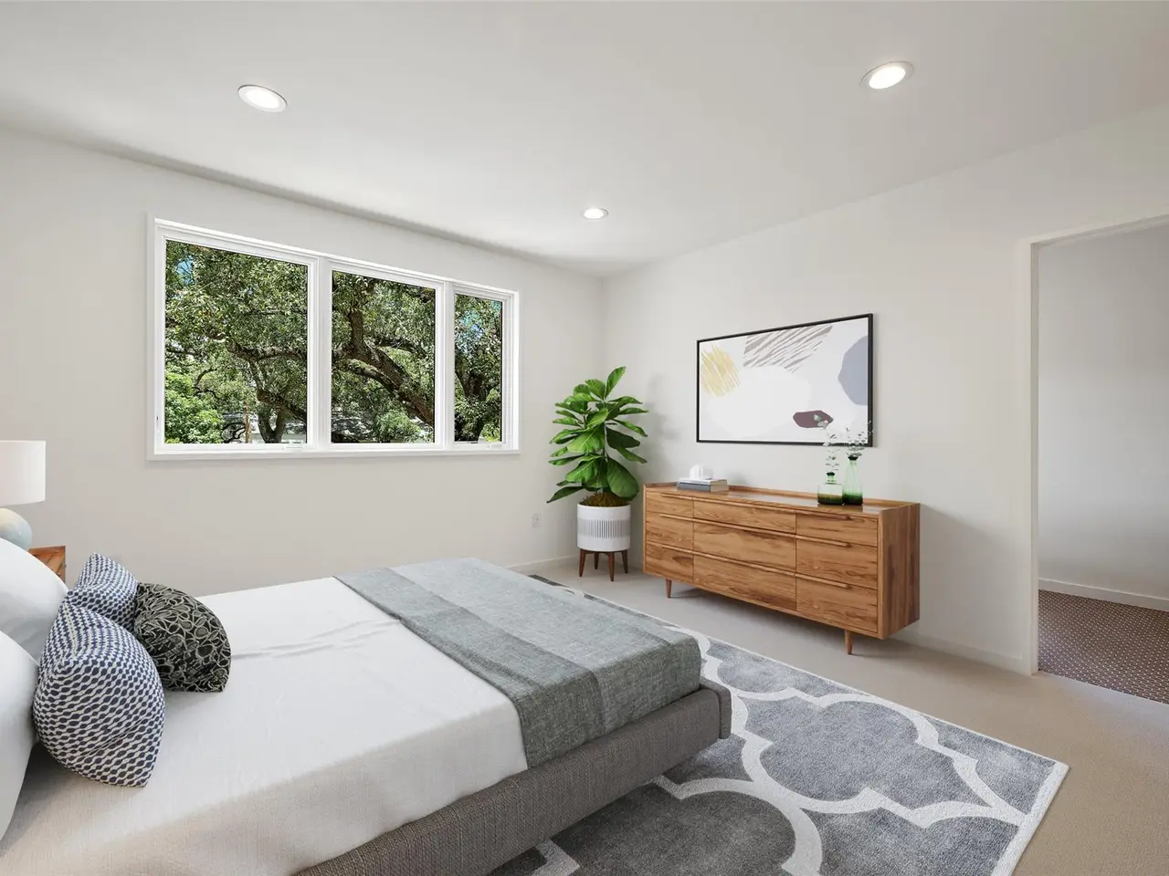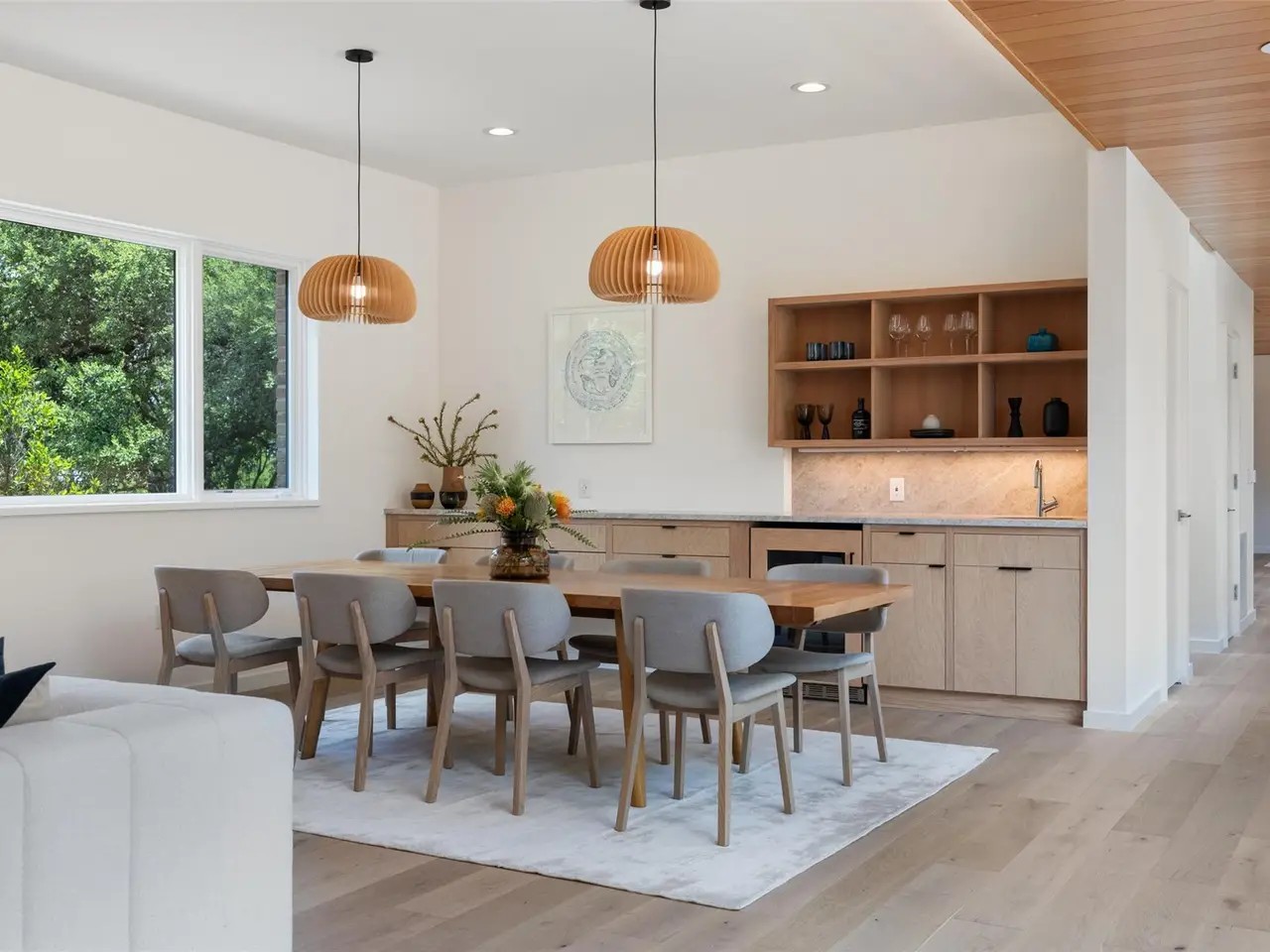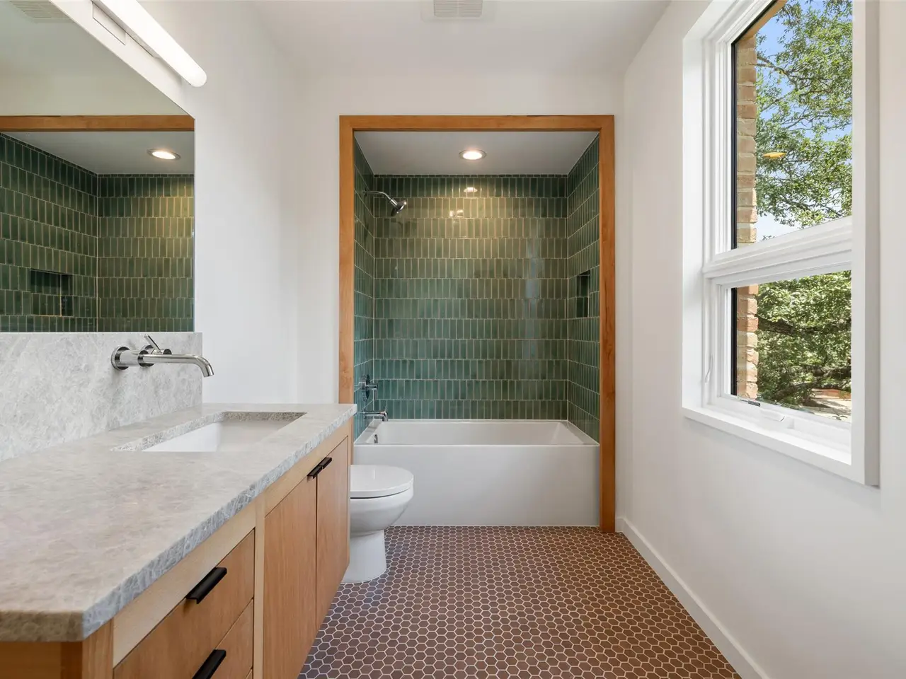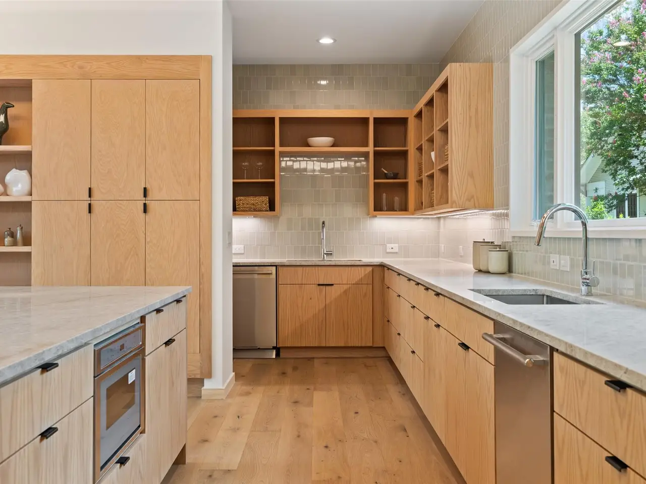 This extraordinary new construction with masterful architectural attention to space and light provides the rare opportunity to live in a modern luxury home in Travis Heights. Surrounded by majestic live oaks, this thoughtfully designed home maximizes indoor/outdoor living, with a show- stopping wall of sliding glass doors connecting the entire first floor to a sweeping Brazilian hardwood deck and pool. Every detail focuses on first-class materials that bring nature inside. Beautiful hardwoods, marble, quartzite, and handmade tile imbue the home with warm sophistication. Gathering areas feel both intimate and expansive with a huge entertaining kitchen containing two sinks, two dishwashers and butler pantry, and a generous open living/dining area. The primary suite features a large closet, wood- wrapped spa bath, walk-in shower, and ample storage. Two spacious ensuite bedrooms with walk-in closets and laundry complete the second floor, and the third floor provides a bonus attic space and wonderful roof terrace in the treetops with downtown views. The guest suite is conveniently located off the entry and a flex suite for an office, gym, or nanny suite resides next to the pool. This custom home is exceptional for its smart, sustainable design and construction quality. A full solar roof array provides significant energy savings, and a large two-car garage is wired for EV charging. A security system is installed, along with hard wiring to each room to meet every digital desire. All materials were vetted for sustainability including Forest Stewardship Certified wood, low/no-VOC paints, and no-VOC foam insulation. With care taken at every stage from framing to finish out, this energy-efficient home is built to last. Full of historic charm, tree-lined streets, and parks, Travis Heights is steps away from Lady Bird Lake, South Congress, and the East Side. This gorgeous home promises you can have it all: the very best of Austin downtown and neighborhood living.