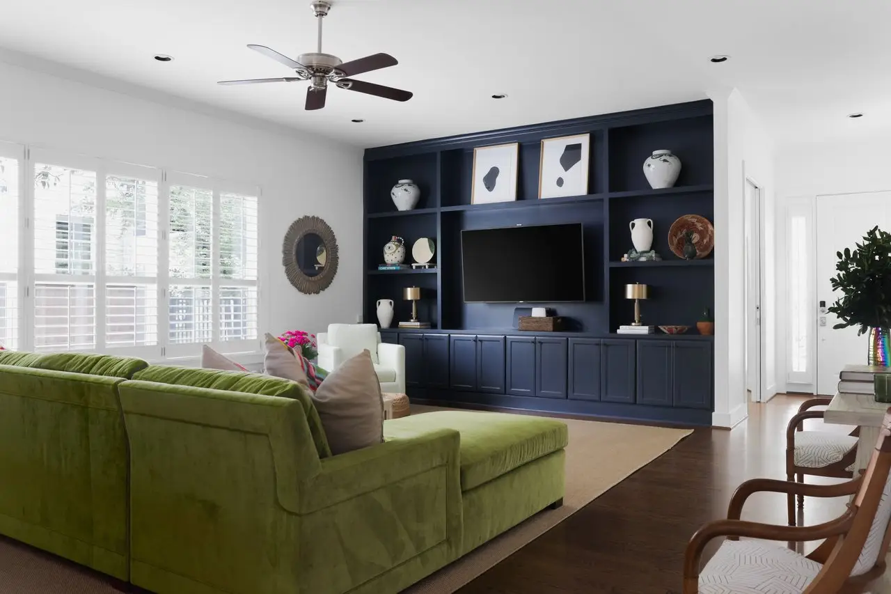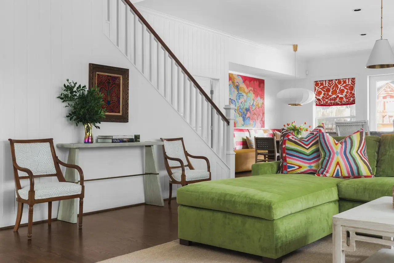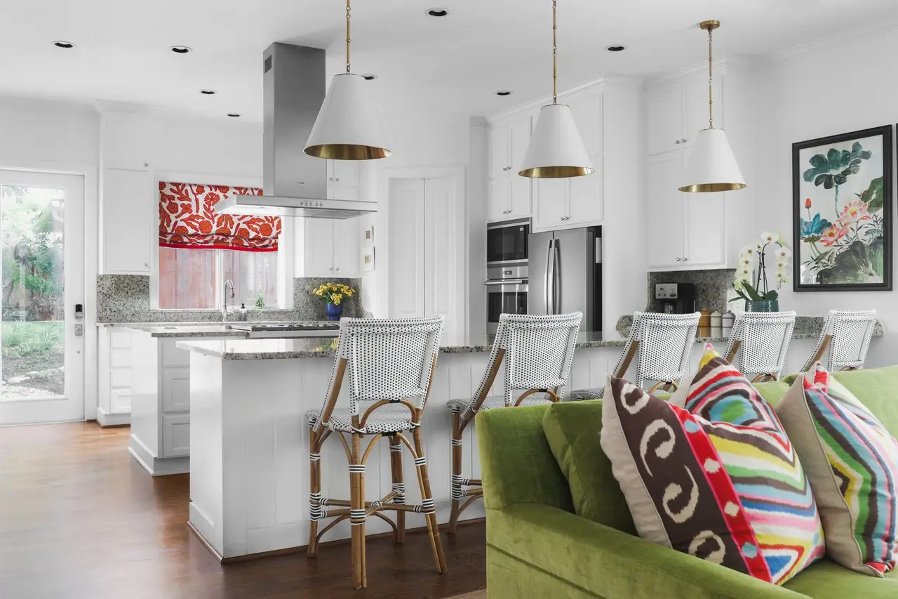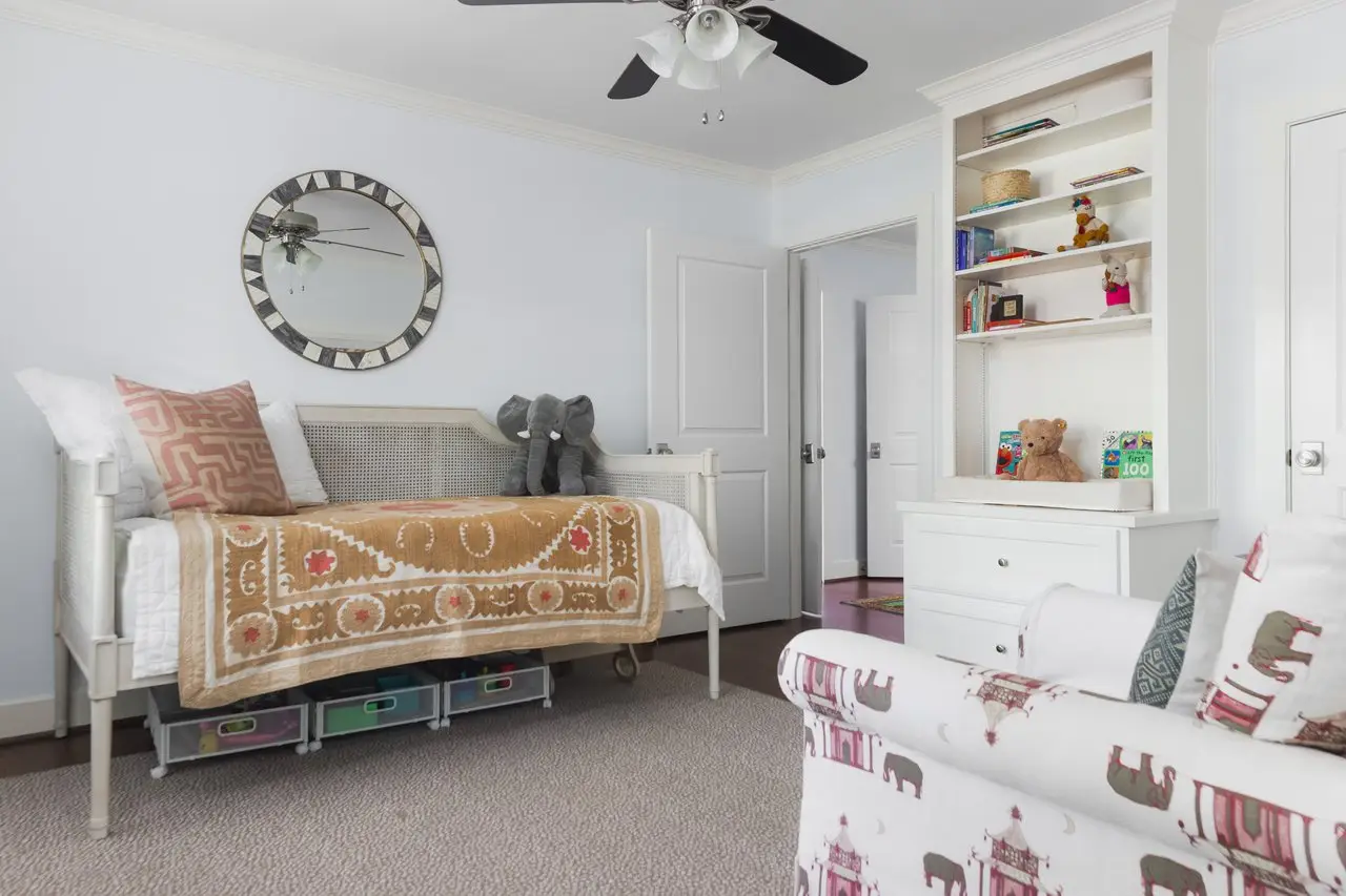Situated on a spacious quarter acre lot in the heart of Tarrytown, this home boasts a 5 or 6 bedroom, 4.5 bath floorplan offering light filled spaces, colorful accents and easy living. As you enter, you are greeted with a bright, cheerful and spacious open living, dining and kitchen area. Gorgeous wood floors, custom white shutters, touches of wallpaper and a fun pop of color on the stair runner. A light filled sitting room or office overlooking the lush front yard includes built-in storage and shelving. The expansive living space is also anchored by millwork including shelving, storage and media area. The kitchen includes a 6-burner gas Wolf range, double ovens, walk-in pantry, plentiful storage and oversized breakfast bar and island. The adjacent dining area includes built-in bench seating – beautifully upholstered in sunny yellow. An entertainer’s delight! The current floorplan utilizes 3 bedrooms downstairs and 3 bedrooms upstairs, with the primary bedroom located on the second level overlooking the treetops and backyard. The primary bath features an oversized dual shower, dual vanities and two walk-in closets. As an option, there is plenty of flexibility to utilize some rooms as office and gym spaces, or additional living. The generously sized turfed backyard has ample room for play, grilling, dining and gardening. A wood deck offers a space for dining al fresco under gorgeous mature trees. The gated driveway leads to a two car garage. Don’t miss this fantastic opportunity to live in one of Austin’s most desirable neighborhoods. Walkable tree-lined streets, close to shopping, dining, trails and the best of Austin. www.2106schulleave.com