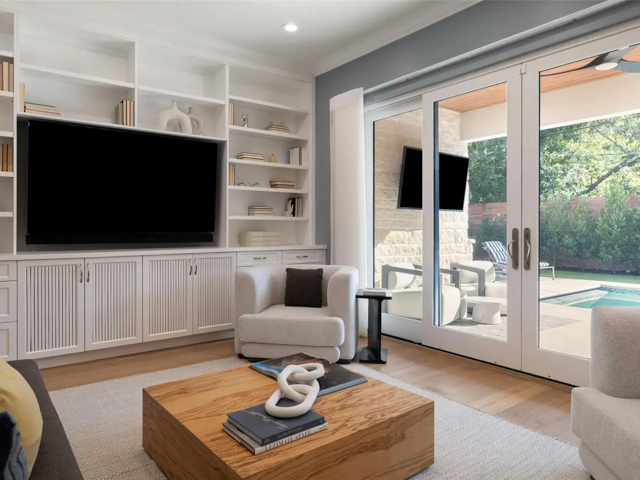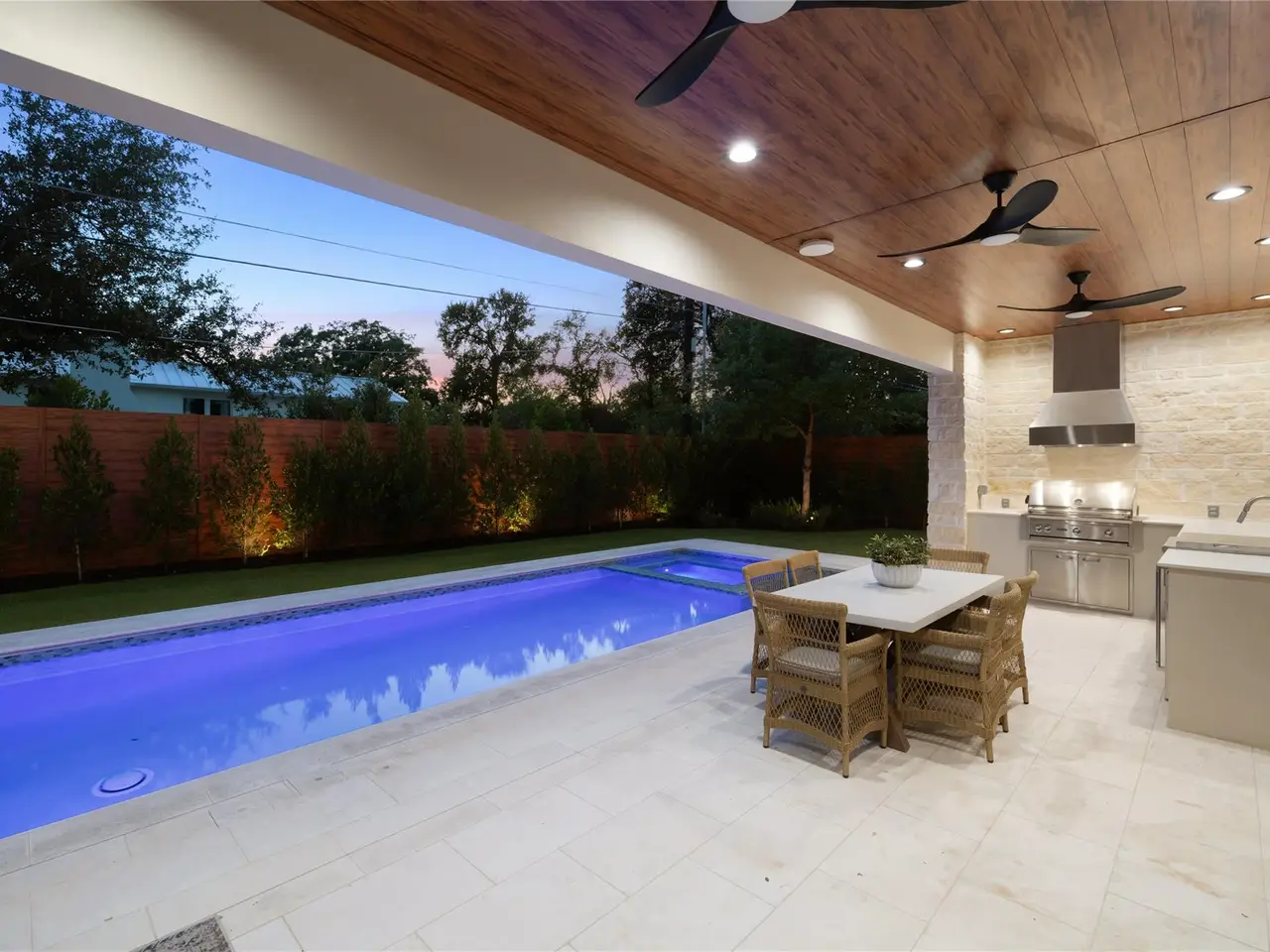 Outdoor kitchen w/ sparkling pool