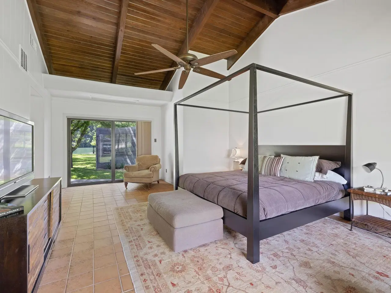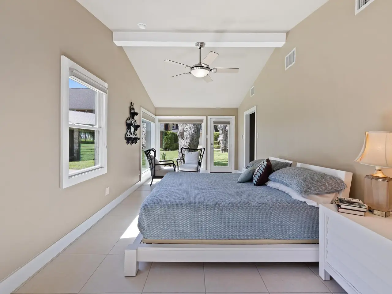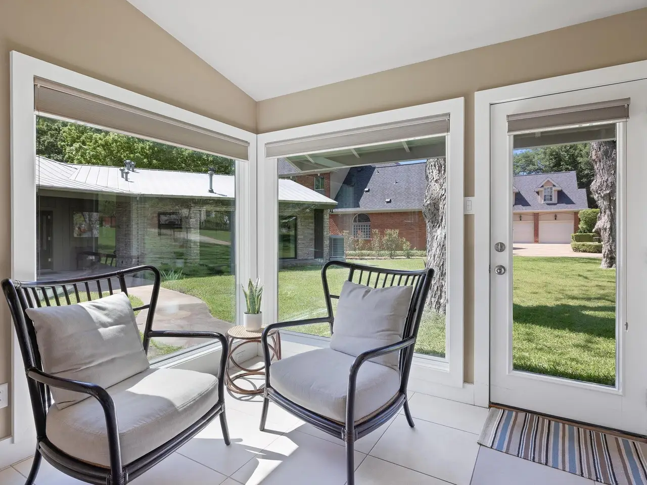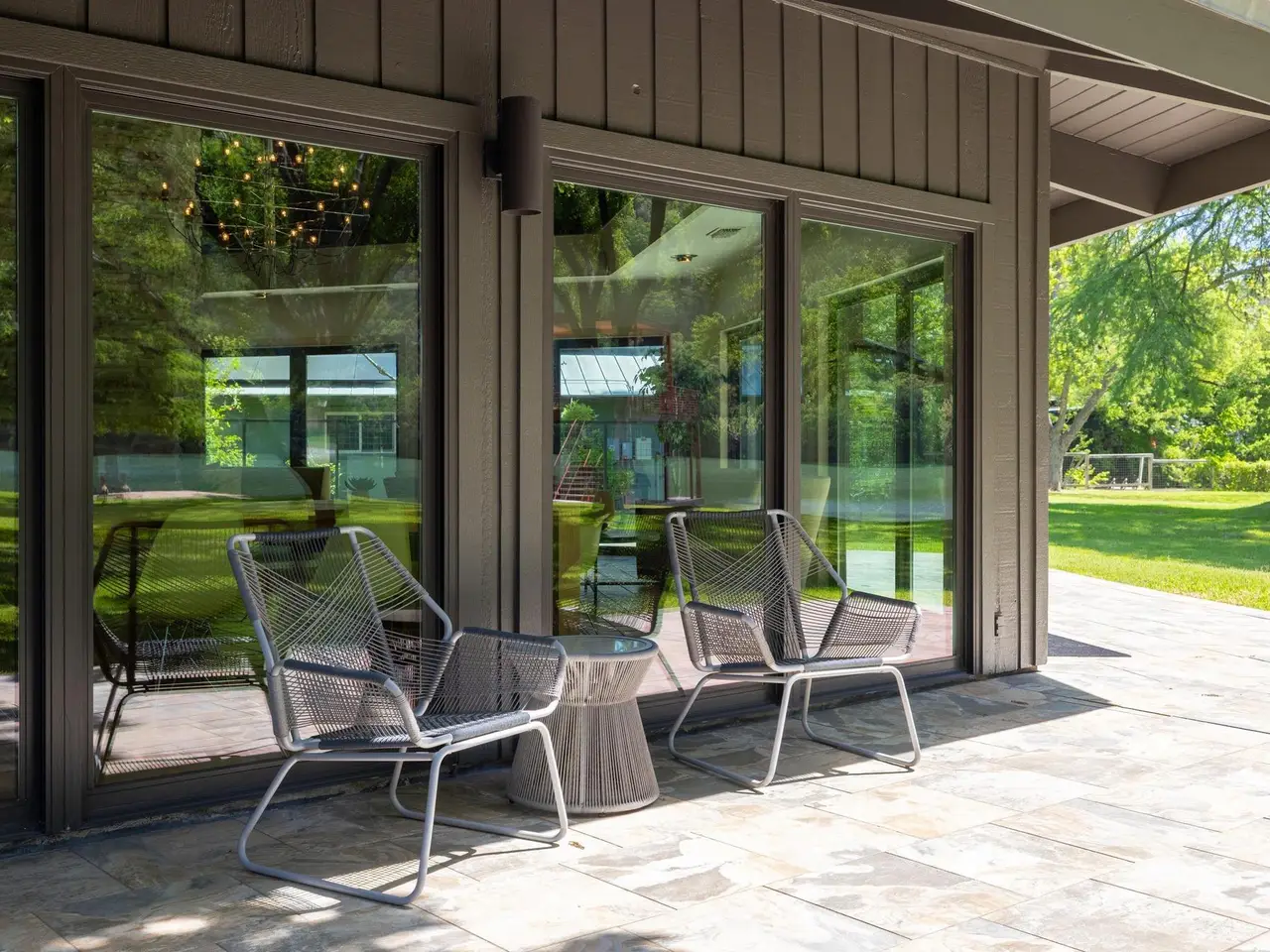 Sliding glass doors opening to flat lawn