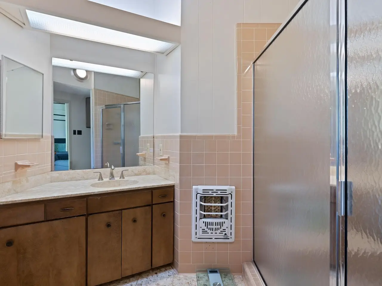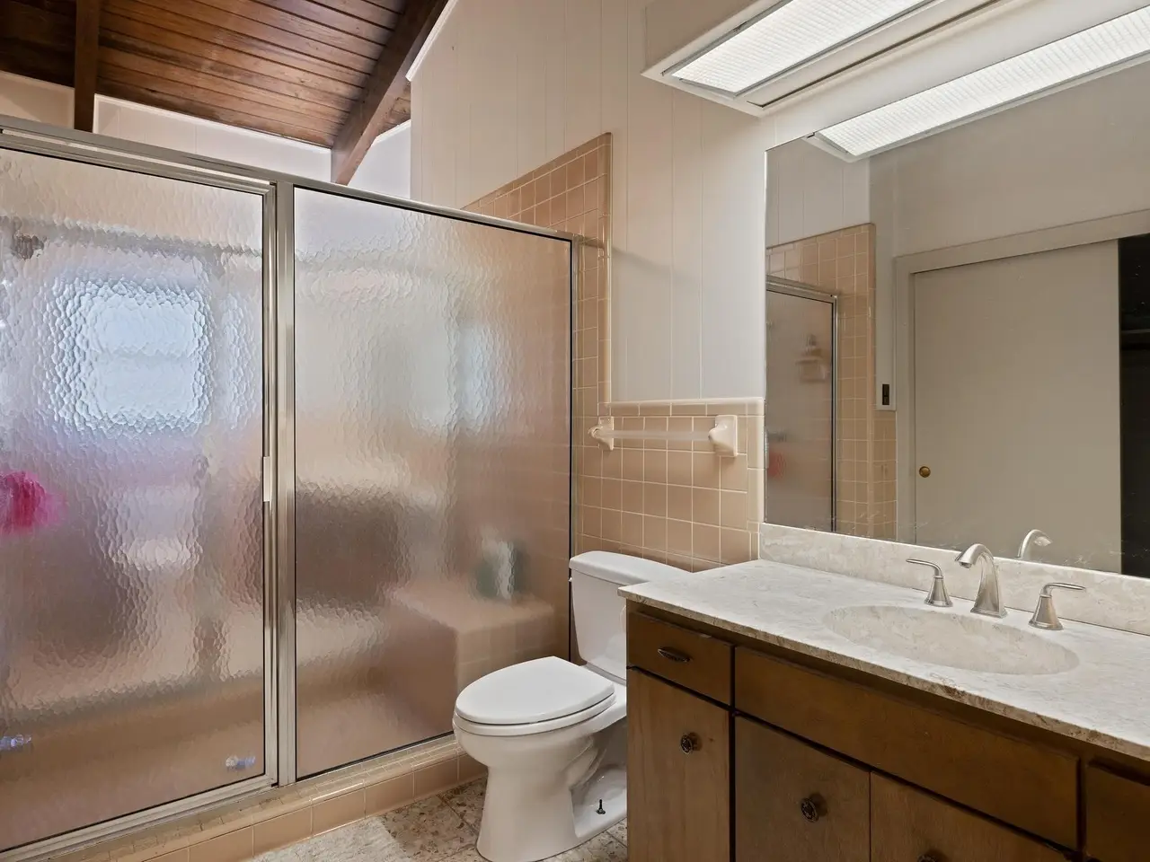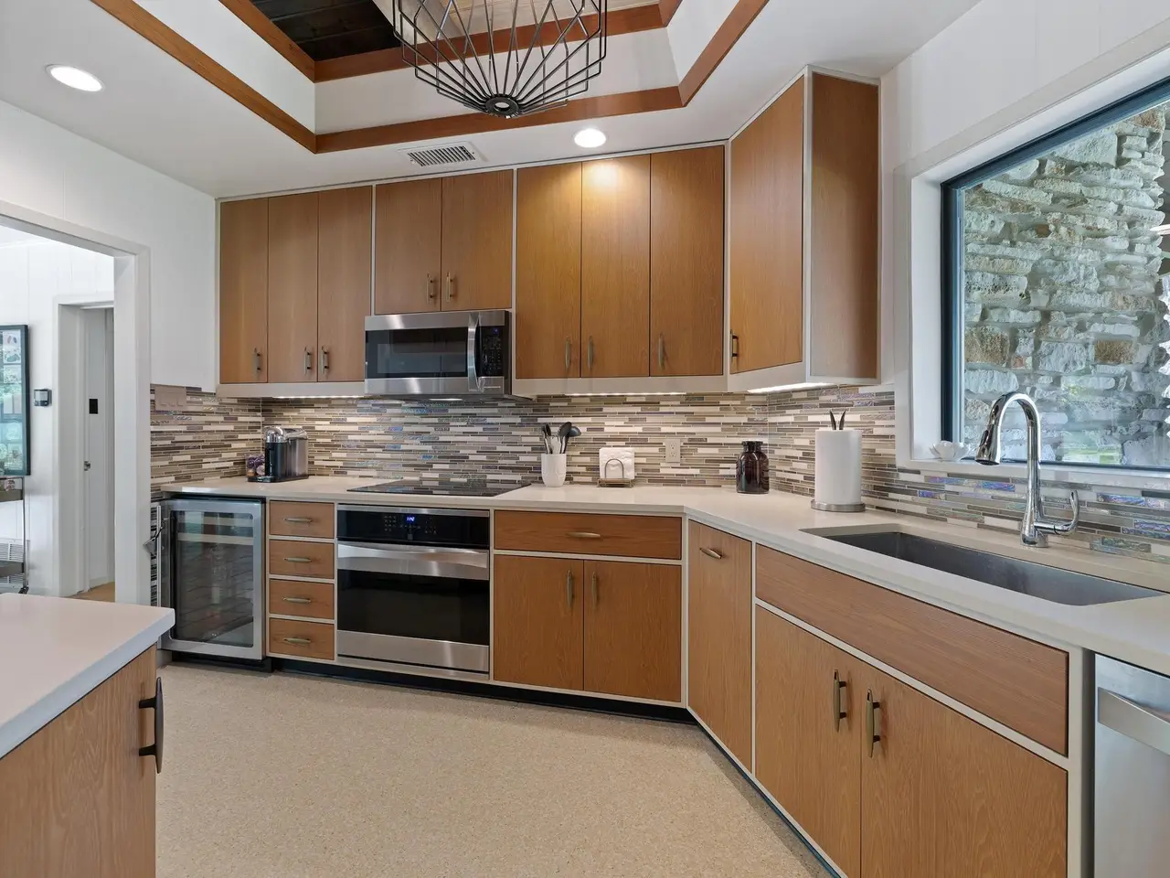 Warm teak cabinetry in updated kitchen