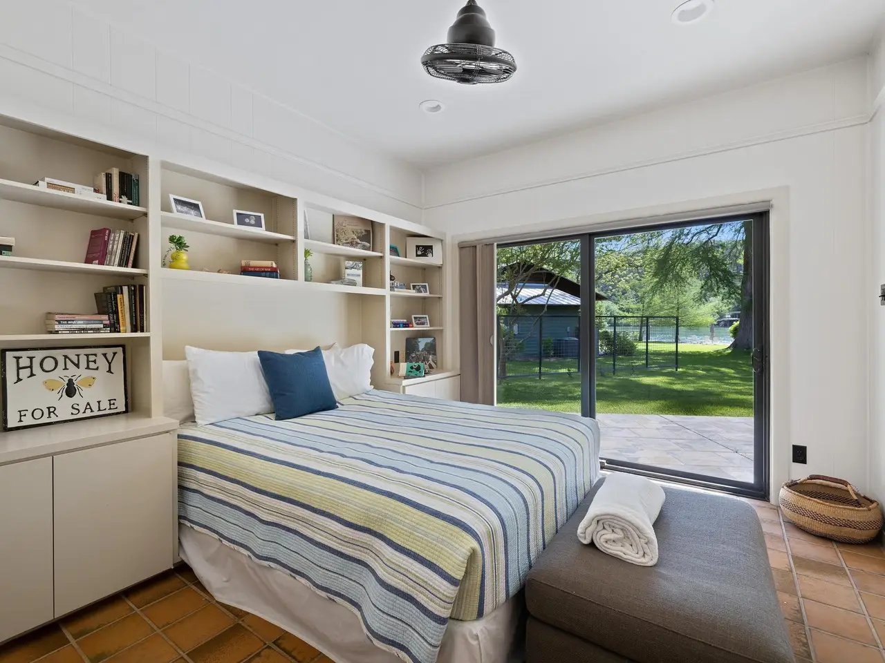 Set on one of the most iconic stretches of Lake Austin, 2401 Manana St. is a rare midcentury retreat that effortlessly balances architectural pedigree with laid-back Lake Austin living. Inspired by Frank Lloyd Wright's organic aesthetic, the rotunda-style home features dramatic yet welcoming vaulted ceilings, warm teak cabinetry in the updated kitchen, and sliding glass doors throughout the entire living and dining space that opens to the expansive, flat lawn. Shaded by a canopy of mature oak trees and two producing heritage pecan trees, the lawn leads you gently toward +/- 100' of private waterfront, where iconic oak trees frame the view. The calm waters here are ideal for water skiing, wakeboarding, and wake surfing--one of the best stretches on the lake for smooth conditions. The main house includes three bedrooms and two full bathrooms, while a detached two-car garage and guest suite offers its own living space, bedroom, and bathroom. On the water, a rare, grandfathered boathouse includes a full bathroom and lounge outfitted with a kitchenette, and the recently updated two-story boat dock features ipe decking, a hydraulic boat lift, touchless boat cover, shaded lounging and sunbathing areas, and even a jump gate into the lake. The property also boasts a full-yard sprinkler system and an updated water purification system. Located on a coveted neighborhood street, this home is within walking distance of Ski Shores Café (but just far enough to avoid the crowds), close to the natural beauty of Emma Long Park and all its recreational offerings, and benefits from a private neighborhood fireworks show on the Fourth of July. Tax and assessed values are estimates for illustration purposes only. All figures should be independently verified.