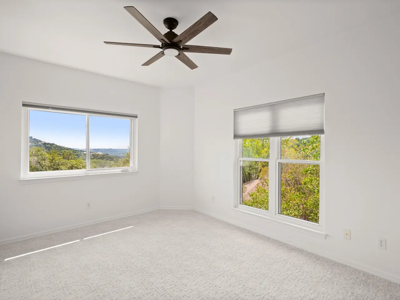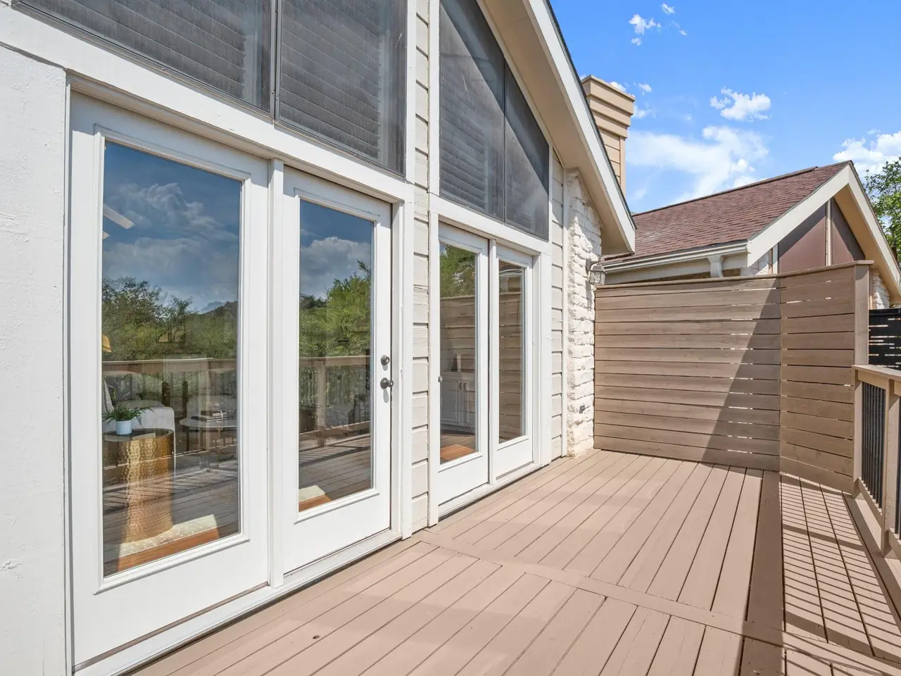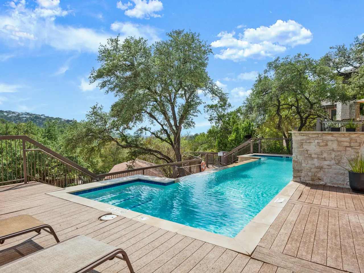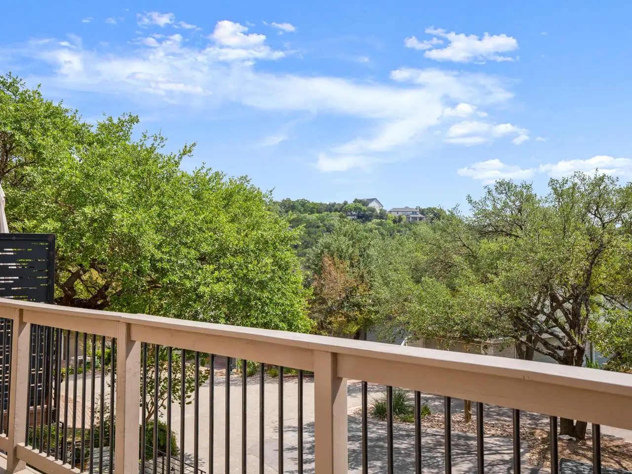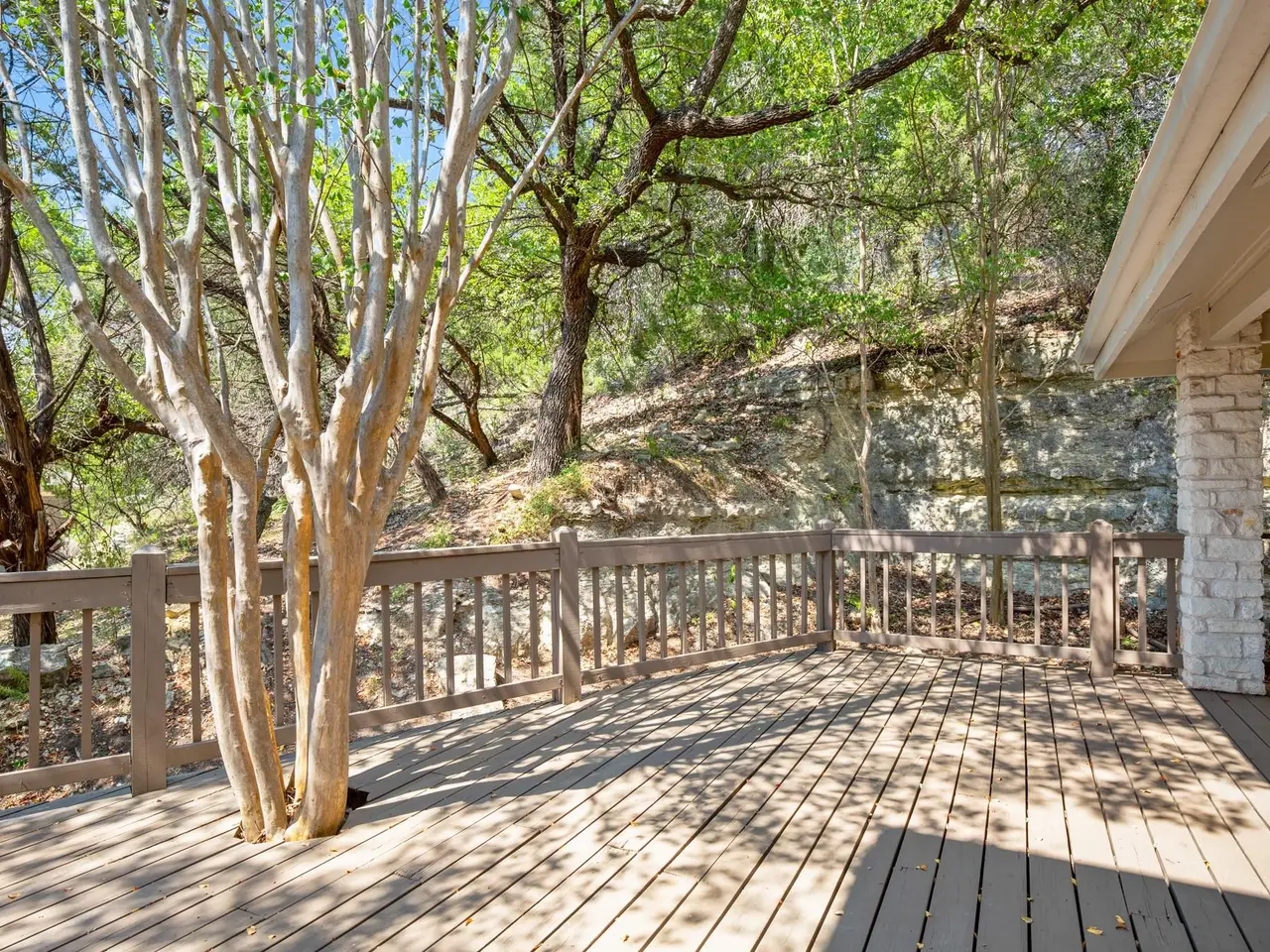 Tucked away in the hills of Cat Mountain, this spacious lock-and-leave residence offers easy living for the person on the move. Freshly painted throughout along with new carpet, guests are greeted with vaulted ceilings, hardwood floors, stone fireplace and a host bar ... making entertaining effortless. The updated kitchen is a culinary delight, equipped with stainless steel appliances and Silestone countertops, offering treetop views and easy access to the patio. The first floor features a private living quarters with a separate outdoor entrance, creating a versatile space perfect for a home office, studio, gym, guest suite, or private apartment, complete with a living area, bedroom and full bath - ideal as a potential ADU. This tranquil retreat showcases a new roof and is energy efficient with solar panels that will lower utility costs. Located in the desirable Northwest Hills and zoned for Doss Elementary, Murchison Middle, and Anderson High School, this home also provides convenient access to downtown Austin, The Domain, and top-rated shopping and dining. This property offers a community pool and an unbeatable combination of location, comfort and low-maintenance living while enjoying the beauty of the Texas Hill Country.