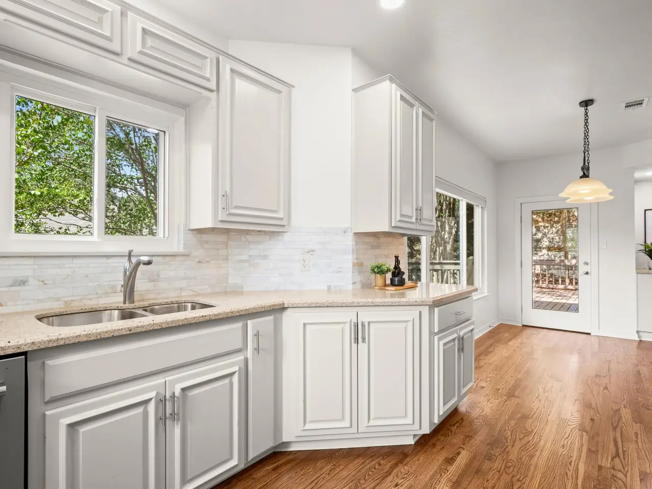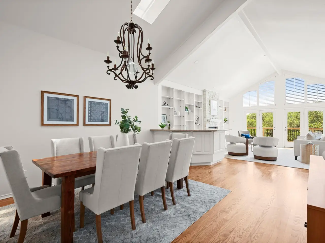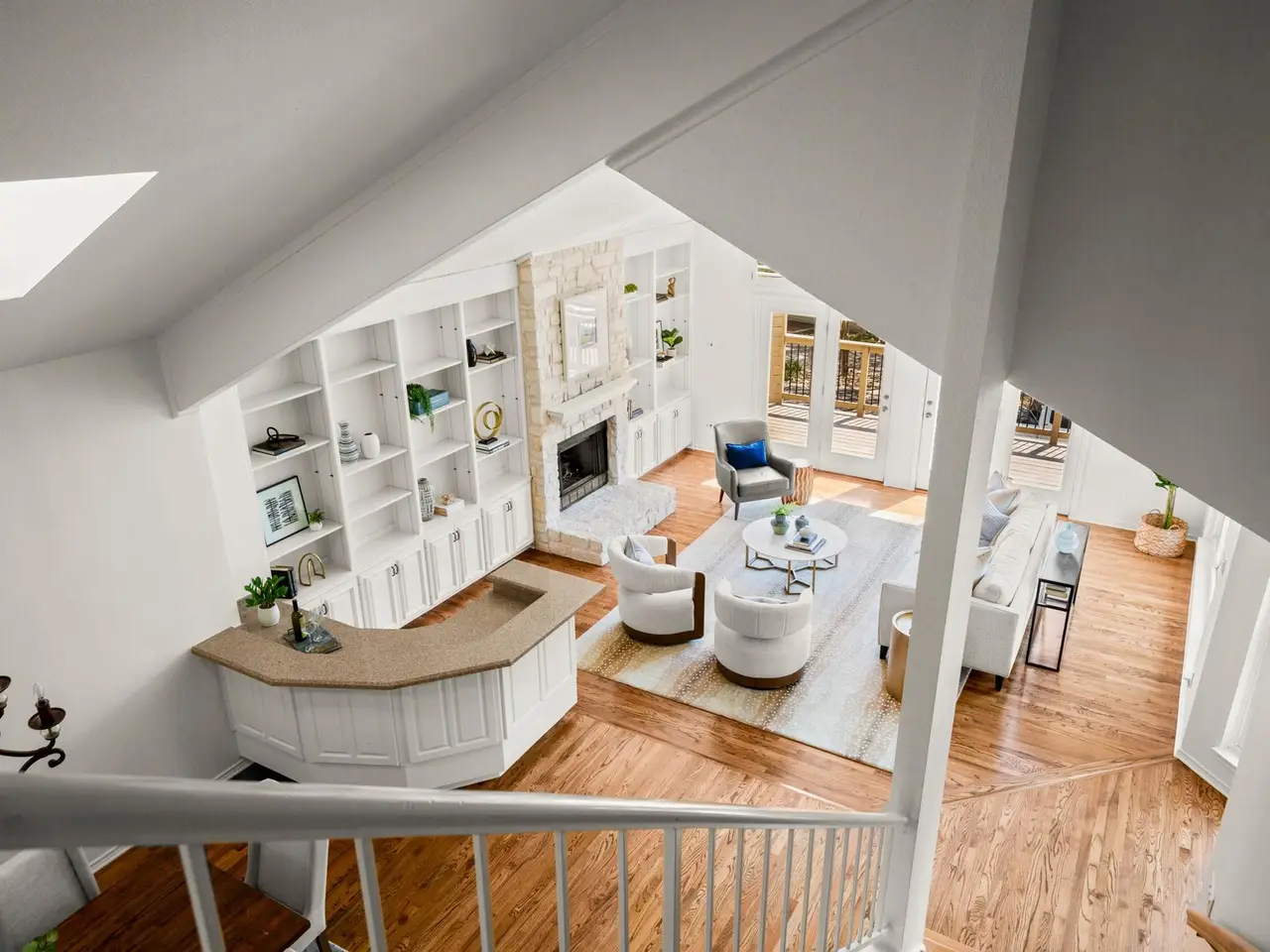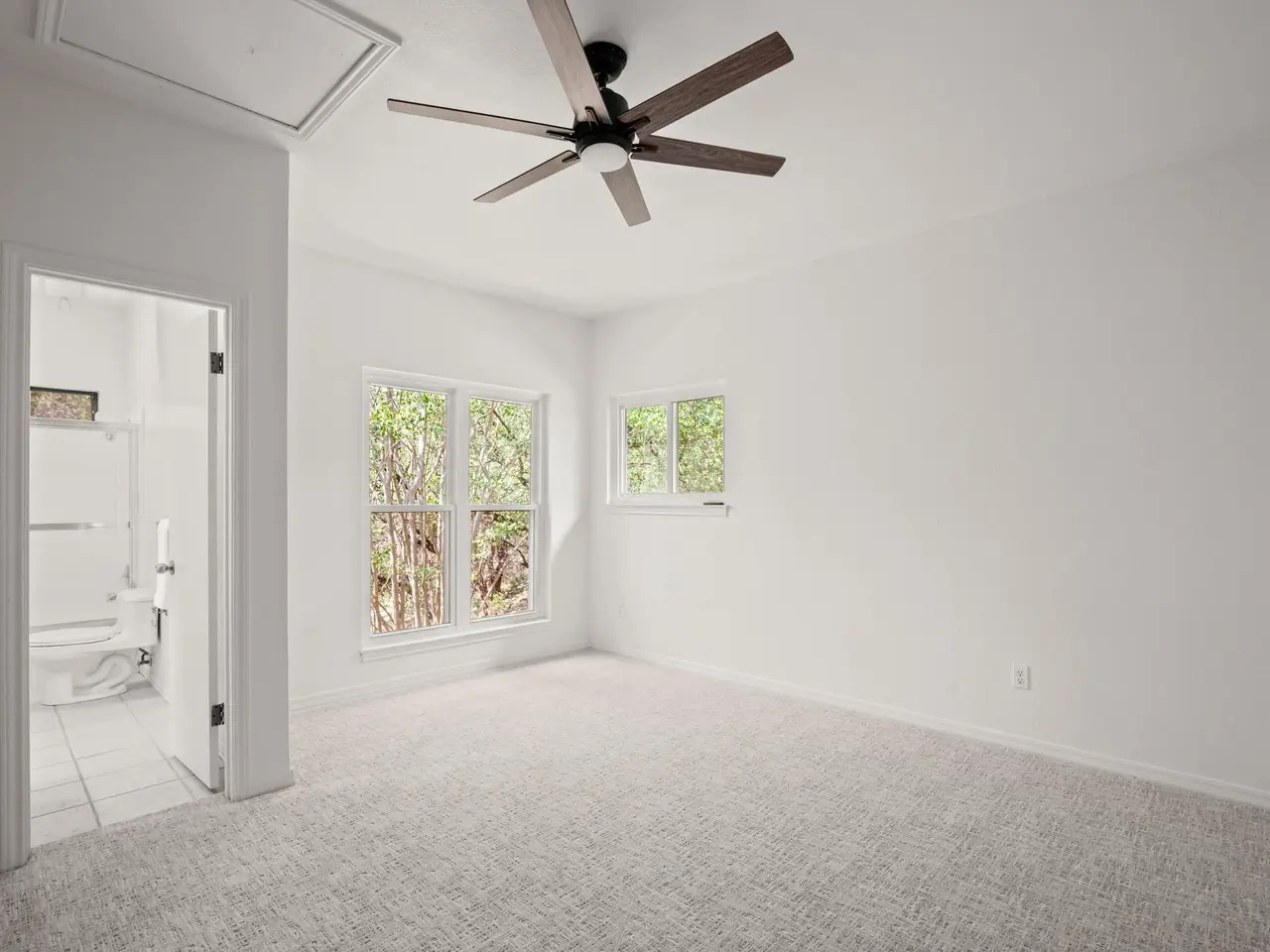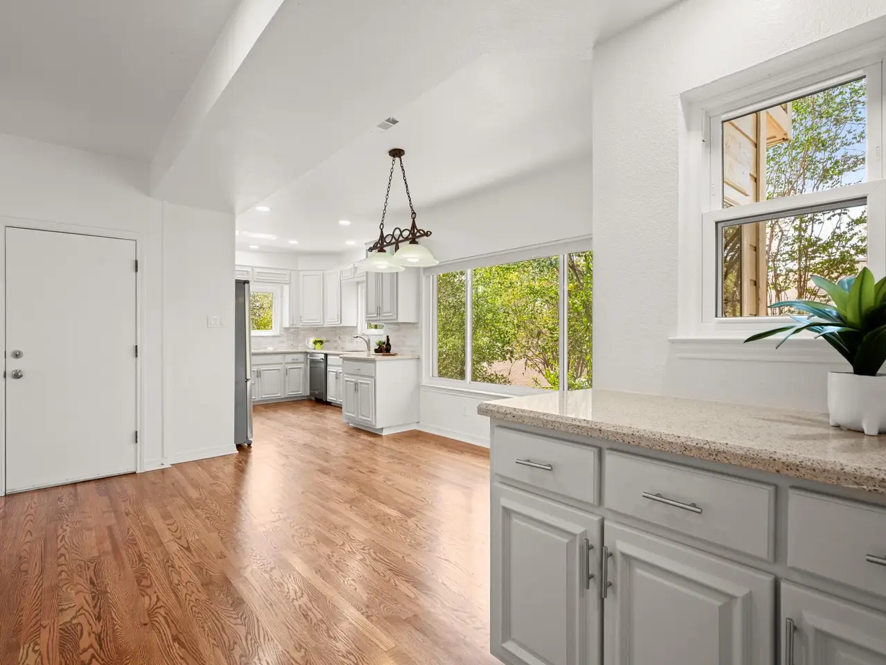 Tucked away in the hills of Cat Mountain, this spacious lock-and-leave residence offers easy living for the person on the move. Freshly painted throughout along with new carpet, guests are greeted with vaulted ceilings, hardwood floors, stone fireplace and a host bar ... making entertaining effortless. The updated kitchen is a culinary delight, equipped with stainless steel appliances and Silestone countertops, offering treetop views and easy access to the patio. The first floor features a private living quarters with a separate outdoor entrance, creating a versatile space perfect for a home office, studio, gym, guest suite, or private apartment, complete with a living area, bedroom and full bath - ideal as a potential ADU. This tranquil retreat showcases a new roof and is energy efficient with solar panels that will lower utility costs. Located in the desirable Northwest Hills and zoned for Doss Elementary, Murchison Middle, and Anderson High School, this home also provides convenient access to downtown Austin, The Domain, and top-rated shopping and dining. This property offers a community pool and an unbeatable combination of location, comfort and low-maintenance living while enjoying the beauty of the Texas Hill Country.
