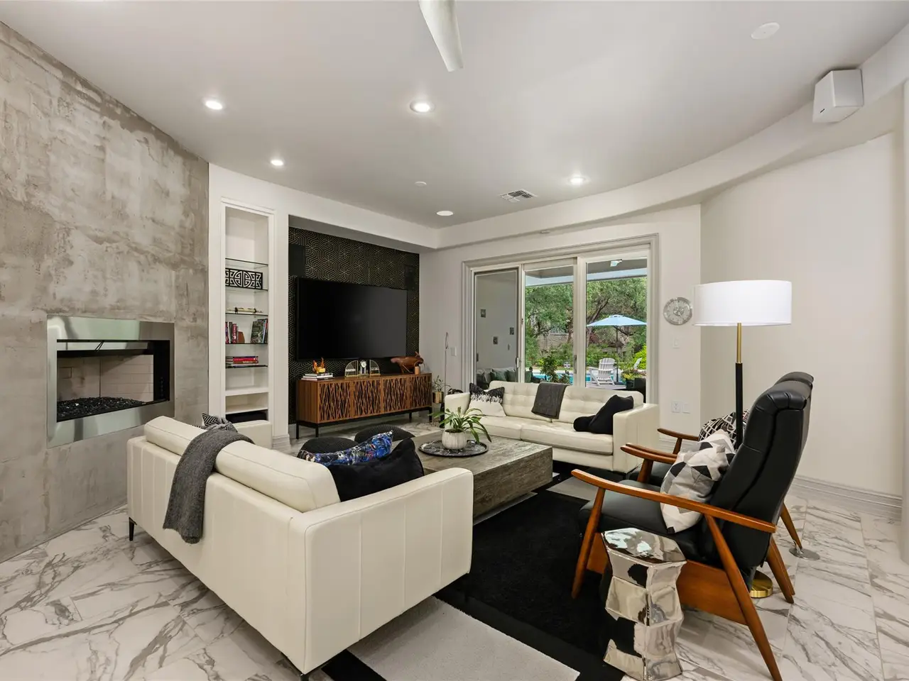 Fireplace in the living room Spa-inspired primary bathroom with indoor therapy pool