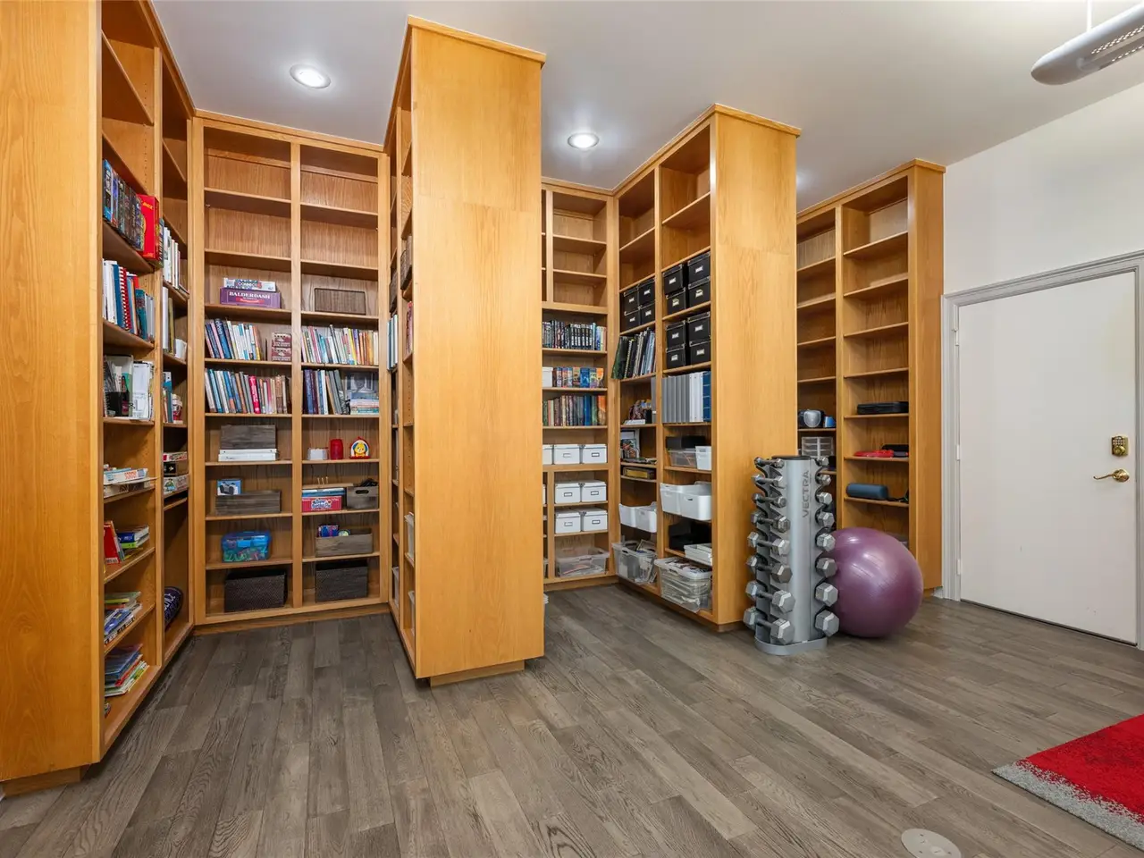 Expansive media room with floor-to-ceiling bookshelves Pre-wired sound system