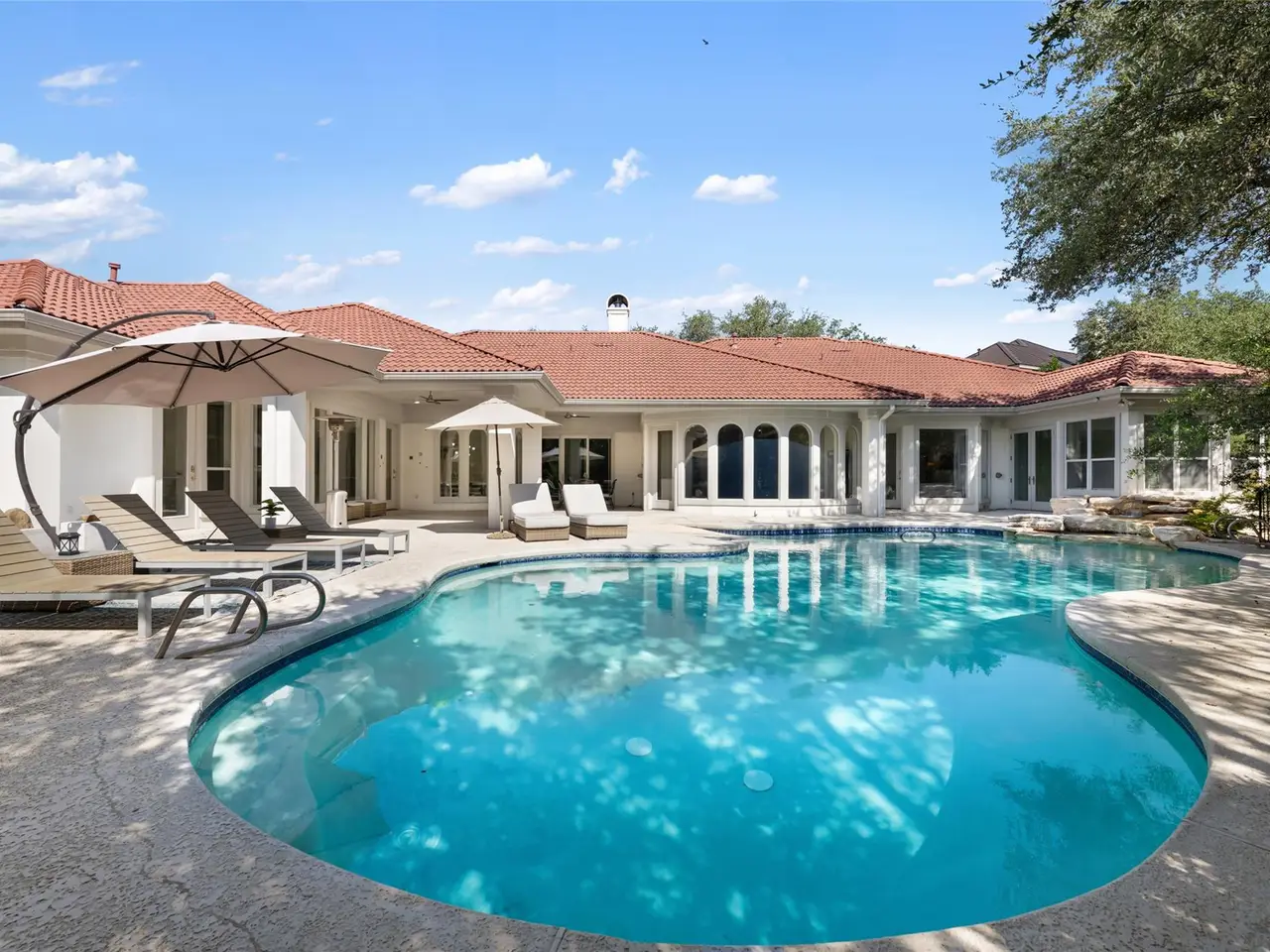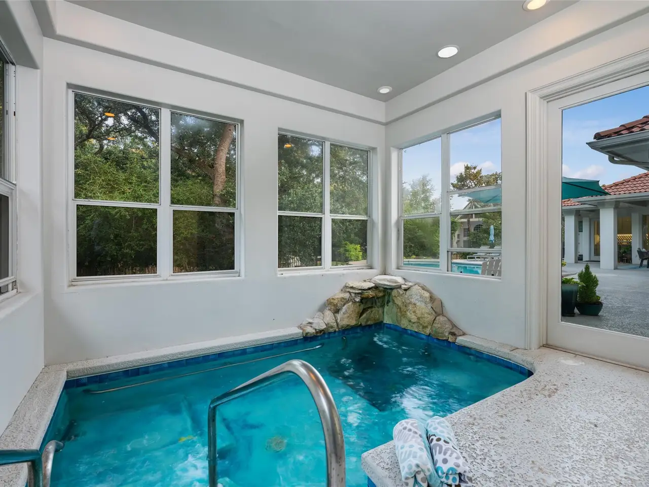 Spanish-style architecture meets contemporary luxury at this 4-bedroom, 3.5-bathroom home nestled in a quiet cul-de-sac. The beautifully curated interiors impress the moment you enter the residence, with gorgeous tile floors and a double-height rotunda. The resort-style pool is the home's focal point, with ample windows that invite picturesque views of the backyard inside. Enjoy the open-concept floor plan across multiple living and dining areas, including a living room with a fireplace, formal dining, a rounded breakfast nook, and a family room. The kitchen is outfitted with high-end stainless steel appliances by Viking, bar seating, a coffee bar, and a center island. The expansive media room boasts floor-to-ceiling bookshelves for your personal library, as well as stunning arched windows that provide the space with abundant natural light. Escape to luxury in the primary suite with backyard access and a spa-inspired bathroom with a soaking tub, heated floors, a walk-in shower, dual vanities, a walk-in closet, and a highly desirable indoor therapy pool. Guests will enjoy spacious bedrooms and upgraded bathrooms, including a second primary en-suite with a soaking tub, walk-in shower, and heated floors. In the backyard, tranquility and relaxation abound, with a resort-style pool and waterfall. Dine al fresco on the covered patio with a view of the landscaped backyard. The home has a pre-wired sound system, allowing you to easily connect your devices. A 3-car garage with a workshop and an EV charging station provides additional storage. The home is part of The Courtyard community, which offers access to a private park on Bull Creek featuring trails, playgrounds, and a dock for canoeing, kayaking, and other recreational activities, as well as access to Lake Austin. This home has perfected single-story living in a coveted Austin neighborhood. Tax and assessed values are estimates for illustration purposes only. All figures should be independently verified.