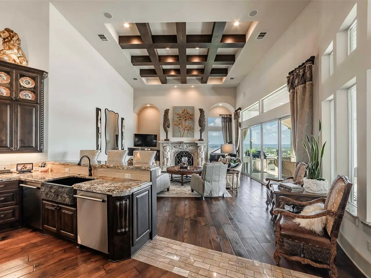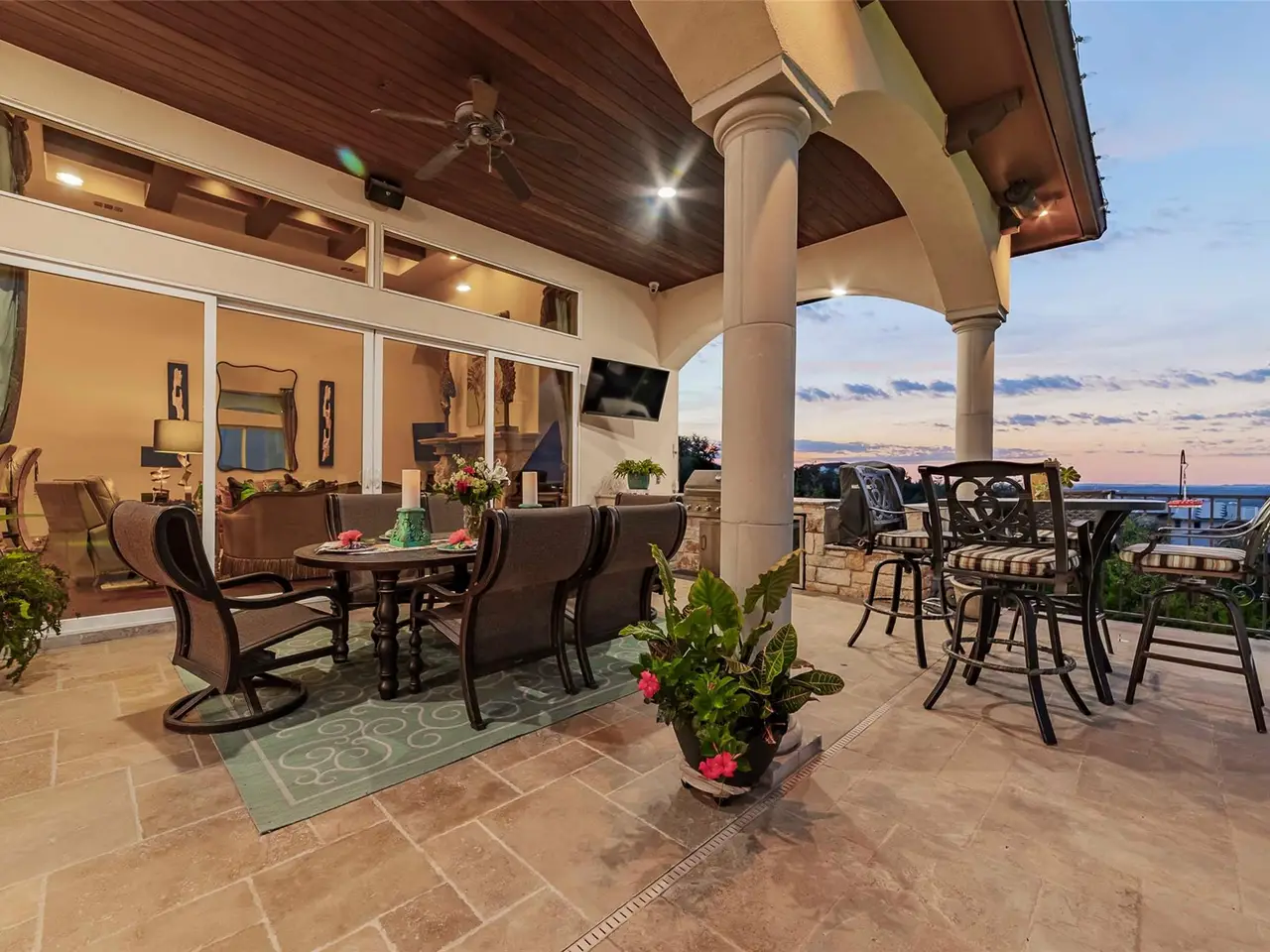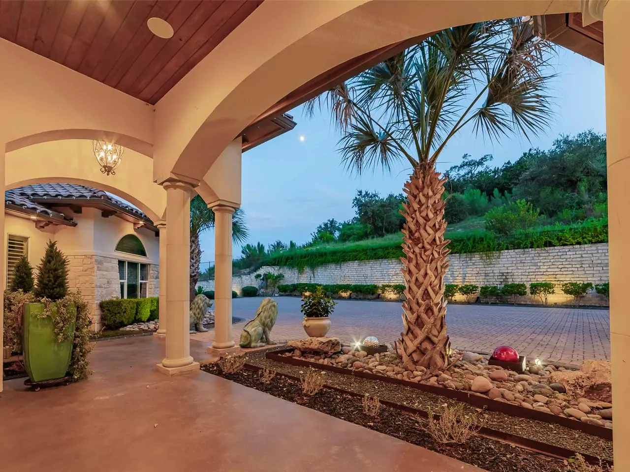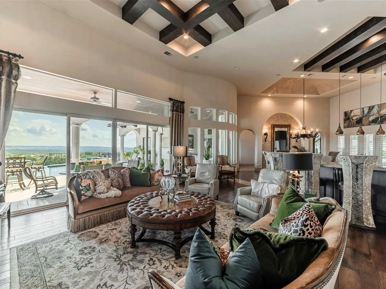 The crown jewel of Bella Montagna, where every arrival feels like a grand entrance. Perched on the premier hilltop with commanding presence and visibility, this estate makes a statement from the moment you arrive. A gated drive leads to an expansive motor court with parking for 15+ vehicles, setting the stage for grand scale living and entertaining. Texas limestone, tile roof, and double Cantera iron doors open to a hand-painted barrel ceiling entry framing sweeping Lake Travis and Hill Country views. Inside, soaring ceilings and custom artistry abound--wood beams, floating and hand-painted ceilings, and layered details throughout. Designed to live like a single story, all four bedrooms offer en-suite baths and walk-in closets, with an upstairs wing providing two additional bedrooms, a living area, and its own HVAC zone. The open kitchen, dining, and family areas center around a massive double-ogee granite island, with chef's amenities including double dishwashers, pot filler, six-burner cooktop with griddle, convection/steam ovens, warming drawer, built-in refrigerator, walk-in pantry, copper prep sink, and extensive cabinetry. A Cantera-door wine room with refrigerator and bar completes the space. The owner's retreat opens to ±1,000 sf of covered outdoor living with summer kitchen, hot tub, and resort-style pool -- perfectly oriented for year-round breezes. The suite also features an exercise alcove with views, a custom stone bathtub, and a triple-sized custom closet. Additional highlights include 3 oversized garage bays with storage and attic, granite windowsills, custom carved stone fireplace, plantation shutters, meticulous landscaping across 1.3 acres, and a low tax rate and HOA. Every room enjoys a view, every detail elevates the experience--an extraordinary chance to own the most visible and celebrated hilltop estate in Lakeway's prestigious Bella Montagna.