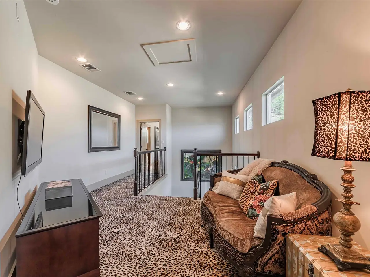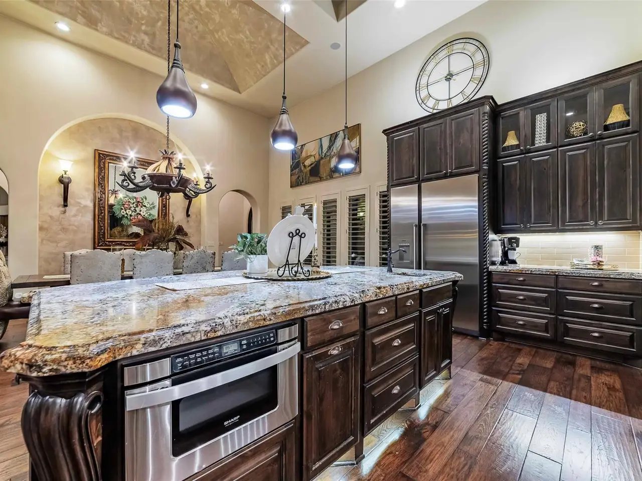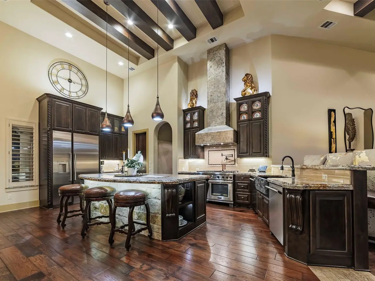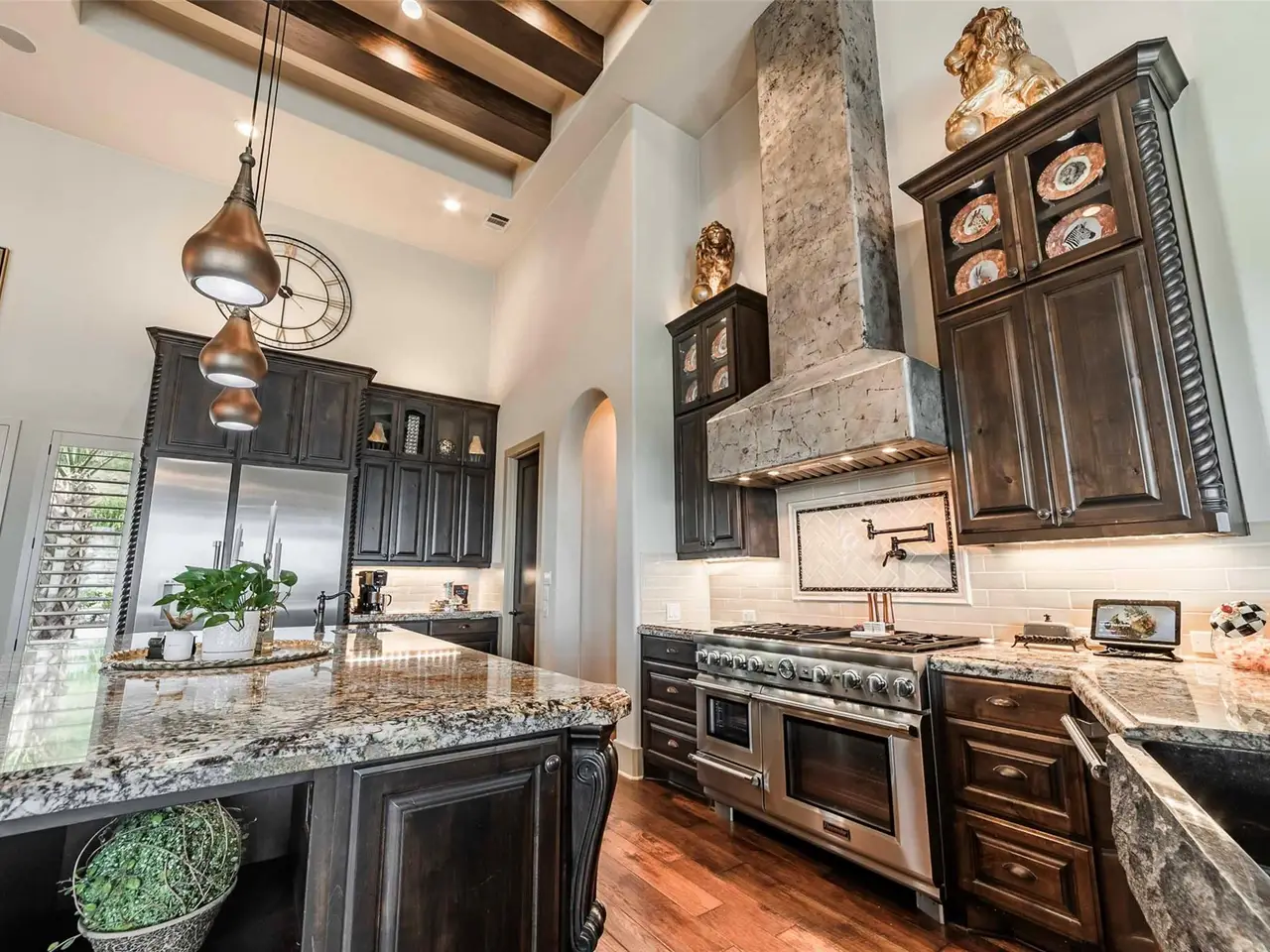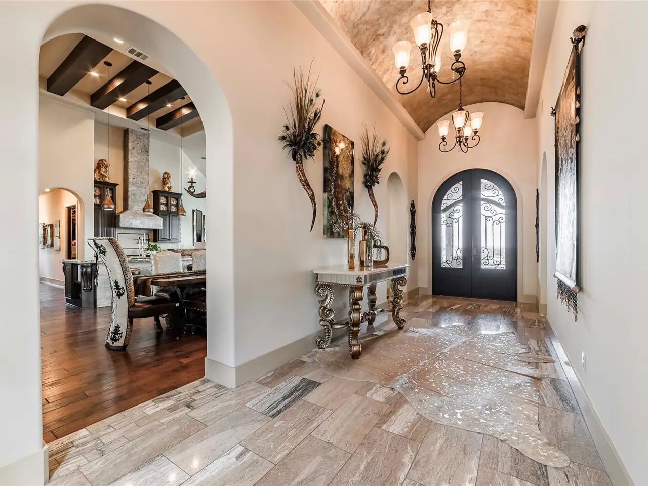 The crown jewel of Bella Montagna, where every arrival feels like a grand entrance. Perched on the premier hilltop with commanding presence and visibility, this estate makes a statement from the moment you arrive. A gated drive leads to an expansive motor court with parking for 15+ vehicles, setting the stage for grand scale living and entertaining. Texas limestone, tile roof, and double Cantera iron doors open to a hand-painted barrel ceiling entry framing sweeping Lake Travis and Hill Country views. Inside, soaring ceilings and custom artistry abound--wood beams, floating and hand-painted ceilings, and layered details throughout. Designed to live like a single story, all four bedrooms offer en-suite baths and walk-in closets, with an upstairs wing providing two additional bedrooms, a living area, and its own HVAC zone. The open kitchen, dining, and family areas center around a massive double-ogee granite island, with chef's amenities including double dishwashers, pot filler, six-burner cooktop with griddle, convection/steam ovens, warming drawer, built-in refrigerator, walk-in pantry, copper prep sink, and extensive cabinetry. A Cantera-door wine room with refrigerator and bar completes the space. The owner's retreat opens to ±1,000 sf of covered outdoor living with summer kitchen, hot tub, and resort-style pool -- perfectly oriented for year-round breezes. The suite also features an exercise alcove with views, a custom stone bathtub, and a triple-sized custom closet. Additional highlights include 3 oversized garage bays with storage and attic, granite windowsills, custom carved stone fireplace, plantation shutters, meticulous landscaping across 1.3 acres, and a low tax rate and HOA. Every room enjoys a view, every detail elevates the experience--an extraordinary chance to own the most visible and celebrated hilltop estate in Lakeway's prestigious Bella Montagna.