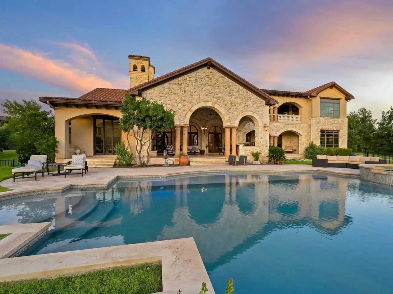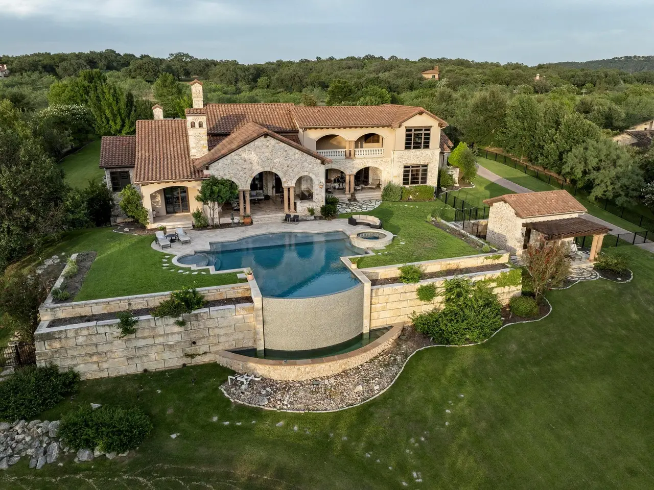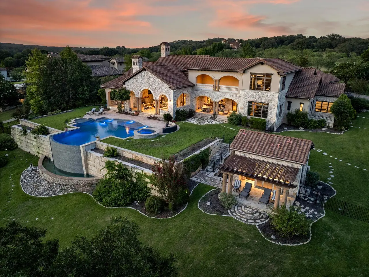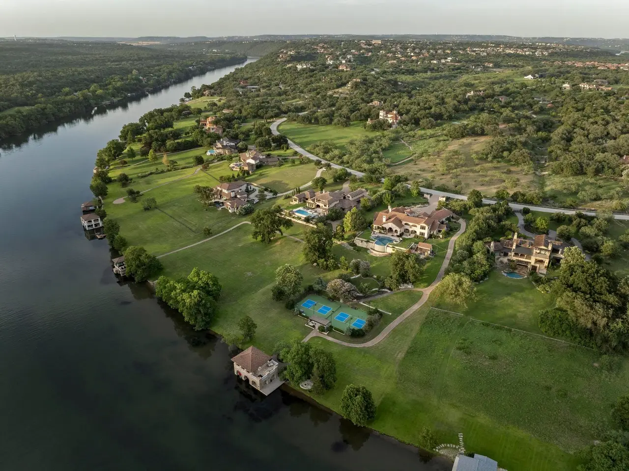 Villa Caslano is a breathtaking Lake Austin estate offering +/- 280' feet of pristine shoreline, directly across from the protected Balcones Nature Preserve. Set behind private gates, this expansive property blends timeless European elegance with resort-style amenities. The grand great room features 30-foot vaulted ceilings and flows into a chef's kitchen outfitted with two Sub-Zero refrigerators, Wolf double ovens, a six-burner gas cooktop with griddle, and dual Miele dishwashers. Rich materials and artisan craftsmanship are found throughout--from hand-carved stone archways and wood beams to custom glass globes and ironwork. Additional highlights include a temperature-controlled wine room for over 200 bottles, a stunning home theater (with blackout shades and lake views), and a luxurious office with private study. Designed for effortless indoor-outdoor living, the home's covered loggia features a full outdoor kitchen and fireplace overlooking the infinity pool, pool house, and full-size lighted tennis court. The two-story boat dock includes two boat slips and a fully integrated outdoor living space with a sun deck, kitchen, and audio/visual system--ideal for entertaining. A mosquito control system, private well, and Italian marble fountain elevate the estate's luxurious lifestyle. The primary suite is a true sanctuary with a domed entry and one of the most spectacular closets in Austin--complete with floor-to-ceiling shoe racks, a sliding ladder, and its own laundry and beverage station. The spa-like bathroom features a Bain Ultra soaking tub, dual rain and handheld shower heads, and six body sprayers. Ideally located just a golf cart ride from the world-class Lake Austin Spa and close to the UT Golf Club, this estate offers exceptional proximity to top-rated schools, restaurants, and retail in one of Austin's most coveted gated neighborhoods. Tax and assessed values are estimates for illustration purposes only. All figures should be independently verified.