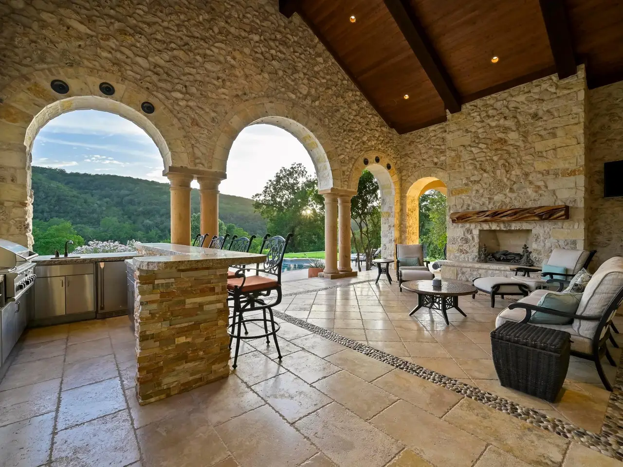 Full outdoor kitchen with fireplace