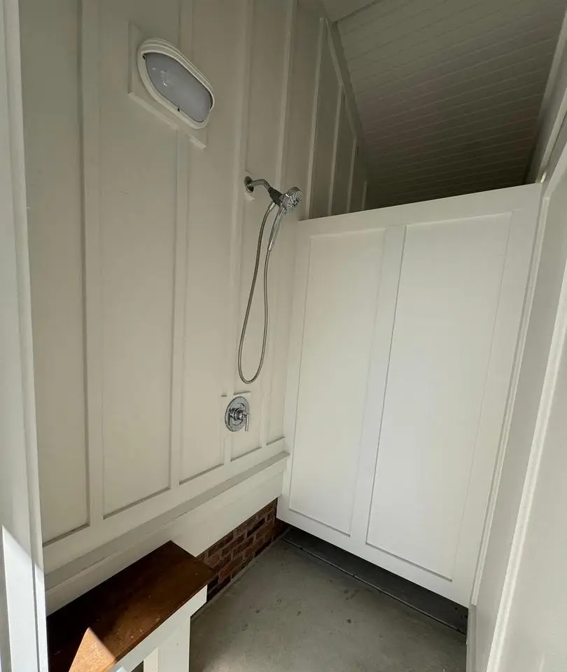 Two outdoor showers and backyard shed