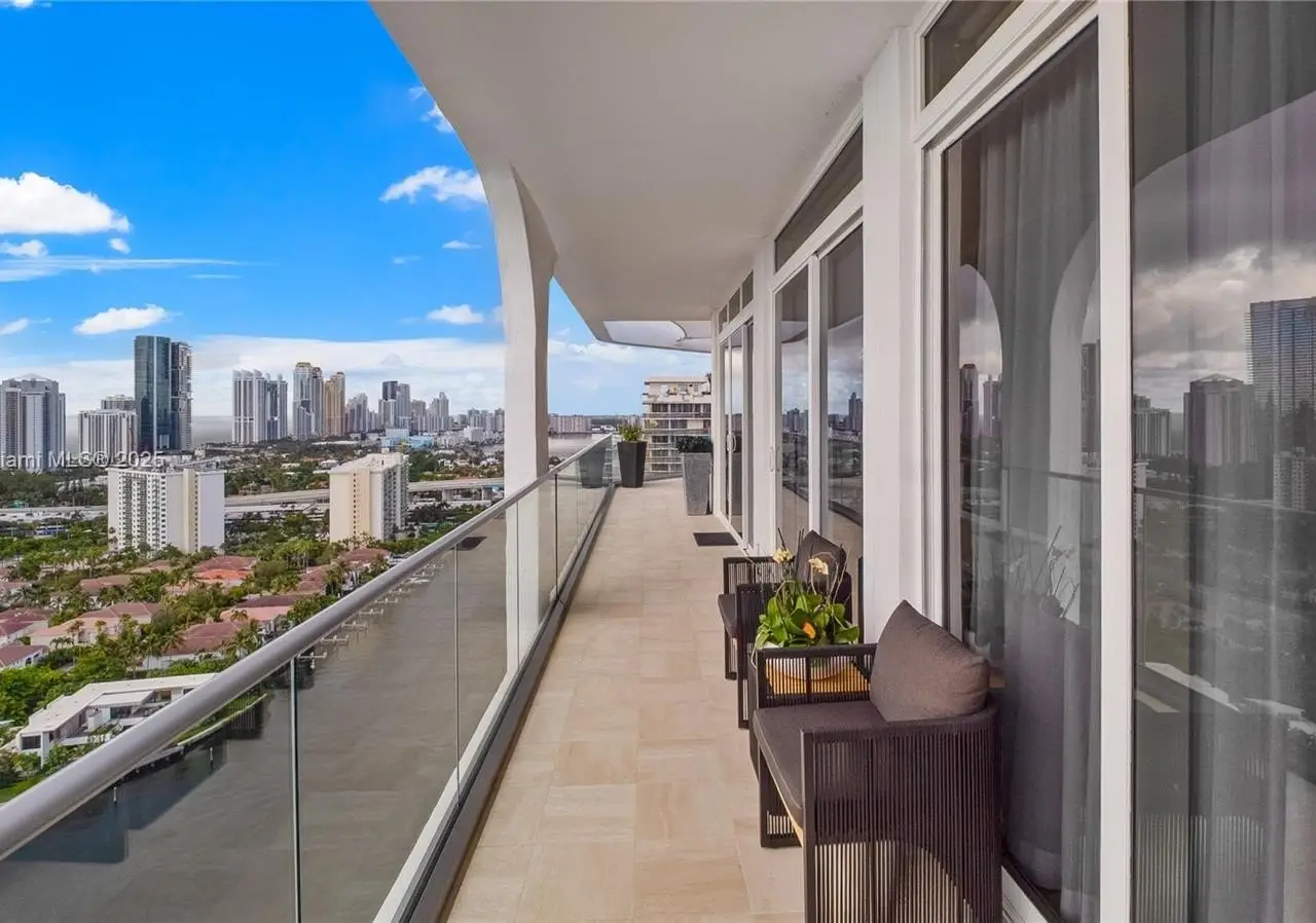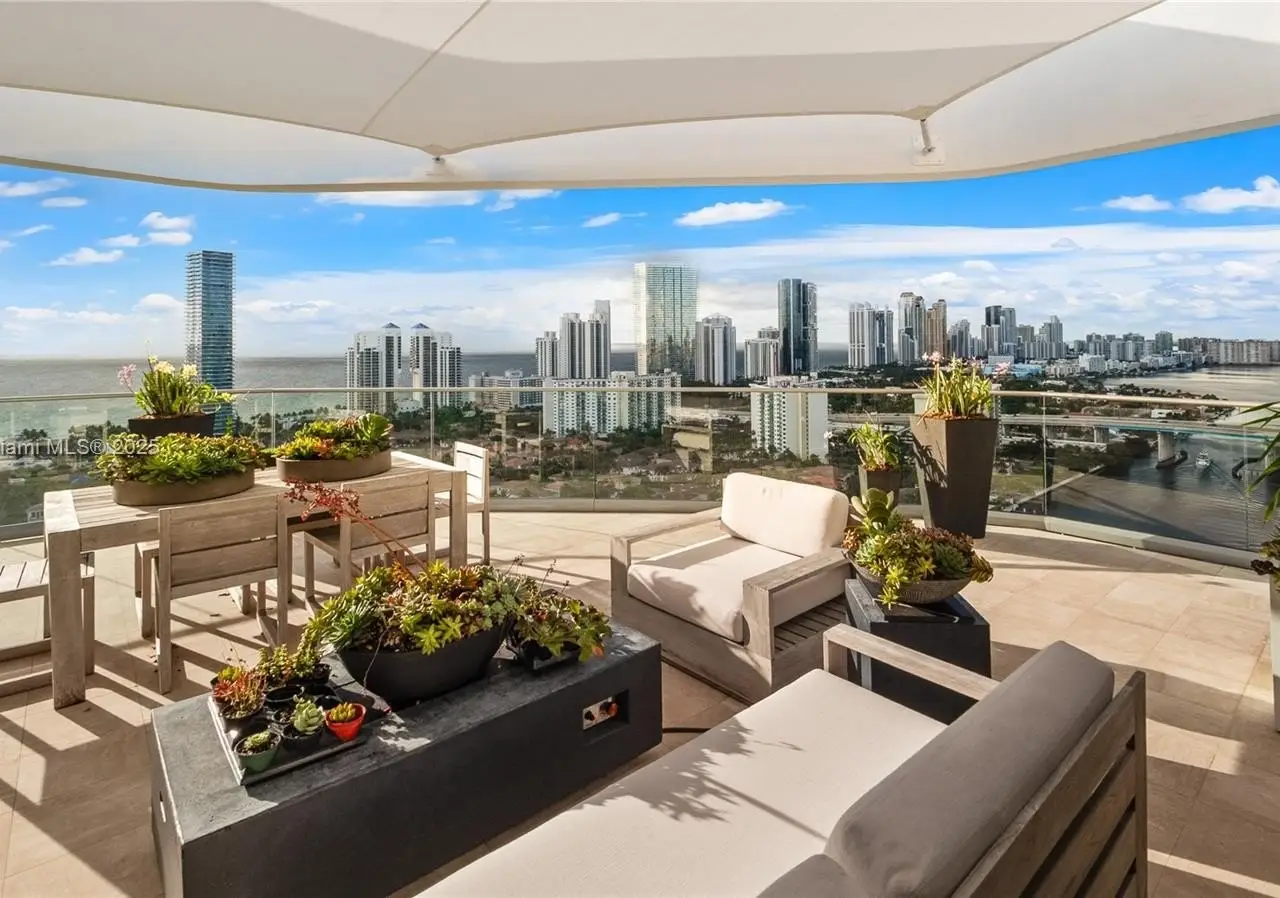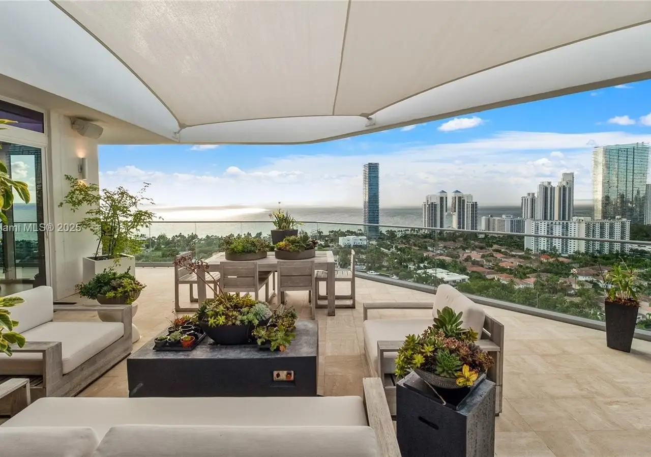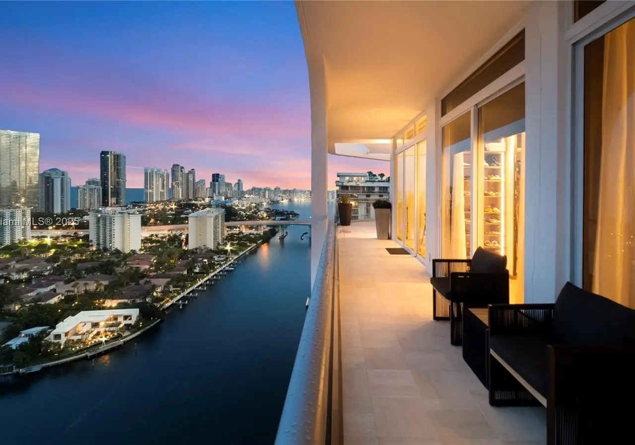 Experience luxury living in this exclusive penthouse with breathtaking direct ocean and Intracoastal views. Perfectly located near Aventura Mall, beaches, and fine dining, this 5-bedroom, 3.5-bath residence features two master suites, including a primary with a custom women's closet and a stunning Versace-tiled bath. The gourmet kitchen boasts Wolf and Sub-Zero appliances, Italian finishes, and Cristalito countertops with underlighting. Elegant interiors include custom cabinetry, a Versace-trimmed fireplace, Sonos audio, Lutron lighting, and remote blinds. A wraparound balcony invites outdoor dining and entertaining. Resort-style amenities include pool, valet, fitness center, restaurant, theatre, social room & marina. Fully funded reserves.