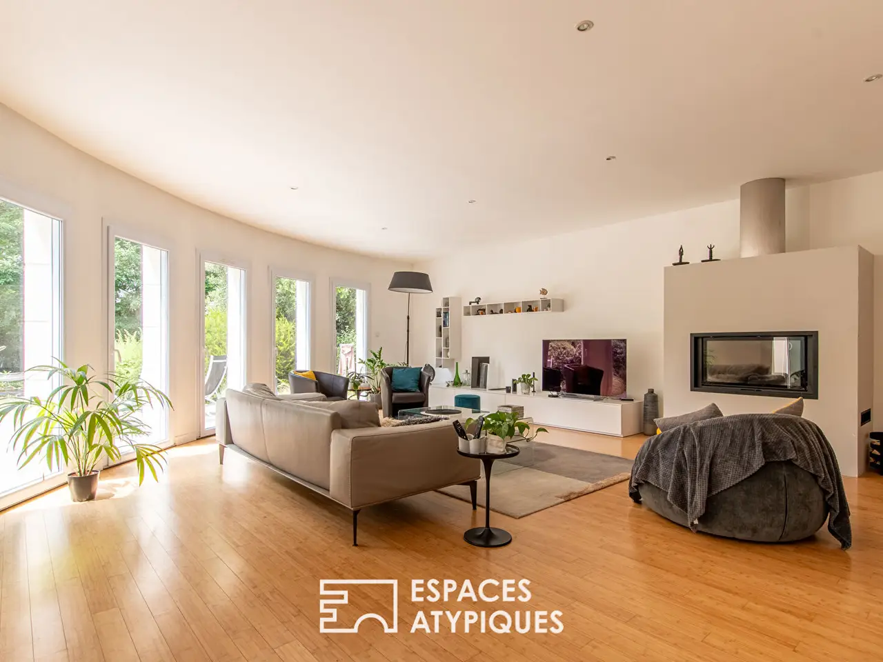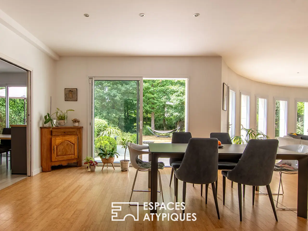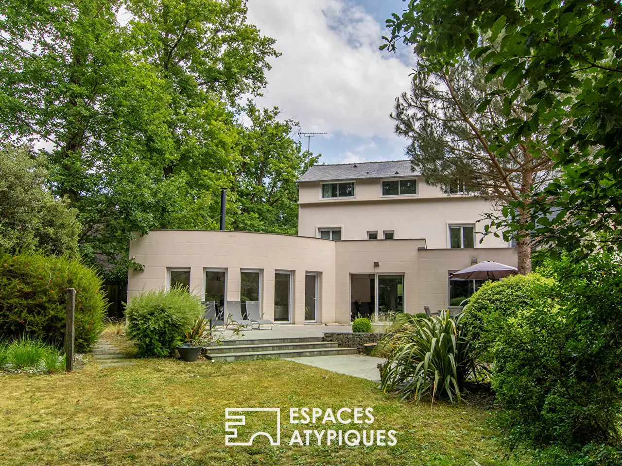 Located just minutes from Angers city center, in the private and verdant setting of Parc de la Haye, this house boasts a resolutely contemporary architecture spanning over 260 sqm.Nestled in the heart of a wooded environment overlooking the Saint-Nicolas pond, it seems to float between nature and modernity. Designed in perfect harmony with its landscaped setting, the house blends seamlessly into the decor.Upon entering, light floods in generously thanks to large bay windows. The view is immediately drawn to the open view of a lush, intimate, and wooded garden. The living room, a true central living space, elegantly unfolds its generous volumes and offers a soothing panorama of the surrounding vegetation. Here, nature literally penetrates the space. The ground floor, designed as a true living space, houses a kitchen with clean lines, extended by a scullery, a discreet linen room, and a pantry providing access to the garage. On this level, a first master bedroom with shower room completes the ensemble, in a logic of single-story living. A beautiful staircase leads to the two upper levels, where one discovers, on each floor, two large bedrooms, a vast bathroom, and a generous landing that can accommodate an office or a recreation room. The volumes are fluid, the circulations natural, always in the same spirit of openness and serenity. Every detail here has been carefully considered: understated materials, impeccable finishes, custom layouts. The whole exudes a rare atmosphere, a subtle alliance between architectural precision and plant-based calm.Less than 500 meters from amenities (transport, local shops) and 5 kilometers from the TGV station, this unique house offers a confidential lifestyle, between city and nature.REF. ARG4551Additional information* 7 rooms* 5 bedrooms* Floor : 2* 2 floors in the building* Outdoor space : 1107 SQM* Property tax : 4 369 €Energy Performance CertificateEPC : 93 kWhEP/m2.year* A 450GHG : 14 kgeqCO2/m2.year* A 80Agency feesThe fees include VAT and are payable by the vendorMediatorMediation Franchise-Consommateurswww.mediation-franchise.com29 Boulevard de Courcelles 75008 ParisInformation on the risks to which this property is exposed is available on the Geohazards website : www.georisques.gouv.fr