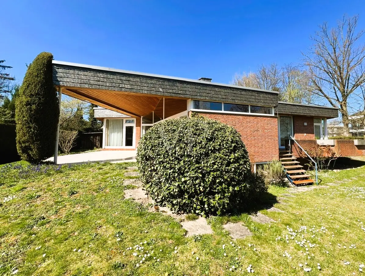Welcome to your new home! In one of the most sought-after locations in Bad Homburg, the picturesque Ellerhöhe, a unique architect's villa awaits you, which impresses with its sophisticated functionality and stylish design (similar to Bauhaus). The generously proportioned plot is located within walking distance of one of the city's most beautiful recreational areas, surrounded by extensive meadows and idyllic horse pastures. The city center, train station and spa gardens are just a few minutes' walk away, while schools and grammar schools are just a short bike ride away. Here you can enjoy the perfect combination of urban life and natural recreation! As you enter the house, you are greeted by a bright, inviting entrance area designed with elegant, light-colored natural stone. Practical, ceiling-high built-in units for your wardrobe ensure order and style. The hallway leads you into a functional kitchen, while the fantastic living and dining area forms the heart of the house. With ceilings opening up to the ridge, floor-to-ceiling windows offering views of the terrace and garden on all sides and a cozy fireplace area, a unique ambience is created. The living and dining areas flow seamlessly into one another and offer a wonderful view of the park-like garden - a little paradise for families. The spacious terrace invites you to enjoy the sun. The balcony in front of the bedrooms is like a box seat above the garden and forms a relaxing retreat. An outdoor seating area under a fruit tree in the lawn offers both sun and light shade! In the basement you will find a spacious, homely guest room and a bathroom, ideal for overnight guests. The house has a full basement and offers plenty of space for domestic uses, technology and heating (electric heating, underfloor heating), as a workshop, wine cellar or storage space - a particularly large room with natural light is ideal as a playroom, hobby room or fitness room. The property is in a very well-kept condition. Contemporary design options (built in 1971) would be ideal for restoring the villa to its former glory. You can bring in your own personal taste and realize your own ideas. Alternatively, a new development could also be considered. The legally valid development plan 102 1V indicates the following utilization: purely residential area, open construction with a maximum of two residential units, one full storey and roof, the floor area ratio is 0.2. This special real estate offer is aimed at families and couples who have a penchant for unusual design and appreciate functionality. Take advantage of this rare opportunity to be inspired by this magnificent villa on Ellerhöhe and discover your new home!
