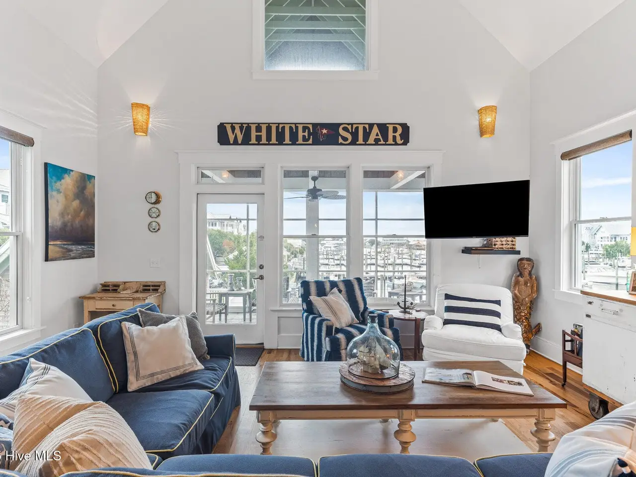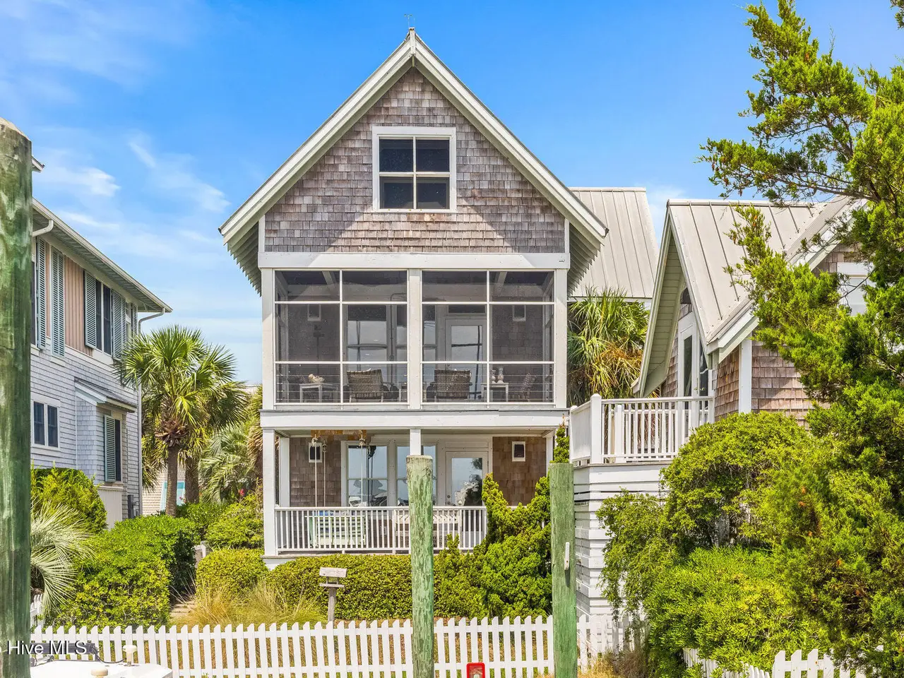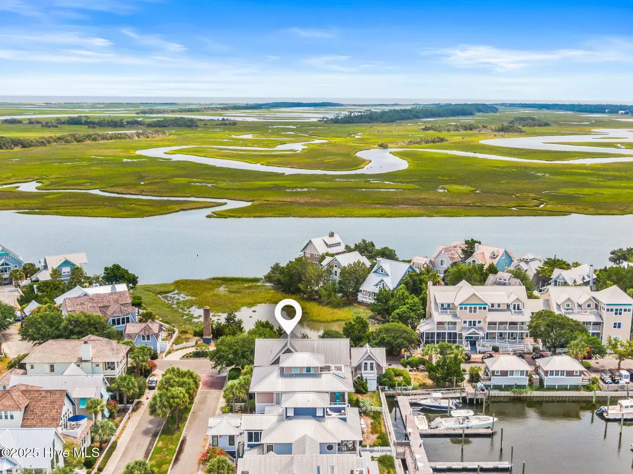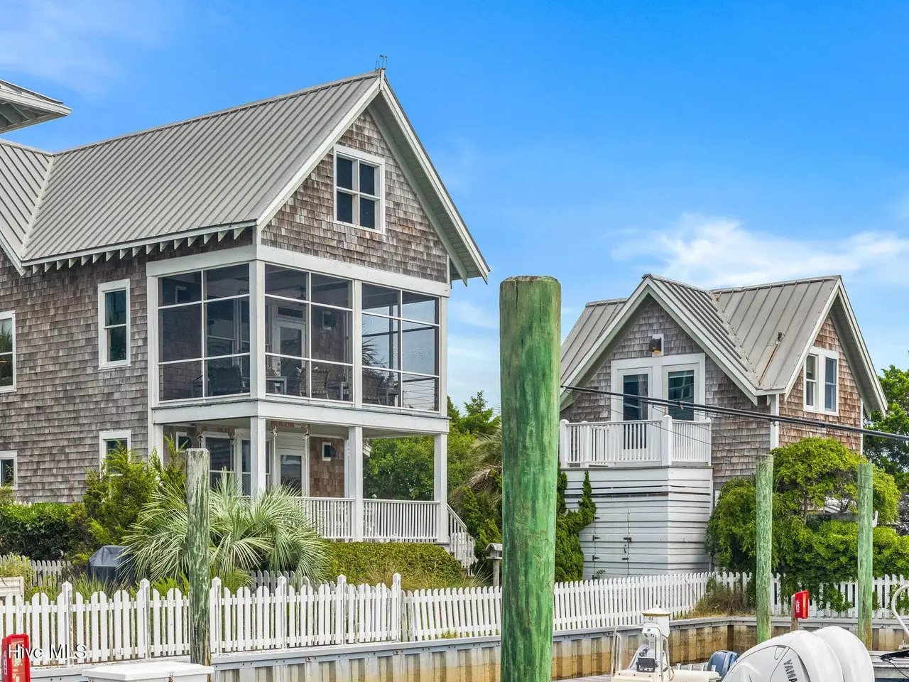 Coastal charm on one of the island's most iconic corners. At the meeting of Keelson Row and Transom Row, this Nantucket-style retreat offers front row views of the marina, sweeping saltwater marshes, and the daily rhythm of Bald Head Island. With 4 bedrooms and 4.5 baths total, the home spans just over 2,300 square feet and is designed for laid-back island living. The reverse floor plan makes the most of its elevated views. Upstairs, the vaulted living room opens to a screened porch where you can watch boats drift by and spot the beacon of Old Baldy. A renovated kitchen blends coastal character with modern function, creating a warm and welcoming flow throughout. On the main level, you will find two guest suites. One of which opens directly to a covered porch with a swinging bed that catches the breeze and invites long, lazy afternoons. Just outside, the wraparound front porch is lined with rocking chairs and offers a perfect perch to watch the island go by. A cozy fire pit patio just off the side adds one more spot to unwind. The top-floor primary suite is a true retreat with sweeping marsh views, a cozy reading nook, and a spacious walk-in shower. The crofter, accessed by a spiral staircase, offers two twin beds and a full bath for guests or flexible living space. Sold furnished and including two 4-passenger golf carts, this home offers a front porch lifestyle made for slow mornings, sunset views, and timeless island memories.